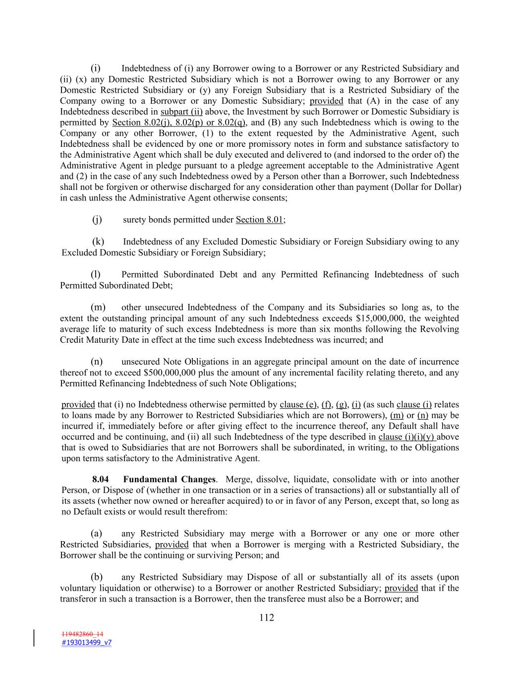 (i) Indebtedness of (i) any Borrower owing to a Borrower or any Restricted Subsidiary and (ii) (x) any Domestic Restricted Subsidiary which is not a Borrower owing to any Borrower or any Domestic Restricted Subsidiary or (y) any Foreign Subsidiary that is a Restricted Subsidiary of the Company owing to a Borrower or any Domestic Subsidiary; provided that (A) in the case of any Indebtedness described in subpart (ii) above, the Investment by such Borrower or Domestic Subsidiary is permitted by Section 8.02(j), 8.02(p) or 8.02(q), and (B) any such Indebtedness which is owing to the Company or any other Borrower, (1) to the extent requested by the Administrative Agent, such Indebtedness shall be evidenced by one or more promissory notes in form and substance satisfactory to the Administrative Agent which shall be duly executed and delivered to (and indorsed to the order of) the Administrative Agent in pledge pursuant to a pledge agreement acceptable to the Administrative Agent and (2) in the case of any such Indebtedness owed by a Person other than a Borrower, such Indebtedness shall not be forgiven or otherwise discharged for any consideration other than payment (Dollar for Dollar) in cash unless the Administrative Agent otherwise consents; (j) surety bonds permitted under Section 8.01; (k) Indebtedness of any Excluded Domestic Subsidiary or Foreign Subsidiary owing to any Excluded Domestic Subsidiary or Foreign Subsidiary; (l) Permitted Subordinated Debt and any Permitted Refinancing Indebtedness of such Permitted Subordinated Debt; (m) other unsecured Indebtedness of the Company and its Subsidiaries so long as, to the extent the outstanding principal amount of any such Indebtedness exceeds $15,000,000, the weighted average life to maturity of such excess Indebtedness is more than six months following the Revolving Credit Maturity Date in effect at the time such excess Indebtedness was incurred; and (n) unsecured Note Obligations in an aggregate principal amount on the date of incurrence thereof not to exceed $500,000,000 plus the amount of any incremental facility relating thereto, and any Permitted Refinancing Indebtedness of such Note Obligations; provided that (i) no Indebtedness otherwise permitted by clause (e), (f), (g), (i) (as such clause (i) relates to loans made by any Borrower to Restricted Subsidiaries which are not Borrowers), (m) or (n) may be incurred if, immediately before or after giving effect to the incurrence thereof, any Default shall have occurred and be continuing, and (ii) all such Indebtedness of the type described in clause (i)(i)(y) above that is owed to Subsidiaries that are not Borrowers shall be subordinated, in writing, to the Obligations upon terms satisfactory to the Administrative Agent. 8.04 Fundamental Changes. Merge, dissolve, liquidate, consolidate with or into another Person, or Dispose of (whether in one transaction or in a series of transactions) all or substantially all of its assets (whether now owned or hereafter acquired) to or in favor of any Person, except that, so long as no Default exists or would result therefrom: (a) any Restricted Subsidiary may merge with a Borrower or any one or more other Restricted Subsidiaries, provided that when a Borrower is merging with a Restricted Subsidiary, the Borrower shall be the continuing or surviving Person; and (b) any Restricted Subsidiary may Dispose of all or substantially all of its assets (upon voluntary liquidation or otherwise) to a Borrower or another Restricted Subsidiary; provided that if the transferor in such a transaction is a Borrower, then the transferee must also be a Borrower; and 112 119482860_14 #193013499_v7