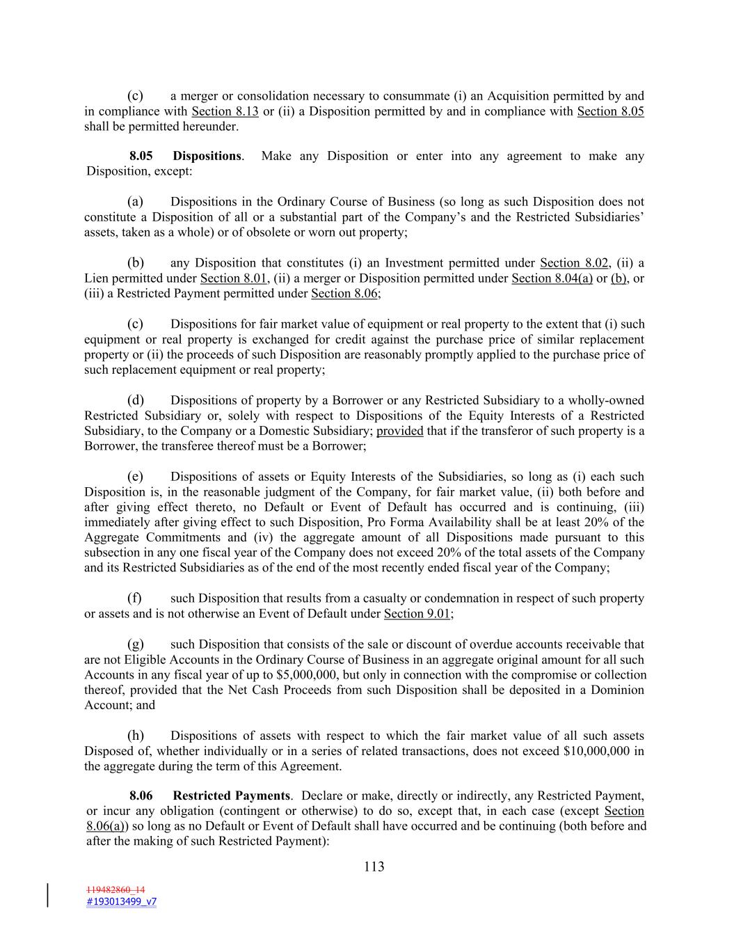(c) a merger or consolidation necessary to consummate (i) an Acquisition permitted by and in compliance with Section 8.13 or (ii) a Disposition permitted by and in compliance with Section 8.05 shall be permitted hereunder. 8.05 Dispositions. Make any Disposition or enter into any agreement to make any Disposition, except: (a) Dispositions in the Ordinary Course of Business (so long as such Disposition does not constitute a Disposition of all or a substantial part of the Company’s and the Restricted Subsidiaries’ assets, taken as a whole) or of obsolete or worn out property; (b) any Disposition that constitutes (i) an Investment permitted under Section 8.02, (ii) a Lien permitted under Section 8.01, (ii) a merger or Disposition permitted under Section 8.04(a) or (b), or (iii) a Restricted Payment permitted under Section 8.06; (c) Dispositions for fair market value of equipment or real property to the extent that (i) such equipment or real property is exchanged for credit against the purchase price of similar replacement property or (ii) the proceeds of such Disposition are reasonably promptly applied to the purchase price of such replacement equipment or real property; (d) Dispositions of property by a Borrower or any Restricted Subsidiary to a wholly-owned Restricted Subsidiary or, solely with respect to Dispositions of the Equity Interests of a Restricted Subsidiary, to the Company or a Domestic Subsidiary; provided that if the transferor of such property is a Borrower, the transferee thereof must be a Borrower; (e) Dispositions of assets or Equity Interests of the Subsidiaries, so long as (i) each such Disposition is, in the reasonable judgment of the Company, for fair market value, (ii) both before and after giving effect thereto, no Default or Event of Default has occurred and is continuing, (iii) immediately after giving effect to such Disposition, Pro Forma Availability shall be at least 20% of the Aggregate Commitments and (iv) the aggregate amount of all Dispositions made pursuant to this subsection in any one fiscal year of the Company does not exceed 20% of the total assets of the Company and its Restricted Subsidiaries as of the end of the most recently ended fiscal year of the Company; (f) such Disposition that results from a casualty or condemnation in respect of such property or assets and is not otherwise an Event of Default under Section 9.01; (g) such Disposition that consists of the sale or discount of overdue accounts receivable that are not Eligible Accounts in the Ordinary Course of Business in an aggregate original amount for all such Accounts in any fiscal year of up to $5,000,000, but only in connection with the compromise or collection thereof, provided that the Net Cash Proceeds from such Disposition shall be deposited in a Dominion Account; and (h) Dispositions of assets with respect to which the fair market value of all such assets Disposed of, whether individually or in a series of related transactions, does not exceed $10,000,000 in the aggregate during the term of this Agreement. 8.06 Restricted Payments. Declare or make, directly or indirectly, any Restricted Payment, or incur any obligation (contingent or otherwise) to do so, except that, in each case (except Section 8.06(a)) so long as no Default or Event of Default shall have occurred and be continuing (both before and after the making of such Restricted Payment): 113 119482860_14 #193013499_v7