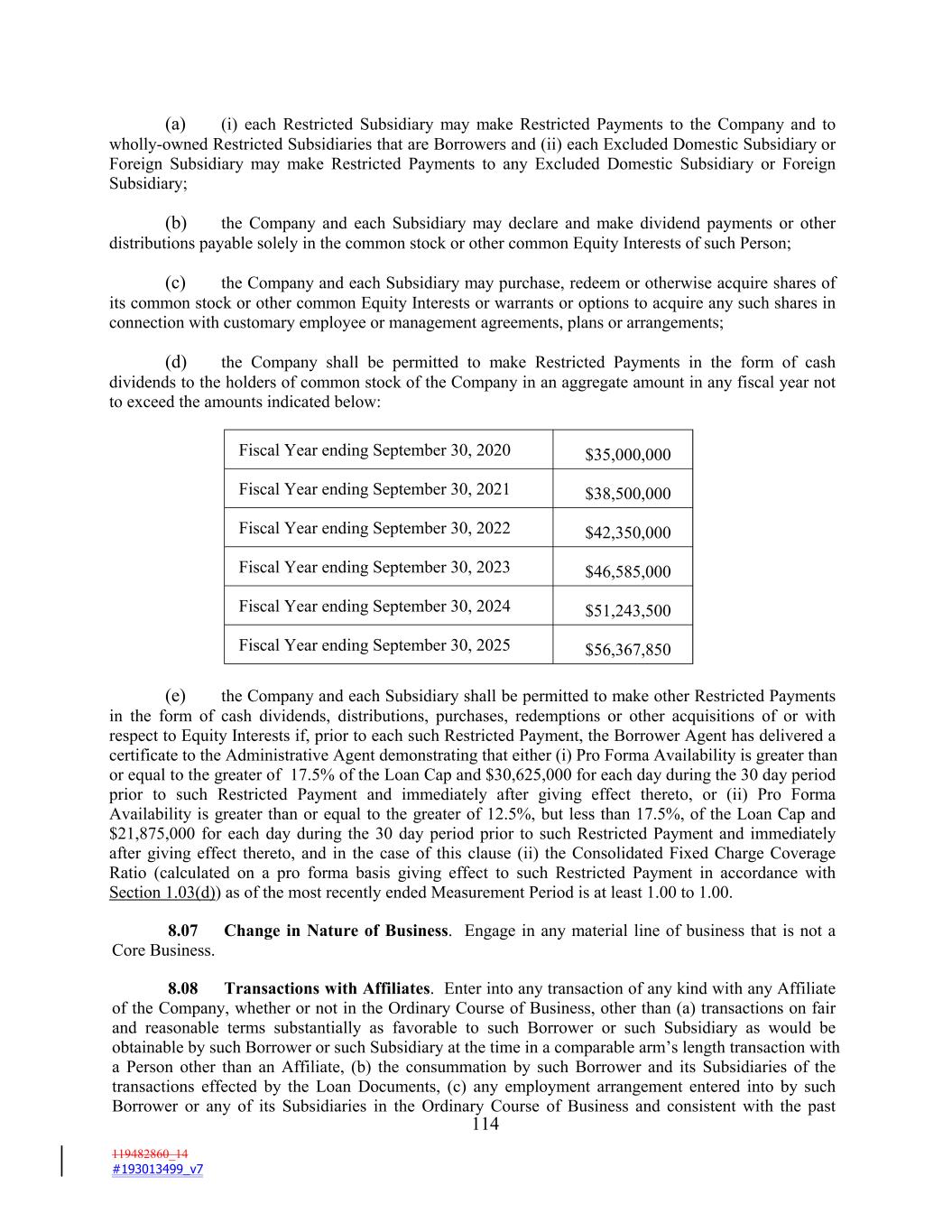 114 119482860_14 #193013499_v7 $42,350,000 (a) (i) each Restricted Subsidiary may make Restricted Payments to the Company and to wholly-owned Restricted Subsidiaries that are Borrowers and (ii) each Excluded Domestic Subsidiary or Foreign Subsidiary may make Restricted Payments to any Excluded Domestic Subsidiary or Foreign Subsidiary; (b) the Company and each Subsidiary may declare and make dividend payments or other distributions payable solely in the common stock or other common Equity Interests of such Person; (c) the Company and each Subsidiary may purchase, redeem or otherwise acquire shares of its common stock or other common Equity Interests or warrants or options to acquire any such shares in connection with customary employee or management agreements, plans or arrangements; (d) the Company shall be permitted to make Restricted Payments in the form of cash dividends to the holders of common stock of the Company in an aggregate amount in any fiscal year not to exceed the amounts indicated below: Fiscal Year ending September 30, 2023 $46,585,000 Fiscal Year ending September 30, 2021 Fiscal Year ending September 30, 2024 $38,500,000 $51,243,500 Fiscal Year ending September 30, 2020 Fiscal Year ending September 30, 2025 $56,367,850 Fiscal Year ending September 30, 2022 (e) the Company and each Subsidiary shall be permitted to make other Restricted Payments in the form of cash dividends, distributions, purchases, redemptions or other acquisitions of or with respect to Equity Interests if, prior to each such Restricted Payment, the Borrower Agent has delivered a certificate to the Administrative Agent demonstrating that either (i) Pro Forma Availability is greater than or equal to the greater of 17.5% of the Loan Cap and $30,625,000 for each day during the 30 day period prior to such Restricted Payment and immediately after giving effect thereto, or (ii) Pro Forma Availability is greater than or equal to the greater of 12.5%, but less than 17.5%, of the Loan Cap and $21,875,000 for each day during the 30 day period prior to such Restricted Payment and immediately after giving effect thereto, and in the case of this clause (ii) the Consolidated Fixed Charge Coverage Ratio (calculated on a pro forma basis giving effect to such Restricted Payment in accordance with Section 1.03(d)) as of the most recently ended Measurement Period is at least 1.00 to 1.00. 8.07 Change in Nature of Business. Engage in any material line of business that is not a Core Business. 8.08 Transactions with Affiliates. Enter into any transaction of any kind with any Affiliate of the Company, whether or not in the Ordinary Course of Business, other than (a) transactions on fair and reasonable terms substantially as favorable to such Borrower or such Subsidiary as would be obtainable by such Borrower or such Subsidiary at the time in a comparable arm’s length transaction with a Person other than an Affiliate, (b) the consummation by such Borrower and its Subsidiaries of the transactions effected by the Loan Documents, (c) any employment arrangement entered into by such Borrower or any of its Subsidiaries in the Ordinary Course of Business and consistent with the past $35,000,000