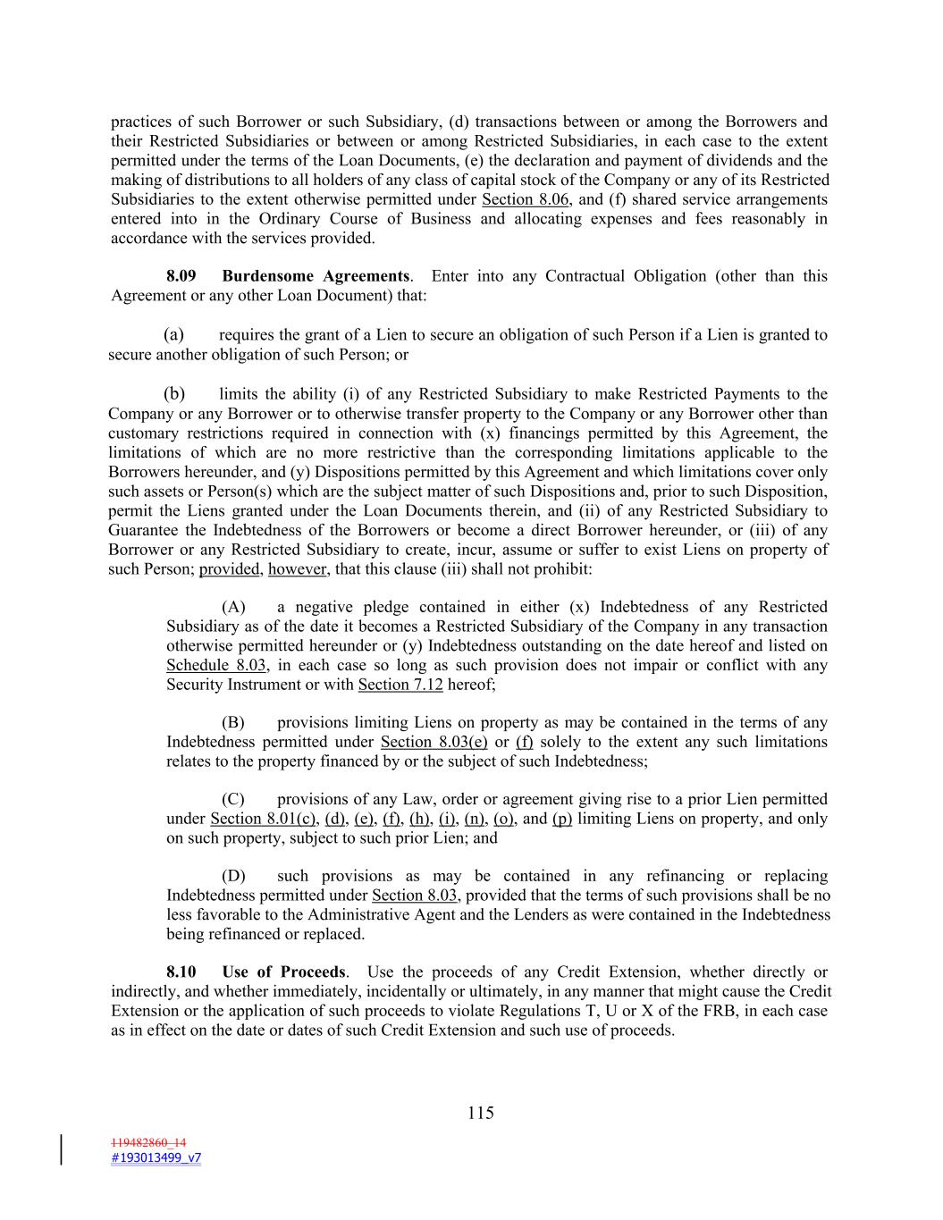 practices of such Borrower or such Subsidiary, (d) transactions between or among the Borrowers and their Restricted Subsidiaries or between or among Restricted Subsidiaries, in each case to the extent permitted under the terms of the Loan Documents, (e) the declaration and payment of dividends and the making of distributions to all holders of any class of capital stock of the Company or any of its Restricted Subsidiaries to the extent otherwise permitted under Section 8.06, and (f) shared service arrangements entered into in the Ordinary Course of Business and allocating expenses and fees reasonably in accordance with the services provided. 8.09 Burdensome Agreements. Enter into any Contractual Obligation (other than this Agreement or any other Loan Document) that: (a) requires the grant of a Lien to secure an obligation of such Person if a Lien is granted to secure another obligation of such Person; or (b) limits the ability (i) of any Restricted Subsidiary to make Restricted Payments to the Company or any Borrower or to otherwise transfer property to the Company or any Borrower other than customary restrictions required in connection with (x) financings permitted by this Agreement, the limitations of which are no more restrictive than the corresponding limitations applicable to the Borrowers hereunder, and (y) Dispositions permitted by this Agreement and which limitations cover only such assets or Person(s) which are the subject matter of such Dispositions and, prior to such Disposition, permit the Liens granted under the Loan Documents therein, and (ii) of any Restricted Subsidiary to Guarantee the Indebtedness of the Borrowers or become a direct Borrower hereunder, or (iii) of any Borrower or any Restricted Subsidiary to create, incur, assume or suffer to exist Liens on property of such Person; provided, however, that this clause (iii) shall not prohibit: (A) a negative pledge contained in either (x) Indebtedness of any Restricted Subsidiary as of the date it becomes a Restricted Subsidiary of the Company in any transaction otherwise permitted hereunder or (y) Indebtedness outstanding on the date hereof and listed on Schedule 8.03, in each case so long as such provision does not impair or conflict with any Security Instrument or with Section 7.12 hereof; (B) provisions limiting Liens on property as may be contained in the terms of any Indebtedness permitted under Section 8.03(e) or (f) solely to the extent any such limitations relates to the property financed by or the subject of such Indebtedness; (C) provisions of any Law, order or agreement giving rise to a prior Lien permitted under Section 8.01(c), (d), (e), (f), (h), (i), (n), (o), and (p) limiting Liens on property, and only on such property, subject to such prior Lien; and (D) such provisions as may be contained in any refinancing or replacing Indebtedness permitted under Section 8.03, provided that the terms of such provisions shall be no less favorable to the Administrative Agent and the Lenders as were contained in the Indebtedness being refinanced or replaced. 8.10 Use of Proceeds. Use the proceeds of any Credit Extension, whether directly or indirectly, and whether immediately, incidentally or ultimately, in any manner that might cause the Credit Extension or the application of such proceeds to violate Regulations T, U or X of the FRB, in each case as in effect on the date or dates of such Credit Extension and such use of proceeds. 115 119482860_14 #193013499_v7