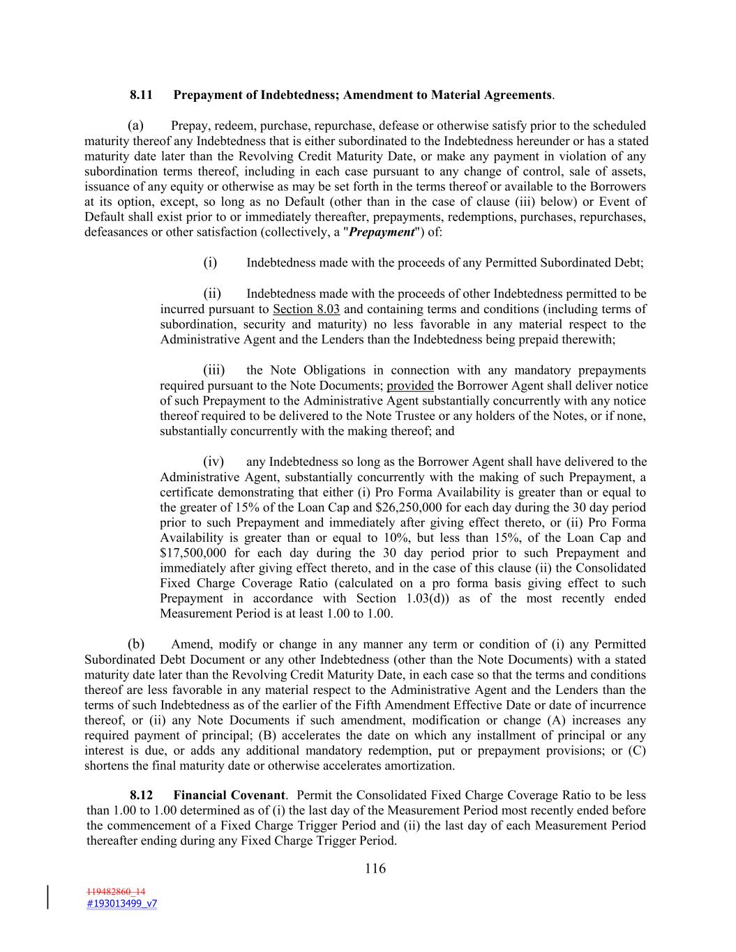 8.11 Prepayment of Indebtedness; Amendment to Material Agreements. (a) Prepay, redeem, purchase, repurchase, defease or otherwise satisfy prior to the scheduled maturity thereof any Indebtedness that is either subordinated to the Indebtedness hereunder or has a stated maturity date later than the Revolving Credit Maturity Date, or make any payment in violation of any subordination terms thereof, including in each case pursuant to any change of control, sale of assets, issuance of any equity or otherwise as may be set forth in the terms thereof or available to the Borrowers at its option, except, so long as no Default (other than in the case of clause (iii) below) or Event of Default shall exist prior to or immediately thereafter, prepayments, redemptions, purchases, repurchases, defeasances or other satisfaction (collectively, a "Prepayment") of: (i) Indebtedness made with the proceeds of any Permitted Subordinated Debt; (ii) Indebtedness made with the proceeds of other Indebtedness permitted to be incurred pursuant to Section 8.03 and containing terms and conditions (including terms of subordination, security and maturity) no less favorable in any material respect to the Administrative Agent and the Lenders than the Indebtedness being prepaid therewith; (iii) the Note Obligations in connection with any mandatory prepayments required pursuant to the Note Documents; provided the Borrower Agent shall deliver notice of such Prepayment to the Administrative Agent substantially concurrently with any notice thereof required to be delivered to the Note Trustee or any holders of the Notes, or if none, substantially concurrently with the making thereof; and (iv) any Indebtedness so long as the Borrower Agent shall have delivered to the Administrative Agent, substantially concurrently with the making of such Prepayment, a certificate demonstrating that either (i) Pro Forma Availability is greater than or equal to the greater of 15% of the Loan Cap and $26,250,000 for each day during the 30 day period prior to such Prepayment and immediately after giving effect thereto, or (ii) Pro Forma Availability is greater than or equal to 10%, but less than 15%, of the Loan Cap and $17,500,000 for each day during the 30 day period prior to such Prepayment and immediately after giving effect thereto, and in the case of this clause (ii) the Consolidated Fixed Charge Coverage Ratio (calculated on a pro forma basis giving effect to such Prepayment in accordance with Section 1.03(d)) as of the most recently ended Measurement Period is at least 1.00 to 1.00. (b) Amend, modify or change in any manner any term or condition of (i) any Permitted Subordinated Debt Document or any other Indebtedness (other than the Note Documents) with a stated maturity date later than the Revolving Credit Maturity Date, in each case so that the terms and conditions thereof are less favorable in any material respect to the Administrative Agent and the Lenders than the terms of such Indebtedness as of the earlier of the Fifth Amendment Effective Date or date of incurrence thereof, or (ii) any Note Documents if such amendment, modification or change (A) increases any required payment of principal; (B) accelerates the date on which any installment of principal or any interest is due, or adds any additional mandatory redemption, put or prepayment provisions; or (C) shortens the final maturity date or otherwise accelerates amortization. 8.12 Financial Covenant. Permit the Consolidated Fixed Charge Coverage Ratio to be less than 1.00 to 1.00 determined as of (i) the last day of the Measurement Period most recently ended before the commencement of a Fixed Charge Trigger Period and (ii) the last day of each Measurement Period thereafter ending during any Fixed Charge Trigger Period. 116 119482860_14 #193013499_v7