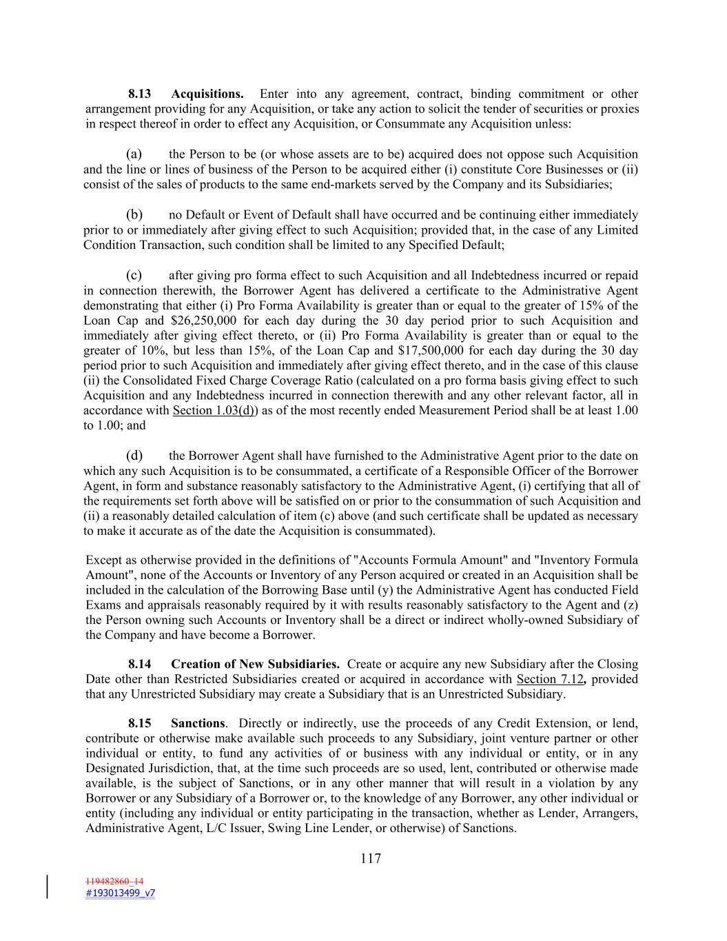 8.13 Acquisitions. Enter into any agreement, contract, binding commitment or other arrangement providing for any Acquisition, or take any action to solicit the tender of securities or proxies in respect thereof in order to effect any Acquisition, or Consummate any Acquisition unless: (a) the Person to be (or whose assets are to be) acquired does not oppose such Acquisition and the line or lines of business of the Person to be acquired either (i) constitute Core Businesses or (ii) consist of the sales of products to the same end-markets served by the Company and its Subsidiaries; (b) no Default or Event of Default shall have occurred and be continuing either immediately prior to or immediately after giving effect to such Acquisition; provided that, in the case of any Limited Condition Transaction, such condition shall be limited to any Specified Default; (c) after giving pro forma effect to such Acquisition and all Indebtedness incurred or repaid in connection therewith, the Borrower Agent has delivered a certificate to the Administrative Agent demonstrating that either (i) Pro Forma Availability is greater than or equal to the greater of 15% of the Loan Cap and $26,250,000 for each day during the 30 day period prior to such Acquisition and immediately after giving effect thereto, or (ii) Pro Forma Availability is greater than or equal to the greater of 10%, but less than 15%, of the Loan Cap and $17,500,000 for each day during the 30 day period prior to such Acquisition and immediately after giving effect thereto, and in the case of this clause (ii) the Consolidated Fixed Charge Coverage Ratio (calculated on a pro forma basis giving effect to such Acquisition and any Indebtedness incurred in connection therewith and any other relevant factor, all in accordance with Section 1.03(d)) as of the most recently ended Measurement Period shall be at least 1.00 to 1.00; and (d) the Borrower Agent shall have furnished to the Administrative Agent prior to the date on which any such Acquisition is to be consummated, a certificate of a Responsible Officer of the Borrower Agent, in form and substance reasonably satisfactory to the Administrative Agent, (i) certifying that all of the requirements set forth above will be satisfied on or prior to the consummation of such Acquisition and (ii) a reasonably detailed calculation of item (c) above (and such certificate shall be updated as necessary to make it accurate as of the date the Acquisition is consummated). Except as otherwise provided in the definitions of "Accounts Formula Amount" and "Inventory Formula Amount", none of the Accounts or Inventory of any Person acquired or created in an Acquisition shall be included in the calculation of the Borrowing Base until (y) the Administrative Agent has conducted Field Exams and appraisals reasonably required by it with results reasonably satisfactory to the Agent and (z) the Person owning such Accounts or Inventory shall be a direct or indirect wholly-owned Subsidiary of the Company and have become a Borrower. 8.14 Creation of New Subsidiaries. Create or acquire any new Subsidiary after the Closing Date other than Restricted Subsidiaries created or acquired in accordance with Section 7.12, provided that any Unrestricted Subsidiary may create a Subsidiary that is an Unrestricted Subsidiary. 8.15 Sanctions. Directly or indirectly, use the proceeds of any Credit Extension, or lend, contribute or otherwise make available such proceeds to any Subsidiary, joint venture partner or other individual or entity, to fund any activities of or business with any individual or entity, or in any Designated Jurisdiction, that, at the time such proceeds are so used, lent, contributed or otherwise made available, is the subject of Sanctions, or in any other manner that will result in a violation by any Borrower or any Subsidiary of a Borrower or, to the knowledge of any Borrower, any other individual or entity (including any individual or entity participating in the transaction, whether as Lender, Arrangers, Administrative Agent, L/C Issuer, Swing Line Lender, or otherwise) of Sanctions. 117 119482860_14 #193013499_v7