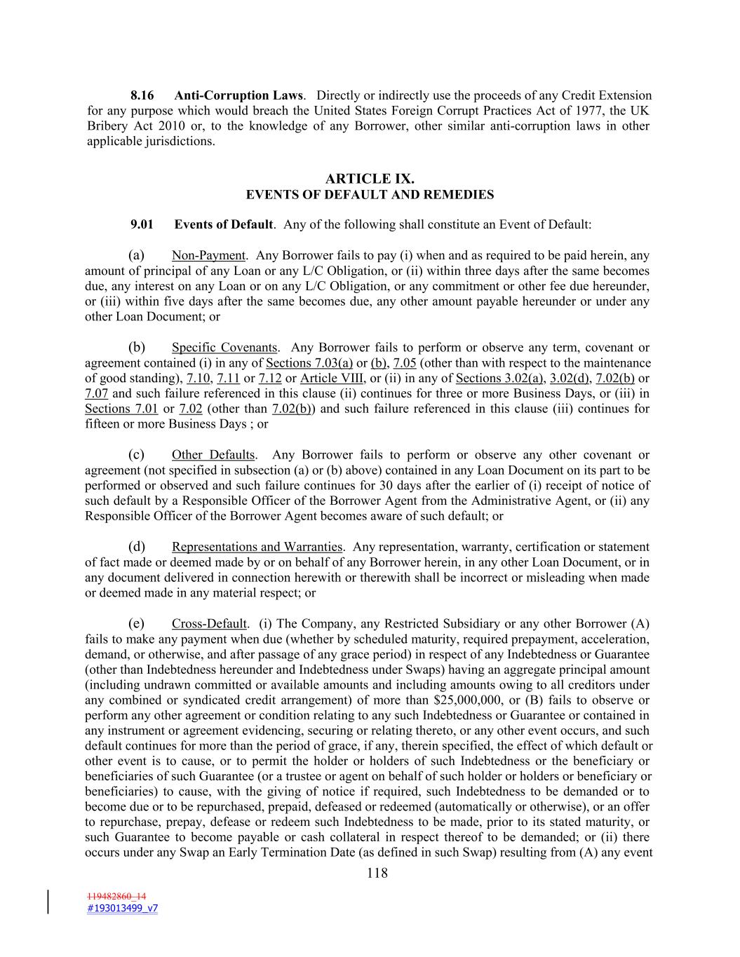 8.16 Anti-Corruption Laws. Directly or indirectly use the proceeds of any Credit Extension for any purpose which would breach the United States Foreign Corrupt Practices Act of 1977, the UK Bribery Act 2010 or, to the knowledge of any Borrower, other similar anti-corruption laws in other applicable jurisdictions. ARTICLE IX. EVENTS OF DEFAULT AND REMEDIES 9.01 Events of Default. Any of the following shall constitute an Event of Default: (a) Non-Payment. Any Borrower fails to pay (i) when and as required to be paid herein, any amount of principal of any Loan or any L/C Obligation, or (ii) within three days after the same becomes due, any interest on any Loan or on any L/C Obligation, or any commitment or other fee due hereunder, or (iii) within five days after the same becomes due, any other amount payable hereunder or under any other Loan Document; or (b) Specific Covenants. Any Borrower fails to perform or observe any term, covenant or agreement contained (i) in any of Sections 7.03(a) or (b), 7.05 (other than with respect to the maintenance of good standing), 7.10, 7.11 or 7.12 or Article VIII, or (ii) in any of Sections 3.02(a), 3.02(d), 7.02(b) or 7.07 and such failure referenced in this clause (ii) continues for three or more Business Days, or (iii) in Sections 7.01 or 7.02 (other than 7.02(b)) and such failure referenced in this clause (iii) continues for fifteen or more Business Days ; or (c) Other Defaults. Any Borrower fails to perform or observe any other covenant or agreement (not specified in subsection (a) or (b) above) contained in any Loan Document on its part to be performed or observed and such failure continues for 30 days after the earlier of (i) receipt of notice of such default by a Responsible Officer of the Borrower Agent from the Administrative Agent, or (ii) any Responsible Officer of the Borrower Agent becomes aware of such default; or (d) Representations and Warranties. Any representation, warranty, certification or statement of fact made or deemed made by or on behalf of any Borrower herein, in any other Loan Document, or in any document delivered in connection herewith or therewith shall be incorrect or misleading when made or deemed made in any material respect; or (e) Cross-Default. (i) The Company, any Restricted Subsidiary or any other Borrower (A) fails to make any payment when due (whether by scheduled maturity, required prepayment, acceleration, demand, or otherwise, and after passage of any grace period) in respect of any Indebtedness or Guarantee (other than Indebtedness hereunder and Indebtedness under Swaps) having an aggregate principal amount (including undrawn committed or available amounts and including amounts owing to all creditors under any combined or syndicated credit arrangement) of more than $25,000,000, or (B) fails to observe or perform any other agreement or condition relating to any such Indebtedness or Guarantee or contained in any instrument or agreement evidencing, securing or relating thereto, or any other event occurs, and such default continues for more than the period of grace, if any, therein specified, the effect of which default or other event is to cause, or to permit the holder or holders of such Indebtedness or the beneficiary or beneficiaries of such Guarantee (or a trustee or agent on behalf of such holder or holders or beneficiary or beneficiaries) to cause, with the giving of notice if required, such Indebtedness to be demanded or to become due or to be repurchased, prepaid, defeased or redeemed (automatically or otherwise), or an offer to repurchase, prepay, defease or redeem such Indebtedness to be made, prior to its stated maturity, or such Guarantee to become payable or cash collateral in respect thereof to be demanded; or (ii) there occurs under any Swap an Early Termination Date (as defined in such Swap) resulting from (A) any event 118 119482860_14 #193013499_v7