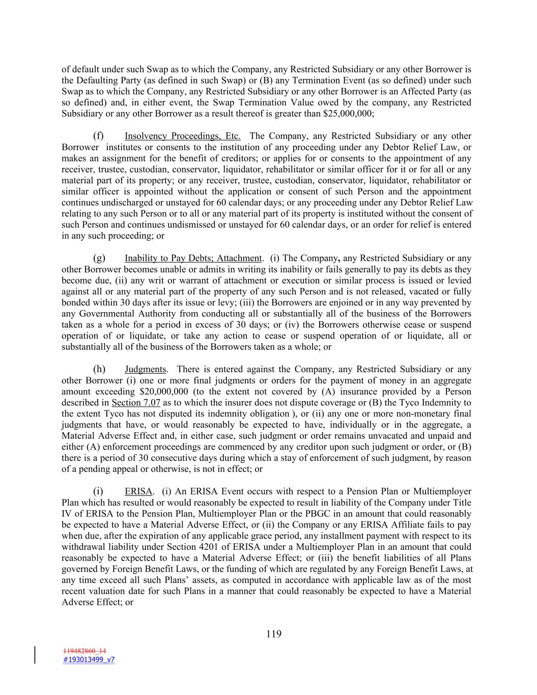 of default under such Swap as to which the Company, any Restricted Subsidiary or any other Borrower is the Defaulting Party (as defined in such Swap) or (B) any Termination Event (as so defined) under such Swap as to which the Company, any Restricted Subsidiary or any other Borrower is an Affected Party (as so defined) and, in either event, the Swap Termination Value owed by the company, any Restricted Subsidiary or any other Borrower as a result thereof is greater than $25,000,000; (f) Insolvency Proceedings, Etc. The Company, any Restricted Subsidiary or any other Borrower institutes or consents to the institution of any proceeding under any Debtor Relief Law, or makes an assignment for the benefit of creditors; or applies for or consents to the appointment of any receiver, trustee, custodian, conservator, liquidator, rehabilitator or similar officer for it or for all or any material part of its property; or any receiver, trustee, custodian, conservator, liquidator, rehabilitator or similar officer is appointed without the application or consent of such Person and the appointment continues undischarged or unstayed for 60 calendar days; or any proceeding under any Debtor Relief Law relating to any such Person or to all or any material part of its property is instituted without the consent of such Person and continues undismissed or unstayed for 60 calendar days, or an order for relief is entered in any such proceeding; or (g) Inability to Pay Debts; Attachment. (i) The Company, any Restricted Subsidiary or any other Borrower becomes unable or admits in writing its inability or fails generally to pay its debts as they become due, (ii) any writ or warrant of attachment or execution or similar process is issued or levied against all or any material part of the property of any such Person and is not released, vacated or fully bonded within 30 days after its issue or levy; (iii) the Borrowers are enjoined or in any way prevented by any Governmental Authority from conducting all or substantially all of the business of the Borrowers taken as a whole for a period in excess of 30 days; or (iv) the Borrowers otherwise cease or suspend operation of or liquidate, or take any action to cease or suspend operation of or liquidate, all or substantially all of the business of the Borrowers taken as a whole; or (h) Judgments. There is entered against the Company, any Restricted Subsidiary or any other Borrower (i) one or more final judgments or orders for the payment of money in an aggregate amount exceeding $20,000,000 (to the extent not covered by (A) insurance provided by a Person described in Section 7.07 as to which the insurer does not dispute coverage or (B) the Tyco Indemnity to the extent Tyco has not disputed its indemnity obligation ), or (ii) any one or more non-monetary final judgments that have, or would reasonably be expected to have, individually or in the aggregate, a Material Adverse Effect and, in either case, such judgment or order remains unvacated and unpaid and either (A) enforcement proceedings are commenced by any creditor upon such judgment or order, or (B) there is a period of 30 consecutive days during which a stay of enforcement of such judgment, by reason of a pending appeal or otherwise, is not in effect; or (i) ERISA. (i) An ERISA Event occurs with respect to a Pension Plan or Multiemployer Plan which has resulted or would reasonably be expected to result in liability of the Company under Title IV of ERISA to the Pension Plan, Multiemployer Plan or the PBGC in an amount that could reasonably be expected to have a Material Adverse Effect, or (ii) the Company or any ERISA Affiliate fails to pay when due, after the expiration of any applicable grace period, any installment payment with respect to its withdrawal liability under Section 4201 of ERISA under a Multiemployer Plan in an amount that could reasonably be expected to have a Material Adverse Effect; or (iii) the benefit liabilities of all Plans governed by Foreign Benefit Laws, or the funding of which are regulated by any Foreign Benefit Laws, at any time exceed all such Plans’ assets, as computed in accordance with applicable law as of the most recent valuation date for such Plans in a manner that could reasonably be expected to have a Material Adverse Effect; or 119 119482860_14 #193013499_v7