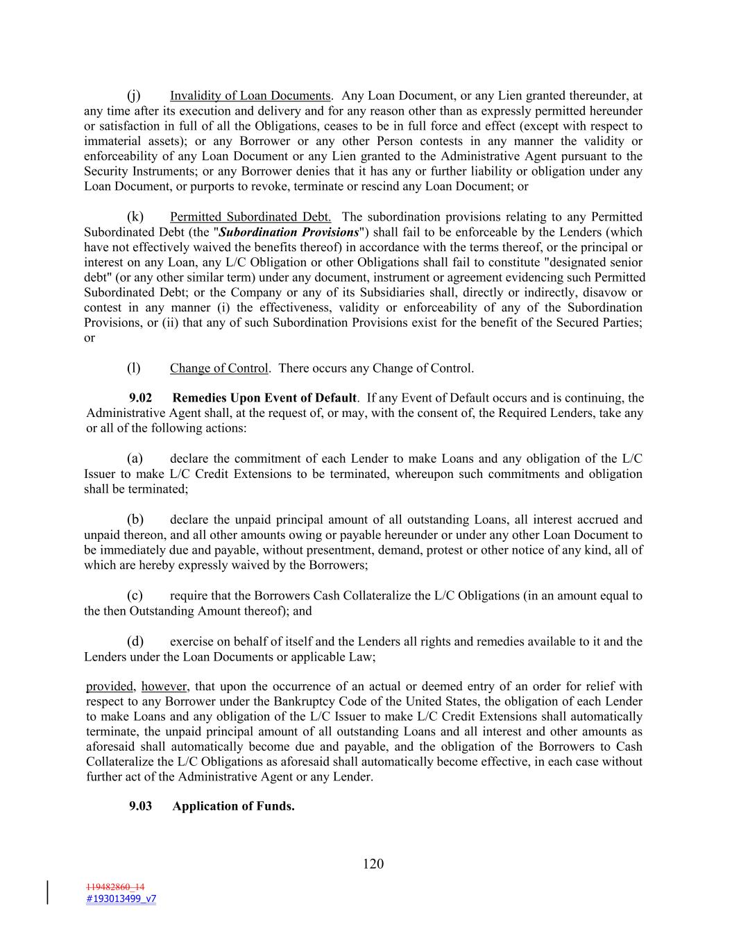 (j) Invalidity of Loan Documents. Any Loan Document, or any Lien granted thereunder, at any time after its execution and delivery and for any reason other than as expressly permitted hereunder or satisfaction in full of all the Obligations, ceases to be in full force and effect (except with respect to immaterial assets); or any Borrower or any other Person contests in any manner the validity or enforceability of any Loan Document or any Lien granted to the Administrative Agent pursuant to the Security Instruments; or any Borrower denies that it has any or further liability or obligation under any Loan Document, or purports to revoke, terminate or rescind any Loan Document; or (k) Permitted Subordinated Debt. The subordination provisions relating to any Permitted Subordinated Debt (the "Subordination Provisions") shall fail to be enforceable by the Lenders (which have not effectively waived the benefits thereof) in accordance with the terms thereof, or the principal or interest on any Loan, any L/C Obligation or other Obligations shall fail to constitute "designated senior debt" (or any other similar term) under any document, instrument or agreement evidencing such Permitted Subordinated Debt; or the Company or any of its Subsidiaries shall, directly or indirectly, disavow or contest in any manner (i) the effectiveness, validity or enforceability of any of the Subordination Provisions, or (ii) that any of such Subordination Provisions exist for the benefit of the Secured Parties; or (l) Change of Control. There occurs any Change of Control. 9.02 Remedies Upon Event of Default. If any Event of Default occurs and is continuing, the Administrative Agent shall, at the request of, or may, with the consent of, the Required Lenders, take any or all of the following actions: (a) declare the commitment of each Lender to make Loans and any obligation of the L/C Issuer to make L/C Credit Extensions to be terminated, whereupon such commitments and obligation shall be terminated; (b) declare the unpaid principal amount of all outstanding Loans, all interest accrued and unpaid thereon, and all other amounts owing or payable hereunder or under any other Loan Document to be immediately due and payable, without presentment, demand, protest or other notice of any kind, all of which are hereby expressly waived by the Borrowers; (c) require that the Borrowers Cash Collateralize the L/C Obligations (in an amount equal to the then Outstanding Amount thereof); and (d) exercise on behalf of itself and the Lenders all rights and remedies available to it and the Lenders under the Loan Documents or applicable Law; provided, however, that upon the occurrence of an actual or deemed entry of an order for relief with respect to any Borrower under the Bankruptcy Code of the United States, the obligation of each Lender to make Loans and any obligation of the L/C Issuer to make L/C Credit Extensions shall automatically terminate, the unpaid principal amount of all outstanding Loans and all interest and other amounts as aforesaid shall automatically become due and payable, and the obligation of the Borrowers to Cash Collateralize the L/C Obligations as aforesaid shall automatically become effective, in each case without further act of the Administrative Agent or any Lender. 9.03 Application of Funds. 120 119482860_14 #193013499_v7