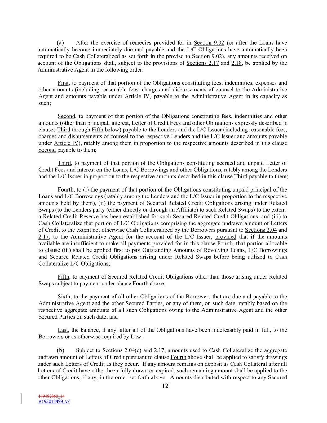 (a) After the exercise of remedies provided for in Section 9.02 (or after the Loans have automatically become immediately due and payable and the L/C Obligations have automatically been required to be Cash Collateralized as set forth in the proviso to Section 9.02), any amounts received on account of the Obligations shall, subject to the provisions of Sections 2.17 and 2.18, be applied by the Administrative Agent in the following order: First, to payment of that portion of the Obligations constituting fees, indemnities, expenses and other amounts (including reasonable fees, charges and disbursements of counsel to the Administrative Agent and amounts payable under Article IV) payable to the Administrative Agent in its capacity as such; Second, to payment of that portion of the Obligations constituting fees, indemnities and other amounts (other than principal, interest, Letter of Credit Fees and other Obligations expressly described in clauses Third through Fifth below) payable to the Lenders and the L/C Issuer (including reasonable fees, charges and disbursements of counsel to the respective Lenders and the L/C Issuer and amounts payable under Article IV), ratably among them in proportion to the respective amounts described in this clause Second payable to them; Third, to payment of that portion of the Obligations constituting accrued and unpaid Letter of Credit Fees and interest on the Loans, L/C Borrowings and other Obligations, ratably among the Lenders and the L/C Issuer in proportion to the respective amounts described in this clause Third payable to them; Fourth, to (i) the payment of that portion of the Obligations constituting unpaid principal of the Loans and L/C Borrowings (ratably among the Lenders and the L/C Issuer in proportion to the respective amounts held by them), (ii) the payment of Secured Related Credit Obligations arising under Related Swaps (to the Lenders party (either directly or through an Affiliate) to such Related Swaps) to the extent a Related Credit Reserve has been established for such Secured Related Credit Obligations, and (iii) to Cash Collateralize that portion of L/C Obligations comprising the aggregate undrawn amount of Letters of Credit to the extent not otherwise Cash Collateralized by the Borrowers pursuant to Sections 2.04 and 2.17, to the Administrative Agent for the account of the L/C Issuer; provided that if the amounts available are insufficient to make all payments provided for in this clause Fourth, that portion allocable to clause (iii) shall be applied first to pay Outstanding Amounts of Revolving Loans, L/C Borrowings and Secured Related Credit Obligations arising under Related Swaps before being utilized to Cash Collateralize L/C Obligations; Fifth, to payment of Secured Related Credit Obligations other than those arising under Related Swaps subject to payment under clause Fourth above; Sixth, to the payment of all other Obligations of the Borrowers that are due and payable to the Administrative Agent and the other Secured Parties, or any of them, on such date, ratably based on the respective aggregate amounts of all such Obligations owing to the Administrative Agent and the other Secured Parties on such date; and Last, the balance, if any, after all of the Obligations have been indefeasibly paid in full, to the Borrowers or as otherwise required by Law. (b) Subject to Sections 2.04(c) and 2.17, amounts used to Cash Collateralize the aggregate undrawn amount of Letters of Credit pursuant to clause Fourth above shall be applied to satisfy drawings under such Letters of Credit as they occur. If any amount remains on deposit as Cash Collateral after all Letters of Credit have either been fully drawn or expired, such remaining amount shall be applied to the other Obligations, if any, in the order set forth above. Amounts distributed with respect to any Secured 121 119482860_14 #193013499_v7