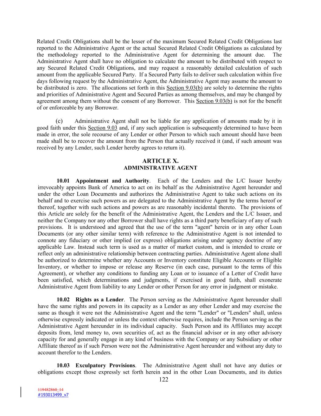 Related Credit Obligations shall be the lesser of the maximum Secured Related Credit Obligations last reported to the Administrative Agent or the actual Secured Related Credit Obligations as calculated by the methodology reported to the Administrative Agent for determining the amount due. The Administrative Agent shall have no obligation to calculate the amount to be distributed with respect to any Secured Related Credit Obligations, and may request a reasonably detailed calculation of such amount from the applicable Secured Party. If a Secured Party fails to deliver such calculation within five days following request by the Administrative Agent, the Administrative Agent may assume the amount to be distributed is zero. The allocations set forth in this Section 9.03(b) are solely to determine the rights and priorities of Administrative Agent and Secured Parties as among themselves, and may be changed by agreement among them without the consent of any Borrower. This Section 9.03(b) is not for the benefit of or enforceable by any Borrower. (c) Administrative Agent shall not be liable for any application of amounts made by it in good faith under this Section 9.03 and, if any such application is subsequently determined to have been made in error, the sole recourse of any Lender or other Person to which such amount should have been made shall be to recover the amount from the Person that actually received it (and, if such amount was received by any Lender, such Lender hereby agrees to return it). ARTICLE X. ADMINISTRATIVE AGENT 10.01 Appointment and Authority. Each of the Lenders and the L/C Issuer hereby irrevocably appoints Bank of America to act on its behalf as the Administrative Agent hereunder and under the other Loan Documents and authorizes the Administrative Agent to take such actions on its behalf and to exercise such powers as are delegated to the Administrative Agent by the terms hereof or thereof, together with such actions and powers as are reasonably incidental thereto. The provisions of this Article are solely for the benefit of the Administrative Agent, the Lenders and the L/C Issuer, and neither the Company nor any other Borrower shall have rights as a third party beneficiary of any of such provisions. It is understood and agreed that the use of the term "agent" herein or in any other Loan Documents (or any other similar term) with reference to the Administrative Agent is not intended to connote any fiduciary or other implied (or express) obligations arising under agency doctrine of any applicable Law. Instead such term is used as a matter of market custom, and is intended to create or reflect only an administrative relationship between contracting parties. Administrative Agent alone shall be authorized to determine whether any Accounts or Inventory constitute Eligible Accounts or Eligible Inventory, or whether to impose or release any Reserve (in each case, pursuant to the terms of this Agreement), or whether any conditions to funding any Loan or to issuance of a Letter of Credit have been satisfied, which determinations and judgments, if exercised in good faith, shall exonerate Administrative Agent from liability to any Lender or other Person for any error in judgment or mistake. 10.02 Rights as a Lender. The Person serving as the Administrative Agent hereunder shall have the same rights and powers in its capacity as a Lender as any other Lender and may exercise the same as though it were not the Administrative Agent and the term "Lender" or "Lenders" shall, unless otherwise expressly indicated or unless the context otherwise requires, include the Person serving as the Administrative Agent hereunder in its individual capacity. Such Person and its Affiliates may accept deposits from, lend money to, own securities of, act as the financial advisor or in any other advisory capacity for and generally engage in any kind of business with the Company or any Subsidiary or other Affiliate thereof as if such Person were not the Administrative Agent hereunder and without any duty to account therefor to the Lenders. 10.03 Exculpatory Provisions. The Administrative Agent shall not have any duties or obligations except those expressly set forth herein and in the other Loan Documents, and its duties 122 119482860_14 #193013499_v7