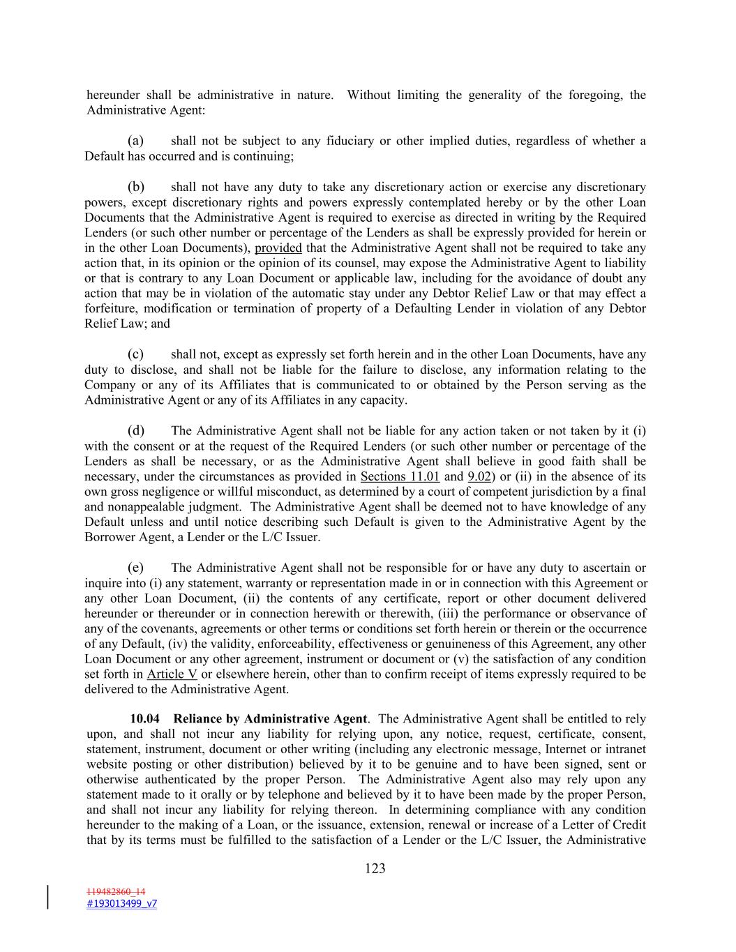 hereunder shall be administrative in nature. Without limiting the generality of the foregoing, the Administrative Agent: (a) shall not be subject to any fiduciary or other implied duties, regardless of whether a Default has occurred and is continuing; (b) shall not have any duty to take any discretionary action or exercise any discretionary powers, except discretionary rights and powers expressly contemplated hereby or by the other Loan Documents that the Administrative Agent is required to exercise as directed in writing by the Required Lenders (or such other number or percentage of the Lenders as shall be expressly provided for herein or in the other Loan Documents), provided that the Administrative Agent shall not be required to take any action that, in its opinion or the opinion of its counsel, may expose the Administrative Agent to liability or that is contrary to any Loan Document or applicable law, including for the avoidance of doubt any action that may be in violation of the automatic stay under any Debtor Relief Law or that may effect a forfeiture, modification or termination of property of a Defaulting Lender in violation of any Debtor Relief Law; and (c) shall not, except as expressly set forth herein and in the other Loan Documents, have any duty to disclose, and shall not be liable for the failure to disclose, any information relating to the Company or any of its Affiliates that is communicated to or obtained by the Person serving as the Administrative Agent or any of its Affiliates in any capacity. (d) The Administrative Agent shall not be liable for any action taken or not taken by it (i) with the consent or at the request of the Required Lenders (or such other number or percentage of the Lenders as shall be necessary, or as the Administrative Agent shall believe in good faith shall be necessary, under the circumstances as provided in Sections 11.01 and 9.02) or (ii) in the absence of its own gross negligence or willful misconduct, as determined by a court of competent jurisdiction by a final and nonappealable judgment. The Administrative Agent shall be deemed not to have knowledge of any Default unless and until notice describing such Default is given to the Administrative Agent by the Borrower Agent, a Lender or the L/C Issuer. (e) The Administrative Agent shall not be responsible for or have any duty to ascertain or inquire into (i) any statement, warranty or representation made in or in connection with this Agreement or any other Loan Document, (ii) the contents of any certificate, report or other document delivered hereunder or thereunder or in connection herewith or therewith, (iii) the performance or observance of any of the covenants, agreements or other terms or conditions set forth herein or therein or the occurrence of any Default, (iv) the validity, enforceability, effectiveness or genuineness of this Agreement, any other Loan Document or any other agreement, instrument or document or (v) the satisfaction of any condition set forth in Article V or elsewhere herein, other than to confirm receipt of items expressly required to be delivered to the Administrative Agent. 10.04 Reliance by Administrative Agent. The Administrative Agent shall be entitled to rely upon, and shall not incur any liability for relying upon, any notice, request, certificate, consent, statement, instrument, document or other writing (including any electronic message, Internet or intranet website posting or other distribution) believed by it to be genuine and to have been signed, sent or otherwise authenticated by the proper Person. The Administrative Agent also may rely upon any statement made to it orally or by telephone and believed by it to have been made by the proper Person, and shall not incur any liability for relying thereon. In determining compliance with any condition hereunder to the making of a Loan, or the issuance, extension, renewal or increase of a Letter of Credit that by its terms must be fulfilled to the satisfaction of a Lender or the L/C Issuer, the Administrative 123 119482860_14 #193013499_v7