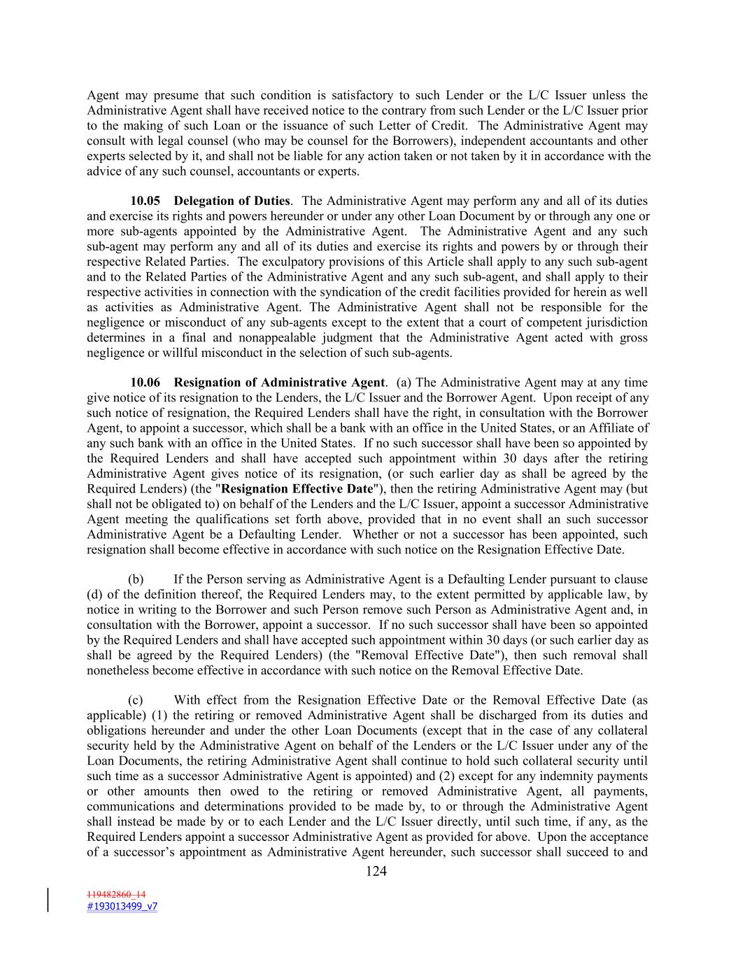 Agent may presume that such condition is satisfactory to such Lender or the L/C Issuer unless the Administrative Agent shall have received notice to the contrary from such Lender or the L/C Issuer prior to the making of such Loan or the issuance of such Letter of Credit. The Administrative Agent may consult with legal counsel (who may be counsel for the Borrowers), independent accountants and other experts selected by it, and shall not be liable for any action taken or not taken by it in accordance with the advice of any such counsel, accountants or experts. 10.05 Delegation of Duties. The Administrative Agent may perform any and all of its duties and exercise its rights and powers hereunder or under any other Loan Document by or through any one or more sub-agents appointed by the Administrative Agent. The Administrative Agent and any such sub-agent may perform any and all of its duties and exercise its rights and powers by or through their respective Related Parties. The exculpatory provisions of this Article shall apply to any such sub-agent and to the Related Parties of the Administrative Agent and any such sub-agent, and shall apply to their respective activities in connection with the syndication of the credit facilities provided for herein as well as activities as Administrative Agent. The Administrative Agent shall not be responsible for the negligence or misconduct of any sub-agents except to the extent that a court of competent jurisdiction determines in a final and nonappealable judgment that the Administrative Agent acted with gross negligence or willful misconduct in the selection of such sub-agents. 10.06 Resignation of Administrative Agent. (a) The Administrative Agent may at any time give notice of its resignation to the Lenders, the L/C Issuer and the Borrower Agent. Upon receipt of any such notice of resignation, the Required Lenders shall have the right, in consultation with the Borrower Agent, to appoint a successor, which shall be a bank with an office in the United States, or an Affiliate of any such bank with an office in the United States. If no such successor shall have been so appointed by the Required Lenders and shall have accepted such appointment within 30 days after the retiring Administrative Agent gives notice of its resignation, (or such earlier day as shall be agreed by the Required Lenders) (the "Resignation Effective Date"), then the retiring Administrative Agent may (but shall not be obligated to) on behalf of the Lenders and the L/C Issuer, appoint a successor Administrative Agent meeting the qualifications set forth above, provided that in no event shall an such successor Administrative Agent be a Defaulting Lender. Whether or not a successor has been appointed, such resignation shall become effective in accordance with such notice on the Resignation Effective Date. (b) If the Person serving as Administrative Agent is a Defaulting Lender pursuant to clause (d) of the definition thereof, the Required Lenders may, to the extent permitted by applicable law, by notice in writing to the Borrower and such Person remove such Person as Administrative Agent and, in consultation with the Borrower, appoint a successor. If no such successor shall have been so appointed by the Required Lenders and shall have accepted such appointment within 30 days (or such earlier day as shall be agreed by the Required Lenders) (the "Removal Effective Date"), then such removal shall nonetheless become effective in accordance with such notice on the Removal Effective Date. (c) With effect from the Resignation Effective Date or the Removal Effective Date (as applicable) (1) the retiring or removed Administrative Agent shall be discharged from its duties and obligations hereunder and under the other Loan Documents (except that in the case of any collateral security held by the Administrative Agent on behalf of the Lenders or the L/C Issuer under any of the Loan Documents, the retiring Administrative Agent shall continue to hold such collateral security until such time as a successor Administrative Agent is appointed) and (2) except for any indemnity payments or other amounts then owed to the retiring or removed Administrative Agent, all payments, communications and determinations provided to be made by, to or through the Administrative Agent shall instead be made by or to each Lender and the L/C Issuer directly, until such time, if any, as the Required Lenders appoint a successor Administrative Agent as provided for above. Upon the acceptance of a successor’s appointment as Administrative Agent hereunder, such successor shall succeed to and 124 119482860_14 #193013499_v7