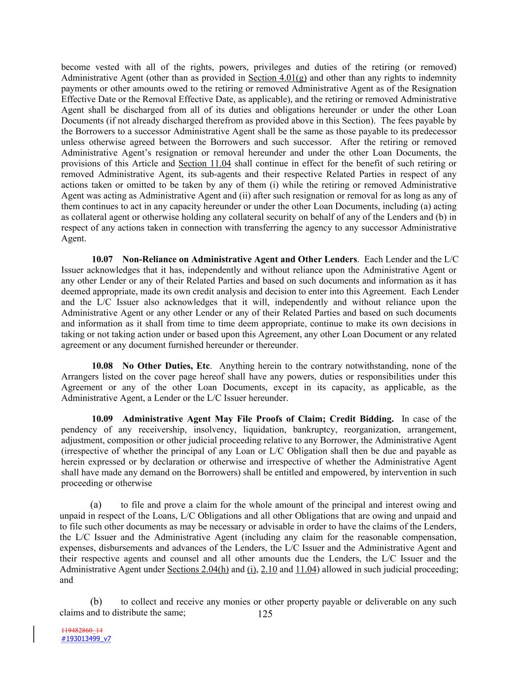 become vested with all of the rights, powers, privileges and duties of the retiring (or removed) Administrative Agent (other than as provided in Section 4.01(g) and other than any rights to indemnity payments or other amounts owed to the retiring or removed Administrative Agent as of the Resignation Effective Date or the Removal Effective Date, as applicable), and the retiring or removed Administrative Agent shall be discharged from all of its duties and obligations hereunder or under the other Loan Documents (if not already discharged therefrom as provided above in this Section). The fees payable by the Borrowers to a successor Administrative Agent shall be the same as those payable to its predecessor unless otherwise agreed between the Borrowers and such successor. After the retiring or removed Administrative Agent’s resignation or removal hereunder and under the other Loan Documents, the provisions of this Article and Section 11.04 shall continue in effect for the benefit of such retiring or removed Administrative Agent, its sub-agents and their respective Related Parties in respect of any actions taken or omitted to be taken by any of them (i) while the retiring or removed Administrative Agent was acting as Administrative Agent and (ii) after such resignation or removal for as long as any of them continues to act in any capacity hereunder or under the other Loan Documents, including (a) acting as collateral agent or otherwise holding any collateral security on behalf of any of the Lenders and (b) in respect of any actions taken in connection with transferring the agency to any successor Administrative Agent. 10.07 Non-Reliance on Administrative Agent and Other Lenders. Each Lender and the L/C Issuer acknowledges that it has, independently and without reliance upon the Administrative Agent or any other Lender or any of their Related Parties and based on such documents and information as it has deemed appropriate, made its own credit analysis and decision to enter into this Agreement. Each Lender and the L/C Issuer also acknowledges that it will, independently and without reliance upon the Administrative Agent or any other Lender or any of their Related Parties and based on such documents and information as it shall from time to time deem appropriate, continue to make its own decisions in taking or not taking action under or based upon this Agreement, any other Loan Document or any related agreement or any document furnished hereunder or thereunder. 10.08 No Other Duties, Etc. Anything herein to the contrary notwithstanding, none of the Arrangers listed on the cover page hereof shall have any powers, duties or responsibilities under this Agreement or any of the other Loan Documents, except in its capacity, as applicable, as the Administrative Agent, a Lender or the L/C Issuer hereunder. 10.09 Administrative Agent May File Proofs of Claim; Credit Bidding. In case of the pendency of any receivership, insolvency, liquidation, bankruptcy, reorganization, arrangement, adjustment, composition or other judicial proceeding relative to any Borrower, the Administrative Agent (irrespective of whether the principal of any Loan or L/C Obligation shall then be due and payable as herein expressed or by declaration or otherwise and irrespective of whether the Administrative Agent shall have made any demand on the Borrowers) shall be entitled and empowered, by intervention in such proceeding or otherwise (a) to file and prove a claim for the whole amount of the principal and interest owing and unpaid in respect of the Loans, L/C Obligations and all other Obligations that are owing and unpaid and to file such other documents as may be necessary or advisable in order to have the claims of the Lenders, the L/C Issuer and the Administrative Agent (including any claim for the reasonable compensation, expenses, disbursements and advances of the Lenders, the L/C Issuer and the Administrative Agent and their respective agents and counsel and all other amounts due the Lenders, the L/C Issuer and the Administrative Agent under Sections 2.04(h) and (i), 2.10 and 11.04) allowed in such judicial proceeding; and (b) to collect and receive any monies or other property payable or deliverable on any such claims and to distribute the same; 125 119482860_14 #193013499_v7