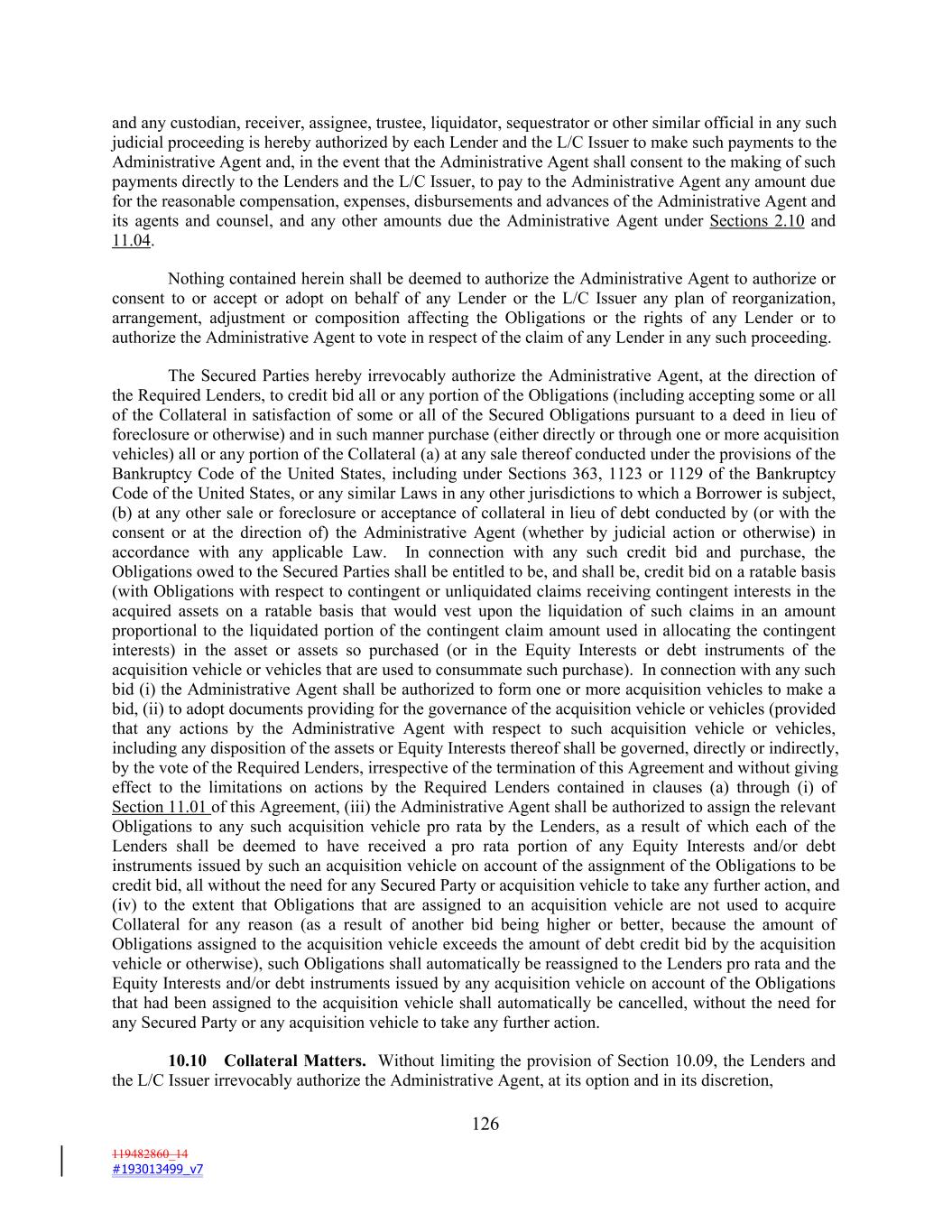 and any custodian, receiver, assignee, trustee, liquidator, sequestrator or other similar official in any such judicial proceeding is hereby authorized by each Lender and the L/C Issuer to make such payments to the Administrative Agent and, in the event that the Administrative Agent shall consent to the making of such payments directly to the Lenders and the L/C Issuer, to pay to the Administrative Agent any amount due for the reasonable compensation, expenses, disbursements and advances of the Administrative Agent and its agents and counsel, and any other amounts due the Administrative Agent under Sections 2.10 and 11.04. Nothing contained herein shall be deemed to authorize the Administrative Agent to authorize or consent to or accept or adopt on behalf of any Lender or the L/C Issuer any plan of reorganization, arrangement, adjustment or composition affecting the Obligations or the rights of any Lender or to authorize the Administrative Agent to vote in respect of the claim of any Lender in any such proceeding. The Secured Parties hereby irrevocably authorize the Administrative Agent, at the direction of the Required Lenders, to credit bid all or any portion of the Obligations (including accepting some or all of the Collateral in satisfaction of some or all of the Secured Obligations pursuant to a deed in lieu of foreclosure or otherwise) and in such manner purchase (either directly or through one or more acquisition vehicles) all or any portion of the Collateral (a) at any sale thereof conducted under the provisions of the Bankruptcy Code of the United States, including under Sections 363, 1123 or 1129 of the Bankruptcy Code of the United States, or any similar Laws in any other jurisdictions to which a Borrower is subject, (b) at any other sale or foreclosure or acceptance of collateral in lieu of debt conducted by (or with the consent or at the direction of) the Administrative Agent (whether by judicial action or otherwise) in accordance with any applicable Law. In connection with any such credit bid and purchase, the Obligations owed to the Secured Parties shall be entitled to be, and shall be, credit bid on a ratable basis (with Obligations with respect to contingent or unliquidated claims receiving contingent interests in the acquired assets on a ratable basis that would vest upon the liquidation of such claims in an amount proportional to the liquidated portion of the contingent claim amount used in allocating the contingent interests) in the asset or assets so purchased (or in the Equity Interests or debt instruments of the acquisition vehicle or vehicles that are used to consummate such purchase). In connection with any such bid (i) the Administrative Agent shall be authorized to form one or more acquisition vehicles to make a bid, (ii) to adopt documents providing for the governance of the acquisition vehicle or vehicles (provided that any actions by the Administrative Agent with respect to such acquisition vehicle or vehicles, including any disposition of the assets or Equity Interests thereof shall be governed, directly or indirectly, by the vote of the Required Lenders, irrespective of the termination of this Agreement and without giving effect to the limitations on actions by the Required Lenders contained in clauses (a) through (i) of Section 11.01 of this Agreement, (iii) the Administrative Agent shall be authorized to assign the relevant Obligations to any such acquisition vehicle pro rata by the Lenders, as a result of which each of the Lenders shall be deemed to have received a pro rata portion of any Equity Interests and/or debt instruments issued by such an acquisition vehicle on account of the assignment of the Obligations to be credit bid, all without the need for any Secured Party or acquisition vehicle to take any further action, and (iv) to the extent that Obligations that are assigned to an acquisition vehicle are not used to acquire Collateral for any reason (as a result of another bid being higher or better, because the amount of Obligations assigned to the acquisition vehicle exceeds the amount of debt credit bid by the acquisition vehicle or otherwise), such Obligations shall automatically be reassigned to the Lenders pro rata and the Equity Interests and/or debt instruments issued by any acquisition vehicle on account of the Obligations that had been assigned to the acquisition vehicle shall automatically be cancelled, without the need for any Secured Party or any acquisition vehicle to take any further action. 10.10 Collateral Matters. Without limiting the provision of Section 10.09, the Lenders and the L/C Issuer irrevocably authorize the Administrative Agent, at its option and in its discretion, 126 119482860_14 #193013499_v7