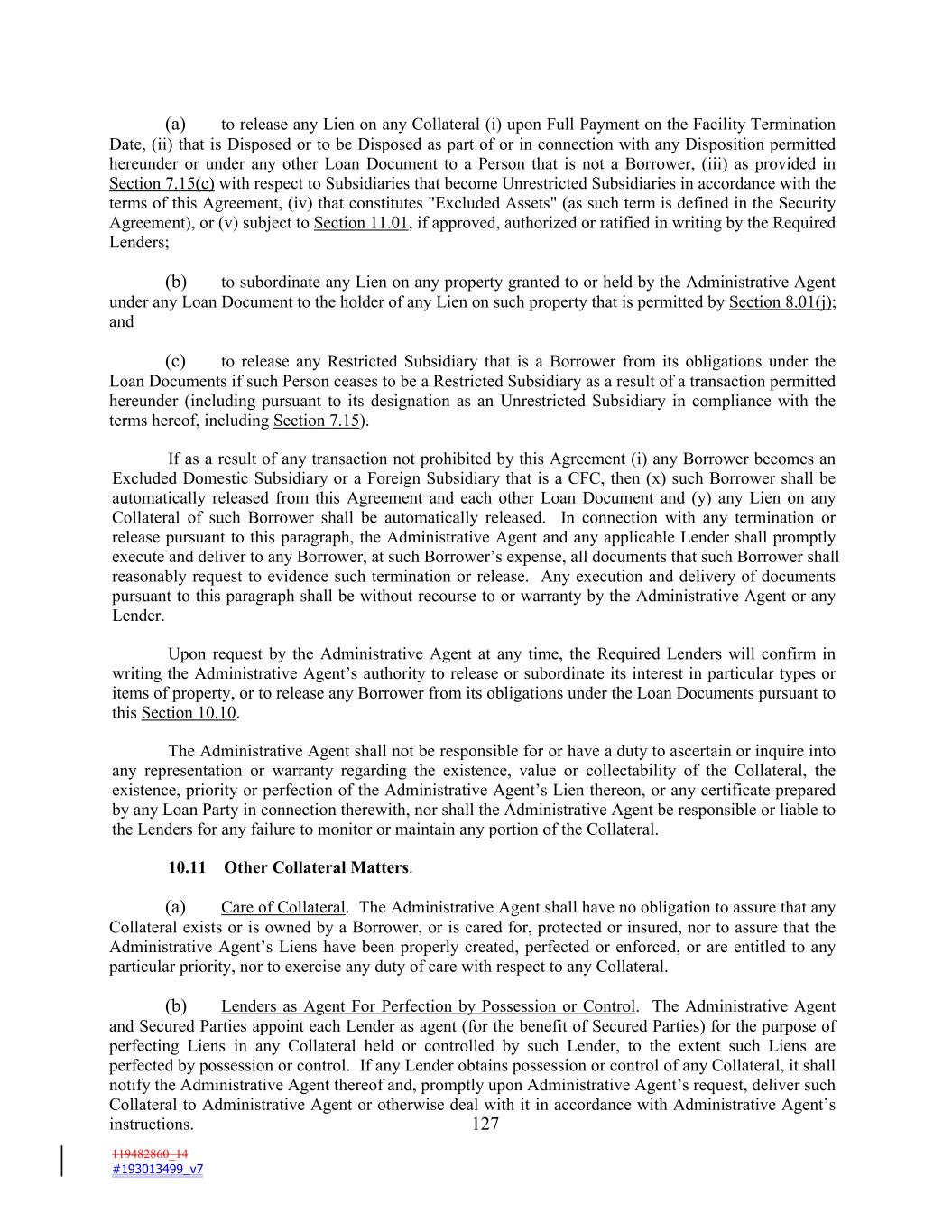 (a) to release any Lien on any Collateral (i) upon Full Payment on the Facility Termination Date, (ii) that is Disposed or to be Disposed as part of or in connection with any Disposition permitted hereunder or under any other Loan Document to a Person that is not a Borrower, (iii) as provided in Section 7.15(c) with respect to Subsidiaries that become Unrestricted Subsidiaries in accordance with the terms of this Agreement, (iv) that constitutes "Excluded Assets" (as such term is defined in the Security Agreement), or (v) subject to Section 11.01, if approved, authorized or ratified in writing by the Required Lenders; (b) to subordinate any Lien on any property granted to or held by the Administrative Agent under any Loan Document to the holder of any Lien on such property that is permitted by Section 8.01(j); and (c) to release any Restricted Subsidiary that is a Borrower from its obligations under the Loan Documents if such Person ceases to be a Restricted Subsidiary as a result of a transaction permitted hereunder (including pursuant to its designation as an Unrestricted Subsidiary in compliance with the terms hereof, including Section 7.15). If as a result of any transaction not prohibited by this Agreement (i) any Borrower becomes an Excluded Domestic Subsidiary or a Foreign Subsidiary that is a CFC, then (x) such Borrower shall be automatically released from this Agreement and each other Loan Document and (y) any Lien on any Collateral of such Borrower shall be automatically released. In connection with any termination or release pursuant to this paragraph, the Administrative Agent and any applicable Lender shall promptly execute and deliver to any Borrower, at such Borrower’s expense, all documents that such Borrower shall reasonably request to evidence such termination or release. Any execution and delivery of documents pursuant to this paragraph shall be without recourse to or warranty by the Administrative Agent or any Lender. Upon request by the Administrative Agent at any time, the Required Lenders will confirm in writing the Administrative Agent’s authority to release or subordinate its interest in particular types or items of property, or to release any Borrower from its obligations under the Loan Documents pursuant to this Section 10.10. The Administrative Agent shall not be responsible for or have a duty to ascertain or inquire into any representation or warranty regarding the existence, value or collectability of the Collateral, the existence, priority or perfection of the Administrative Agent’s Lien thereon, or any certificate prepared by any Loan Party in connection therewith, nor shall the Administrative Agent be responsible or liable to the Lenders for any failure to monitor or maintain any portion of the Collateral. 10.11 Other Collateral Matters. (a) Care of Collateral. The Administrative Agent shall have no obligation to assure that any Collateral exists or is owned by a Borrower, or is cared for, protected or insured, nor to assure that the Administrative Agent’s Liens have been properly created, perfected or enforced, or are entitled to any particular priority, nor to exercise any duty of care with respect to any Collateral. (b) Lenders as Agent For Perfection by Possession or Control. The Administrative Agent and Secured Parties appoint each Lender as agent (for the benefit of Secured Parties) for the purpose of perfecting Liens in any Collateral held or controlled by such Lender, to the extent such Liens are perfected by possession or control. If any Lender obtains possession or control of any Collateral, it shall notify the Administrative Agent thereof and, promptly upon Administrative Agent’s request, deliver such Collateral to Administrative Agent or otherwise deal with it in accordance with Administrative Agent’s instructions. 127 119482860_14 #193013499_v7