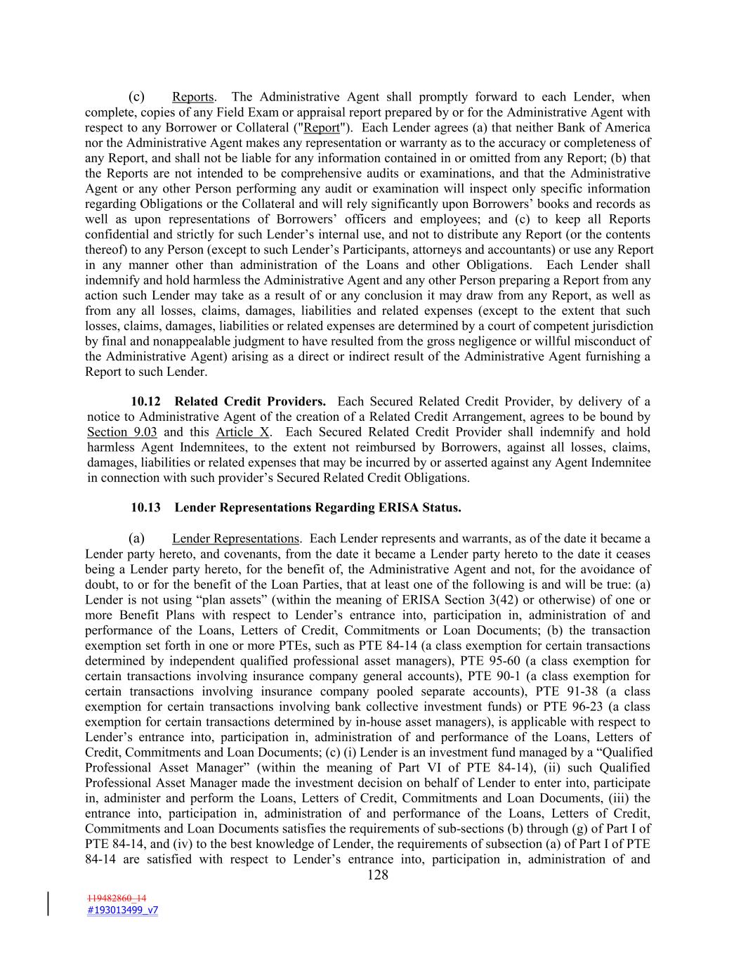 (c) Reports. The Administrative Agent shall promptly forward to each Lender, when complete, copies of any Field Exam or appraisal report prepared by or for the Administrative Agent with respect to any Borrower or Collateral ("Report"). Each Lender agrees (a) that neither Bank of America nor the Administrative Agent makes any representation or warranty as to the accuracy or completeness of any Report, and shall not be liable for any information contained in or omitted from any Report; (b) that the Reports are not intended to be comprehensive audits or examinations, and that the Administrative Agent or any other Person performing any audit or examination will inspect only specific information regarding Obligations or the Collateral and will rely significantly upon Borrowers’ books and records as well as upon representations of Borrowers’ officers and employees; and (c) to keep all Reports confidential and strictly for such Lender’s internal use, and not to distribute any Report (or the contents thereof) to any Person (except to such Lender’s Participants, attorneys and accountants) or use any Report in any manner other than administration of the Loans and other Obligations. Each Lender shall indemnify and hold harmless the Administrative Agent and any other Person preparing a Report from any action such Lender may take as a result of or any conclusion it may draw from any Report, as well as from any all losses, claims, damages, liabilities and related expenses (except to the extent that such losses, claims, damages, liabilities or related expenses are determined by a court of competent jurisdiction by final and nonappealable judgment to have resulted from the gross negligence or willful misconduct of the Administrative Agent) arising as a direct or indirect result of the Administrative Agent furnishing a Report to such Lender. 10.12 Related Credit Providers. Each Secured Related Credit Provider, by delivery of a notice to Administrative Agent of the creation of a Related Credit Arrangement, agrees to be bound by Section 9.03 and this Article X. Each Secured Related Credit Provider shall indemnify and hold harmless Agent Indemnitees, to the extent not reimbursed by Borrowers, against all losses, claims, damages, liabilities or related expenses that may be incurred by or asserted against any Agent Indemnitee in connection with such provider’s Secured Related Credit Obligations. 10.13 Lender Representations Regarding ERISA Status. (a) Lender Representations. Each Lender represents and warrants, as of the date it became a Lender party hereto, and covenants, from the date it became a Lender party hereto to the date it ceases being a Lender party hereto, for the benefit of, the Administrative Agent and not, for the avoidance of doubt, to or for the benefit of the Loan Parties, that at least one of the following is and will be true: (a) Lender is not using “plan assets” (within the meaning of ERISA Section 3(42) or otherwise) of one or more Benefit Plans with respect to Lender’s entrance into, participation in, administration of and performance of the Loans, Letters of Credit, Commitments or Loan Documents; (b) the transaction exemption set forth in one or more PTEs, such as PTE 84-14 (a class exemption for certain transactions determined by independent qualified professional asset managers), PTE 95-60 (a class exemption for certain transactions involving insurance company general accounts), PTE 90-1 (a class exemption for certain transactions involving insurance company pooled separate accounts), PTE 91-38 (a class exemption for certain transactions involving bank collective investment funds) or PTE 96-23 (a class exemption for certain transactions determined by in-house asset managers), is applicable with respect to Lender’s entrance into, participation in, administration of and performance of the Loans, Letters of Credit, Commitments and Loan Documents; (c) (i) Lender is an investment fund managed by a “Qualified Professional Asset Manager” (within the meaning of Part VI of PTE 84-14), (ii) such Qualified Professional Asset Manager made the investment decision on behalf of Lender to enter into, participate in, administer and perform the Loans, Letters of Credit, Commitments and Loan Documents, (iii) the entrance into, participation in, administration of and performance of the Loans, Letters of Credit, Commitments and Loan Documents satisfies the requirements of sub-sections (b) through (g) of Part I of PTE 84-14, and (iv) to the best knowledge of Lender, the requirements of subsection (a) of Part I of PTE 84-14 are satisfied with respect to Lender’s entrance into, participation in, administration of and 128 119482860_14 #193013499_v7
