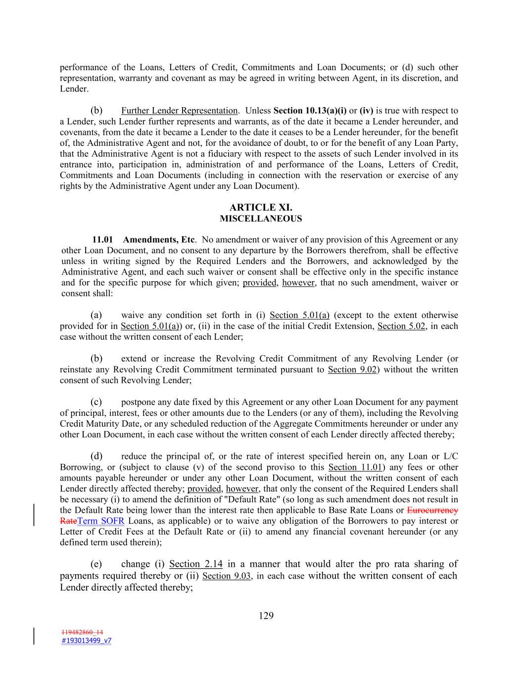performance of the Loans, Letters of Credit, Commitments and Loan Documents; or (d) such other representation, warranty and covenant as may be agreed in writing between Agent, in its discretion, and Lender. (b) Further Lender Representation. Unless Section 10.13(a)(i) or (iv) is true with respect to a Lender, such Lender further represents and warrants, as of the date it became a Lender hereunder, and covenants, from the date it became a Lender to the date it ceases to be a Lender hereunder, for the benefit of, the Administrative Agent and not, for the avoidance of doubt, to or for the benefit of any Loan Party, that the Administrative Agent is not a fiduciary with respect to the assets of such Lender involved in its entrance into, participation in, administration of and performance of the Loans, Letters of Credit, Commitments and Loan Documents (including in connection with the reservation or exercise of any rights by the Administrative Agent under any Loan Document). ARTICLE XI. MISCELLANEOUS 11.01 Amendments, Etc. No amendment or waiver of any provision of this Agreement or any other Loan Document, and no consent to any departure by the Borrowers therefrom, shall be effective unless in writing signed by the Required Lenders and the Borrowers, and acknowledged by the Administrative Agent, and each such waiver or consent shall be effective only in the specific instance and for the specific purpose for which given; provided, however, that no such amendment, waiver or consent shall: (a) waive any condition set forth in (i) Section 5.01(a) (except to the extent otherwise provided for in Section 5.01(a)) or, (ii) in the case of the initial Credit Extension, Section 5.02, in each case without the written consent of each Lender; (b) extend or increase the Revolving Credit Commitment of any Revolving Lender (or reinstate any Revolving Credit Commitment terminated pursuant to Section 9.02) without the written consent of such Revolving Lender; (c) postpone any date fixed by this Agreement or any other Loan Document for any payment of principal, interest, fees or other amounts due to the Lenders (or any of them), including the Revolving Credit Maturity Date, or any scheduled reduction of the Aggregate Commitments hereunder or under any other Loan Document, in each case without the written consent of each Lender directly affected thereby; (d) reduce the principal of, or the rate of interest specified herein on, any Loan or L/C Borrowing, or (subject to clause (v) of the second proviso to this Section 11.01) any fees or other amounts payable hereunder or under any other Loan Document, without the written consent of each Lender directly affected thereby; provided, however, that only the consent of the Required Lenders shall be necessary (i) to amend the definition of "Default Rate" (so long as such amendment does not result in the Default Rate being lower than the interest rate then applicable to Base Rate Loans or Eurocurrency RateTerm SOFR Loans, as applicable) or to waive any obligation of the Borrowers to pay interest or Letter of Credit Fees at the Default Rate or (ii) to amend any financial covenant hereunder (or any defined term used therein); (e) change (i) Section 2.14 in a manner that would alter the pro rata sharing of payments required thereby or (ii) Section 9.03, in each case without the written consent of each Lender directly affected thereby; 129 119482860_14 #193013499_v7