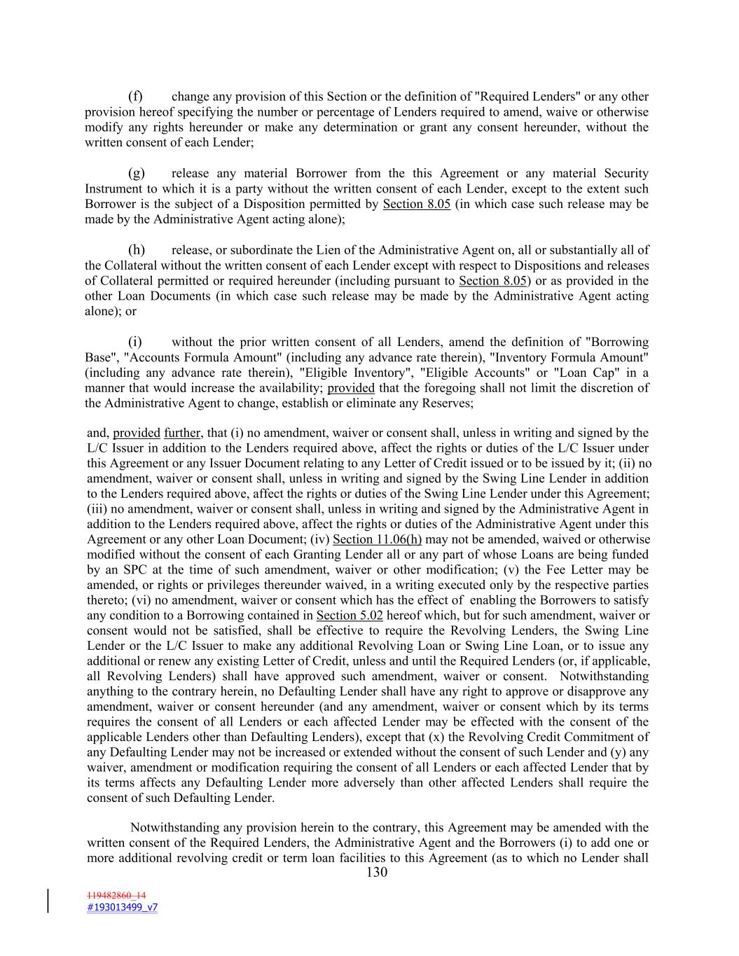 (f) change any provision of this Section or the definition of "Required Lenders" or any other provision hereof specifying the number or percentage of Lenders required to amend, waive or otherwise modify any rights hereunder or make any determination or grant any consent hereunder, without the written consent of each Lender; (g) release any material Borrower from the this Agreement or any material Security Instrument to which it is a party without the written consent of each Lender, except to the extent such Borrower is the subject of a Disposition permitted by Section 8.05 (in which case such release may be made by the Administrative Agent acting alone); (h) release, or subordinate the Lien of the Administrative Agent on, all or substantially all of the Collateral without the written consent of each Lender except with respect to Dispositions and releases of Collateral permitted or required hereunder (including pursuant to Section 8.05) or as provided in the other Loan Documents (in which case such release may be made by the Administrative Agent acting alone); or (i) without the prior written consent of all Lenders, amend the definition of "Borrowing Base", "Accounts Formula Amount" (including any advance rate therein), "Inventory Formula Amount" (including any advance rate therein), "Eligible Inventory", "Eligible Accounts" or "Loan Cap" in a manner that would increase the availability; provided that the foregoing shall not limit the discretion of the Administrative Agent to change, establish or eliminate any Reserves; and, provided further, that (i) no amendment, waiver or consent shall, unless in writing and signed by the L/C Issuer in addition to the Lenders required above, affect the rights or duties of the L/C Issuer under this Agreement or any Issuer Document relating to any Letter of Credit issued or to be issued by it; (ii) no amendment, waiver or consent shall, unless in writing and signed by the Swing Line Lender in addition to the Lenders required above, affect the rights or duties of the Swing Line Lender under this Agreement; (iii) no amendment, waiver or consent shall, unless in writing and signed by the Administrative Agent in addition to the Lenders required above, affect the rights or duties of the Administrative Agent under this Agreement or any other Loan Document; (iv) Section 11.06(h) may not be amended, waived or otherwise modified without the consent of each Granting Lender all or any part of whose Loans are being funded by an SPC at the time of such amendment, waiver or other modification; (v) the Fee Letter may be amended, or rights or privileges thereunder waived, in a writing executed only by the respective parties thereto; (vi) no amendment, waiver or consent which has the effect of enabling the Borrowers to satisfy any condition to a Borrowing contained in Section 5.02 hereof which, but for such amendment, waiver or consent would not be satisfied, shall be effective to require the Revolving Lenders, the Swing Line Lender or the L/C Issuer to make any additional Revolving Loan or Swing Line Loan, or to issue any additional or renew any existing Letter of Credit, unless and until the Required Lenders (or, if applicable, all Revolving Lenders) shall have approved such amendment, waiver or consent. Notwithstanding anything to the contrary herein, no Defaulting Lender shall have any right to approve or disapprove any amendment, waiver or consent hereunder (and any amendment, waiver or consent which by its terms requires the consent of all Lenders or each affected Lender may be effected with the consent of the applicable Lenders other than Defaulting Lenders), except that (x) the Revolving Credit Commitment of any Defaulting Lender may not be increased or extended without the consent of such Lender and (y) any waiver, amendment or modification requiring the consent of all Lenders or each affected Lender that by its terms affects any Defaulting Lender more adversely than other affected Lenders shall require the consent of such Defaulting Lender. Notwithstanding any provision herein to the contrary, this Agreement may be amended with the written consent of the Required Lenders, the Administrative Agent and the Borrowers (i) to add one or more additional revolving credit or term loan facilities to this Agreement (as to which no Lender shall 130 119482860_14 #193013499_v7