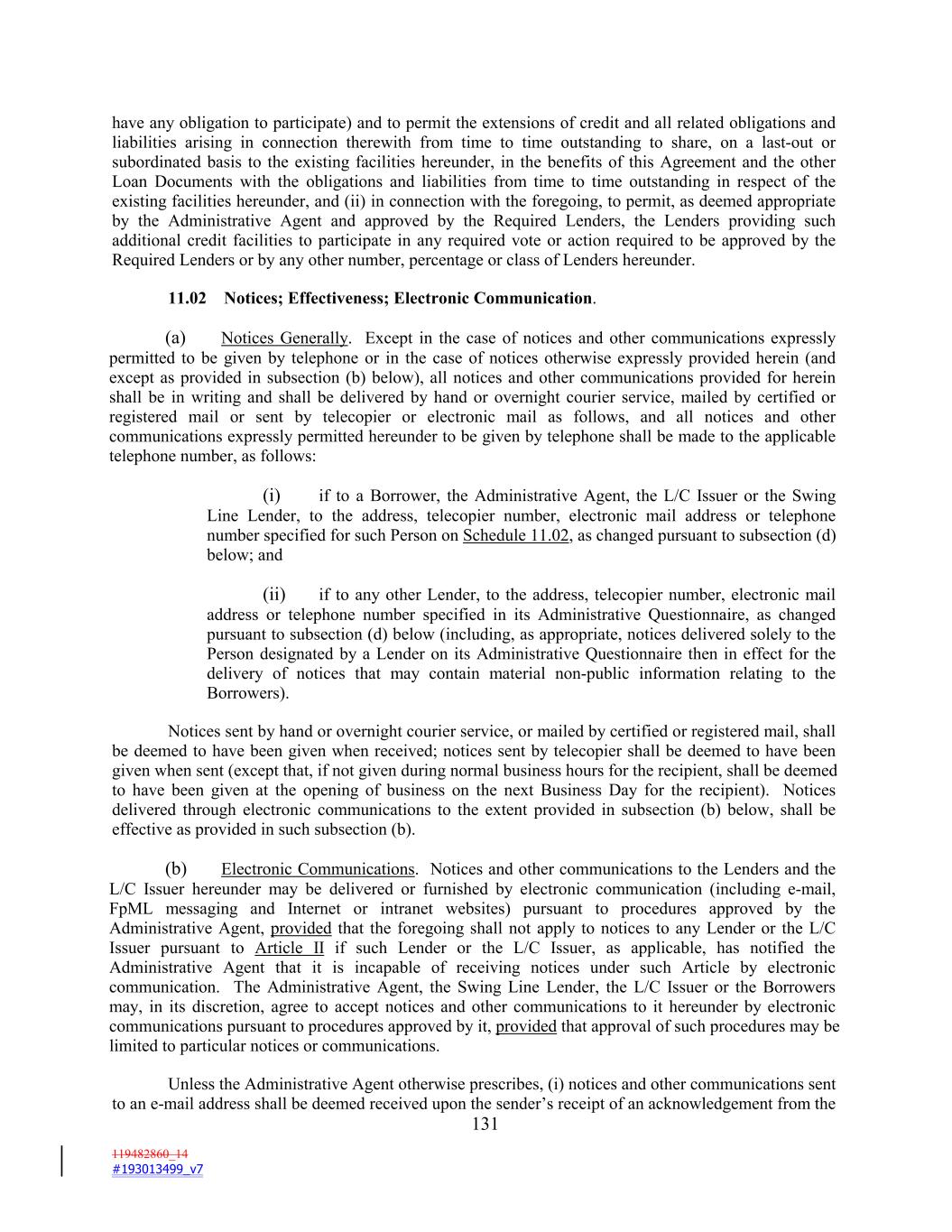 have any obligation to participate) and to permit the extensions of credit and all related obligations and liabilities arising in connection therewith from time to time outstanding to share, on a last-out or subordinated basis to the existing facilities hereunder, in the benefits of this Agreement and the other Loan Documents with the obligations and liabilities from time to time outstanding in respect of the existing facilities hereunder, and (ii) in connection with the foregoing, to permit, as deemed appropriate by the Administrative Agent and approved by the Required Lenders, the Lenders providing such additional credit facilities to participate in any required vote or action required to be approved by the Required Lenders or by any other number, percentage or class of Lenders hereunder. 11.02 Notices; Effectiveness; Electronic Communication. (a) Notices Generally. Except in the case of notices and other communications expressly permitted to be given by telephone or in the case of notices otherwise expressly provided herein (and except as provided in subsection (b) below), all notices and other communications provided for herein shall be in writing and shall be delivered by hand or overnight courier service, mailed by certified or registered mail or sent by telecopier or electronic mail as follows, and all notices and other communications expressly permitted hereunder to be given by telephone shall be made to the applicable telephone number, as follows: (i) if to a Borrower, the Administrative Agent, the L/C Issuer or the Swing Line Lender, to the address, telecopier number, electronic mail address or telephone number specified for such Person on Schedule 11.02, as changed pursuant to subsection (d) below; and (ii) if to any other Lender, to the address, telecopier number, electronic mail address or telephone number specified in its Administrative Questionnaire, as changed pursuant to subsection (d) below (including, as appropriate, notices delivered solely to the Person designated by a Lender on its Administrative Questionnaire then in effect for the delivery of notices that may contain material non-public information relating to the Borrowers). Notices sent by hand or overnight courier service, or mailed by certified or registered mail, shall be deemed to have been given when received; notices sent by telecopier shall be deemed to have been given when sent (except that, if not given during normal business hours for the recipient, shall be deemed to have been given at the opening of business on the next Business Day for the recipient). Notices delivered through electronic communications to the extent provided in subsection (b) below, shall be effective as provided in such subsection (b). (b) Electronic Communications. Notices and other communications to the Lenders and the L/C Issuer hereunder may be delivered or furnished by electronic communication (including e-mail, FpML messaging and Internet or intranet websites) pursuant to procedures approved by the Administrative Agent, provided that the foregoing shall not apply to notices to any Lender or the L/C Issuer pursuant to Article II if such Lender or the L/C Issuer, as applicable, has notified the Administrative Agent that it is incapable of receiving notices under such Article by electronic communication. The Administrative Agent, the Swing Line Lender, the L/C Issuer or the Borrowers may, in its discretion, agree to accept notices and other communications to it hereunder by electronic communications pursuant to procedures approved by it, provided that approval of such procedures may be limited to particular notices or communications. Unless the Administrative Agent otherwise prescribes, (i) notices and other communications sent to an e-mail address shall be deemed received upon the sender’s receipt of an acknowledgement from the 131 119482860_14 #193013499_v7