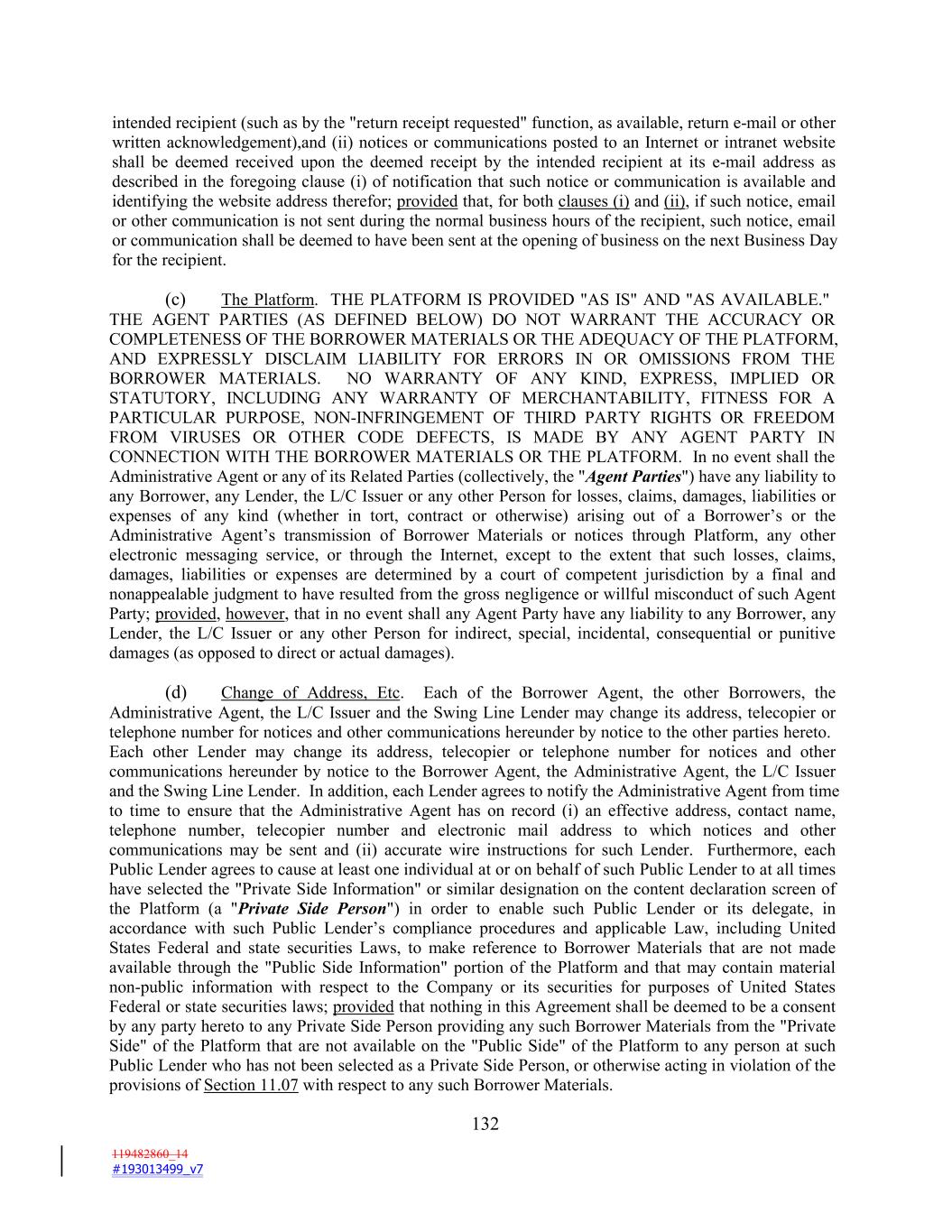 intended recipient (such as by the "return receipt requested" function, as available, return e-mail or other written acknowledgement),and (ii) notices or communications posted to an Internet or intranet website shall be deemed received upon the deemed receipt by the intended recipient at its e-mail address as described in the foregoing clause (i) of notification that such notice or communication is available and identifying the website address therefor; provided that, for both clauses (i) and (ii), if such notice, email or other communication is not sent during the normal business hours of the recipient, such notice, email or communication shall be deemed to have been sent at the opening of business on the next Business Day for the recipient. (c) The Platform. THE PLATFORM IS PROVIDED "AS IS" AND "AS AVAILABLE." THE AGENT PARTIES (AS DEFINED BELOW) DO NOT WARRANT THE ACCURACY OR COMPLETENESS OF THE BORROWER MATERIALS OR THE ADEQUACY OF THE PLATFORM, AND EXPRESSLY DISCLAIM LIABILITY FOR ERRORS IN OR OMISSIONS FROM THE BORROWER MATERIALS. NO WARRANTY OF ANY KIND, EXPRESS, IMPLIED OR STATUTORY, INCLUDING ANY WARRANTY OF MERCHANTABILITY, FITNESS FOR A PARTICULAR PURPOSE, NON-INFRINGEMENT OF THIRD PARTY RIGHTS OR FREEDOM FROM VIRUSES OR OTHER CODE DEFECTS, IS MADE BY ANY AGENT PARTY IN CONNECTION WITH THE BORROWER MATERIALS OR THE PLATFORM. In no event shall the Administrative Agent or any of its Related Parties (collectively, the "Agent Parties") have any liability to any Borrower, any Lender, the L/C Issuer or any other Person for losses, claims, damages, liabilities or expenses of any kind (whether in tort, contract or otherwise) arising out of a Borrower’s or the Administrative Agent’s transmission of Borrower Materials or notices through Platform, any other electronic messaging service, or through the Internet, except to the extent that such losses, claims, damages, liabilities or expenses are determined by a court of competent jurisdiction by a final and nonappealable judgment to have resulted from the gross negligence or willful misconduct of such Agent Party; provided, however, that in no event shall any Agent Party have any liability to any Borrower, any Lender, the L/C Issuer or any other Person for indirect, special, incidental, consequential or punitive damages (as opposed to direct or actual damages). (d) Change of Address, Etc. Each of the Borrower Agent, the other Borrowers, the Administrative Agent, the L/C Issuer and the Swing Line Lender may change its address, telecopier or telephone number for notices and other communications hereunder by notice to the other parties hereto. Each other Lender may change its address, telecopier or telephone number for notices and other communications hereunder by notice to the Borrower Agent, the Administrative Agent, the L/C Issuer and the Swing Line Lender. In addition, each Lender agrees to notify the Administrative Agent from time to time to ensure that the Administrative Agent has on record (i) an effective address, contact name, telephone number, telecopier number and electronic mail address to which notices and other communications may be sent and (ii) accurate wire instructions for such Lender. Furthermore, each Public Lender agrees to cause at least one individual at or on behalf of such Public Lender to at all times have selected the "Private Side Information" or similar designation on the content declaration screen of the Platform (a "Private Side Person") in order to enable such Public Lender or its delegate, in accordance with such Public Lender’s compliance procedures and applicable Law, including United States Federal and state securities Laws, to make reference to Borrower Materials that are not made available through the "Public Side Information" portion of the Platform and that may contain material non-public information with respect to the Company or its securities for purposes of United States Federal or state securities laws; provided that nothing in this Agreement shall be deemed to be a consent by any party hereto to any Private Side Person providing any such Borrower Materials from the "Private Side" of the Platform that are not available on the "Public Side" of the Platform to any person at such Public Lender who has not been selected as a Private Side Person, or otherwise acting in violation of the provisions of Section 11.07 with respect to any such Borrower Materials. 132 119482860_14 #193013499_v7