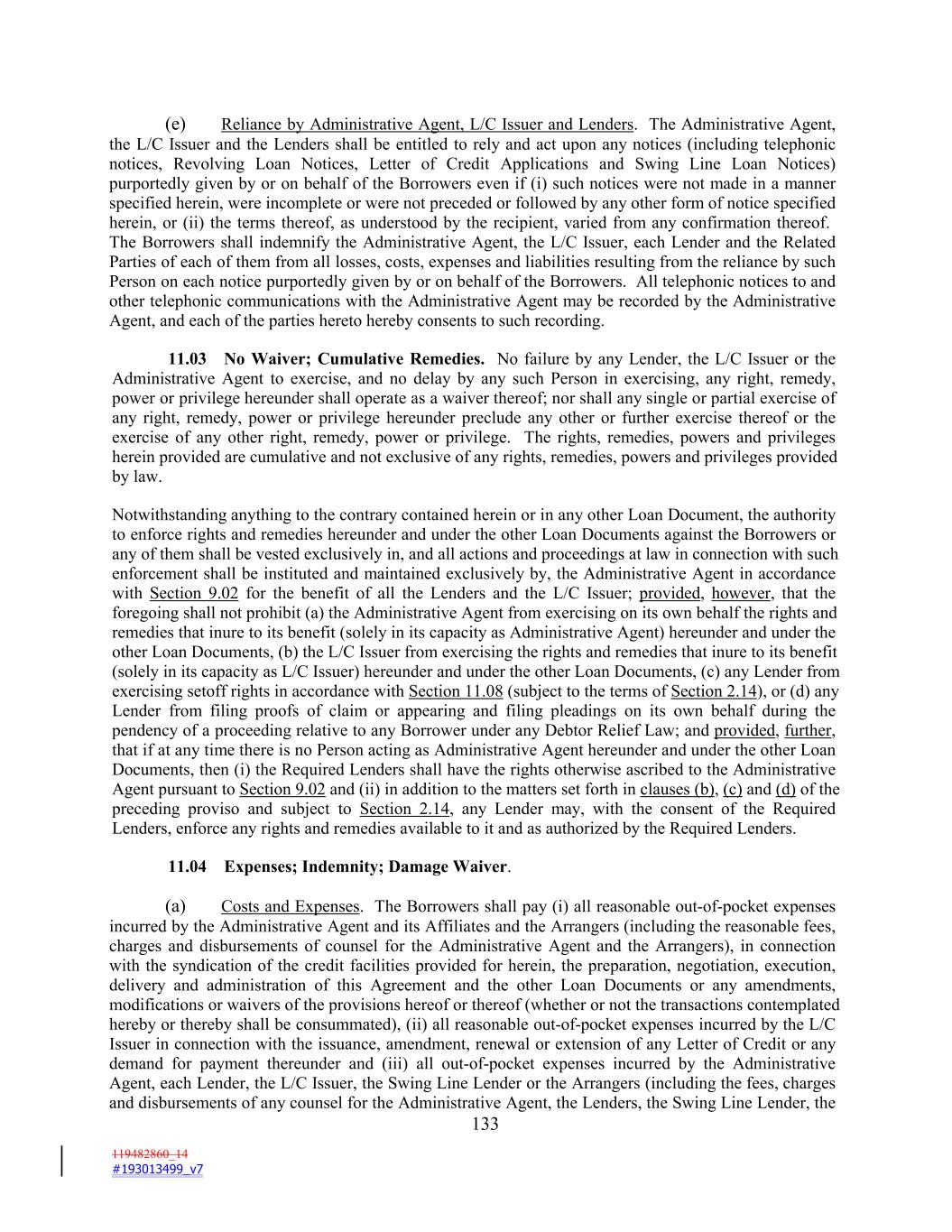 (e) Reliance by Administrative Agent, L/C Issuer and Lenders. The Administrative Agent, the L/C Issuer and the Lenders shall be entitled to rely and act upon any notices (including telephonic notices, Revolving Loan Notices, Letter of Credit Applications and Swing Line Loan Notices) purportedly given by or on behalf of the Borrowers even if (i) such notices were not made in a manner specified herein, were incomplete or were not preceded or followed by any other form of notice specified herein, or (ii) the terms thereof, as understood by the recipient, varied from any confirmation thereof. The Borrowers shall indemnify the Administrative Agent, the L/C Issuer, each Lender and the Related Parties of each of them from all losses, costs, expenses and liabilities resulting from the reliance by such Person on each notice purportedly given by or on behalf of the Borrowers. All telephonic notices to and other telephonic communications with the Administrative Agent may be recorded by the Administrative Agent, and each of the parties hereto hereby consents to such recording. 11.03 No Waiver; Cumulative Remedies. No failure by any Lender, the L/C Issuer or the Administrative Agent to exercise, and no delay by any such Person in exercising, any right, remedy, power or privilege hereunder shall operate as a waiver thereof; nor shall any single or partial exercise of any right, remedy, power or privilege hereunder preclude any other or further exercise thereof or the exercise of any other right, remedy, power or privilege. The rights, remedies, powers and privileges herein provided are cumulative and not exclusive of any rights, remedies, powers and privileges provided by law. Notwithstanding anything to the contrary contained herein or in any other Loan Document, the authority to enforce rights and remedies hereunder and under the other Loan Documents against the Borrowers or any of them shall be vested exclusively in, and all actions and proceedings at law in connection with such enforcement shall be instituted and maintained exclusively by, the Administrative Agent in accordance with Section 9.02 for the benefit of all the Lenders and the L/C Issuer; provided, however, that the foregoing shall not prohibit (a) the Administrative Agent from exercising on its own behalf the rights and remedies that inure to its benefit (solely in its capacity as Administrative Agent) hereunder and under the other Loan Documents, (b) the L/C Issuer from exercising the rights and remedies that inure to its benefit (solely in its capacity as L/C Issuer) hereunder and under the other Loan Documents, (c) any Lender from exercising setoff rights in accordance with Section 11.08 (subject to the terms of Section 2.14), or (d) any Lender from filing proofs of claim or appearing and filing pleadings on its own behalf during the pendency of a proceeding relative to any Borrower under any Debtor Relief Law; and provided, further, that if at any time there is no Person acting as Administrative Agent hereunder and under the other Loan Documents, then (i) the Required Lenders shall have the rights otherwise ascribed to the Administrative Agent pursuant to Section 9.02 and (ii) in addition to the matters set forth in clauses (b), (c) and (d) of the preceding proviso and subject to Section 2.14, any Lender may, with the consent of the Required Lenders, enforce any rights and remedies available to it and as authorized by the Required Lenders. 11.04 Expenses; Indemnity; Damage Waiver. (a) Costs and Expenses. The Borrowers shall pay (i) all reasonable out-of-pocket expenses incurred by the Administrative Agent and its Affiliates and the Arrangers (including the reasonable fees, charges and disbursements of counsel for the Administrative Agent and the Arrangers), in connection with the syndication of the credit facilities provided for herein, the preparation, negotiation, execution, delivery and administration of this Agreement and the other Loan Documents or any amendments, modifications or waivers of the provisions hereof or thereof (whether or not the transactions contemplated hereby or thereby shall be consummated), (ii) all reasonable out-of-pocket expenses incurred by the L/C Issuer in connection with the issuance, amendment, renewal or extension of any Letter of Credit or any demand for payment thereunder and (iii) all out-of-pocket expenses incurred by the Administrative Agent, each Lender, the L/C Issuer, the Swing Line Lender or the Arrangers (including the fees, charges and disbursements of any counsel for the Administrative Agent, the Lenders, the Swing Line Lender, the 133 119482860_14 #193013499_v7