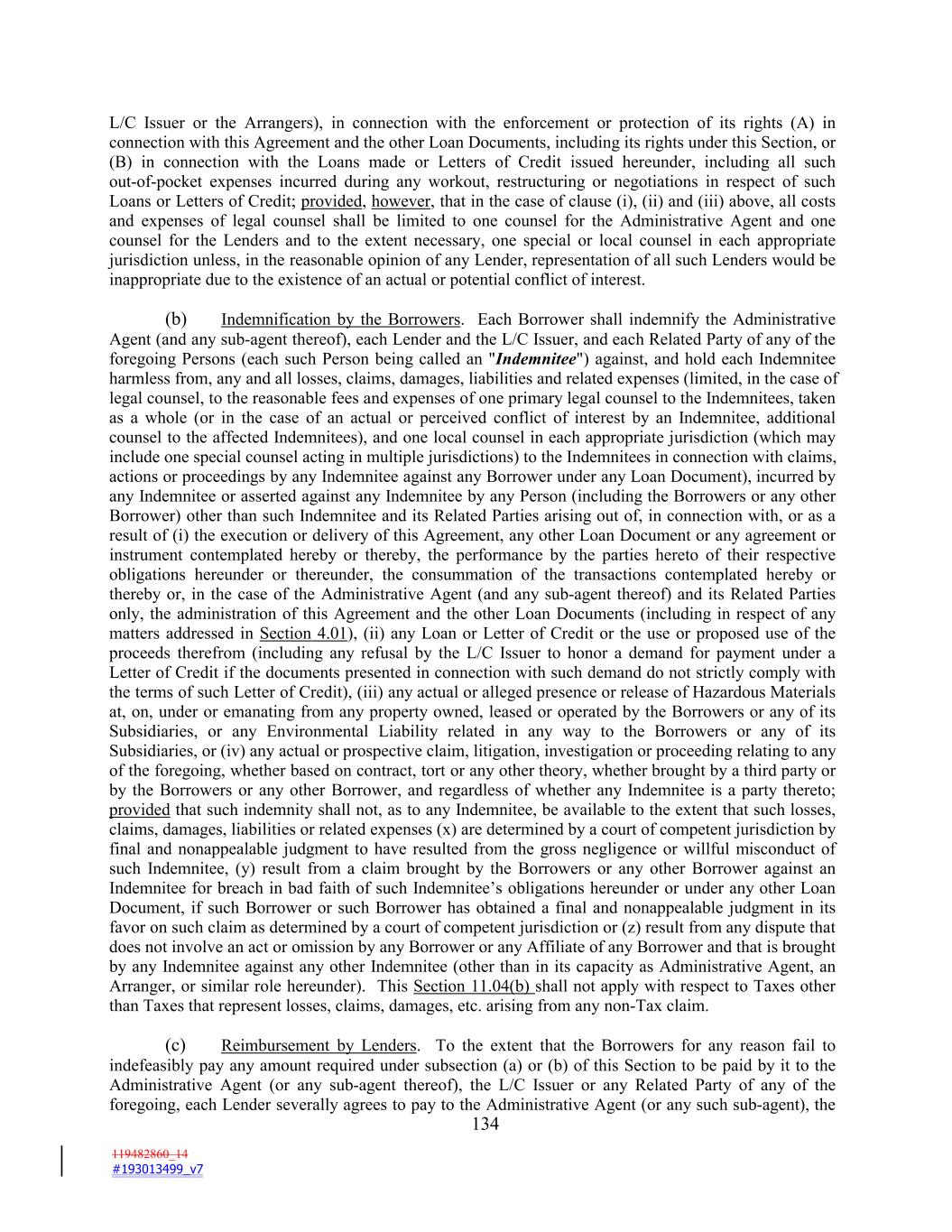 L/C Issuer or the Arrangers), in connection with the enforcement or protection of its rights (A) in connection with this Agreement and the other Loan Documents, including its rights under this Section, or (B) in connection with the Loans made or Letters of Credit issued hereunder, including all such out-of-pocket expenses incurred during any workout, restructuring or negotiations in respect of such Loans or Letters of Credit; provided, however, that in the case of clause (i), (ii) and (iii) above, all costs and expenses of legal counsel shall be limited to one counsel for the Administrative Agent and one counsel for the Lenders and to the extent necessary, one special or local counsel in each appropriate jurisdiction unless, in the reasonable opinion of any Lender, representation of all such Lenders would be inappropriate due to the existence of an actual or potential conflict of interest. (b) Indemnification by the Borrowers. Each Borrower shall indemnify the Administrative Agent (and any sub-agent thereof), each Lender and the L/C Issuer, and each Related Party of any of the foregoing Persons (each such Person being called an "Indemnitee") against, and hold each Indemnitee harmless from, any and all losses, claims, damages, liabilities and related expenses (limited, in the case of legal counsel, to the reasonable fees and expenses of one primary legal counsel to the Indemnitees, taken as a whole (or in the case of an actual or perceived conflict of interest by an Indemnitee, additional counsel to the affected Indemnitees), and one local counsel in each appropriate jurisdiction (which may include one special counsel acting in multiple jurisdictions) to the Indemnitees in connection with claims, actions or proceedings by any Indemnitee against any Borrower under any Loan Document), incurred by any Indemnitee or asserted against any Indemnitee by any Person (including the Borrowers or any other Borrower) other than such Indemnitee and its Related Parties arising out of, in connection with, or as a result of (i) the execution or delivery of this Agreement, any other Loan Document or any agreement or instrument contemplated hereby or thereby, the performance by the parties hereto of their respective obligations hereunder or thereunder, the consummation of the transactions contemplated hereby or thereby or, in the case of the Administrative Agent (and any sub-agent thereof) and its Related Parties only, the administration of this Agreement and the other Loan Documents (including in respect of any matters addressed in Section 4.01), (ii) any Loan or Letter of Credit or the use or proposed use of the proceeds therefrom (including any refusal by the L/C Issuer to honor a demand for payment under a Letter of Credit if the documents presented in connection with such demand do not strictly comply with the terms of such Letter of Credit), (iii) any actual or alleged presence or release of Hazardous Materials at, on, under or emanating from any property owned, leased or operated by the Borrowers or any of its Subsidiaries, or any Environmental Liability related in any way to the Borrowers or any of its Subsidiaries, or (iv) any actual or prospective claim, litigation, investigation or proceeding relating to any of the foregoing, whether based on contract, tort or any other theory, whether brought by a third party or by the Borrowers or any other Borrower, and regardless of whether any Indemnitee is a party thereto; provided that such indemnity shall not, as to any Indemnitee, be available to the extent that such losses, claims, damages, liabilities or related expenses (x) are determined by a court of competent jurisdiction by final and nonappealable judgment to have resulted from the gross negligence or willful misconduct of such Indemnitee, (y) result from a claim brought by the Borrowers or any other Borrower against an Indemnitee for breach in bad faith of such Indemnitee’s obligations hereunder or under any other Loan Document, if such Borrower or such Borrower has obtained a final and nonappealable judgment in its favor on such claim as determined by a court of competent jurisdiction or (z) result from any dispute that does not involve an act or omission by any Borrower or any Affiliate of any Borrower and that is brought by any Indemnitee against any other Indemnitee (other than in its capacity as Administrative Agent, an Arranger, or similar role hereunder). This Section 11.04(b) shall not apply with respect to Taxes other than Taxes that represent losses, claims, damages, etc. arising from any non-Tax claim. (c) Reimbursement by Lenders. To the extent that the Borrowers for any reason fail to indefeasibly pay any amount required under subsection (a) or (b) of this Section to be paid by it to the Administrative Agent (or any sub-agent thereof), the L/C Issuer or any Related Party of any of the foregoing, each Lender severally agrees to pay to the Administrative Agent (or any such sub-agent), the 134 119482860_14 #193013499_v7