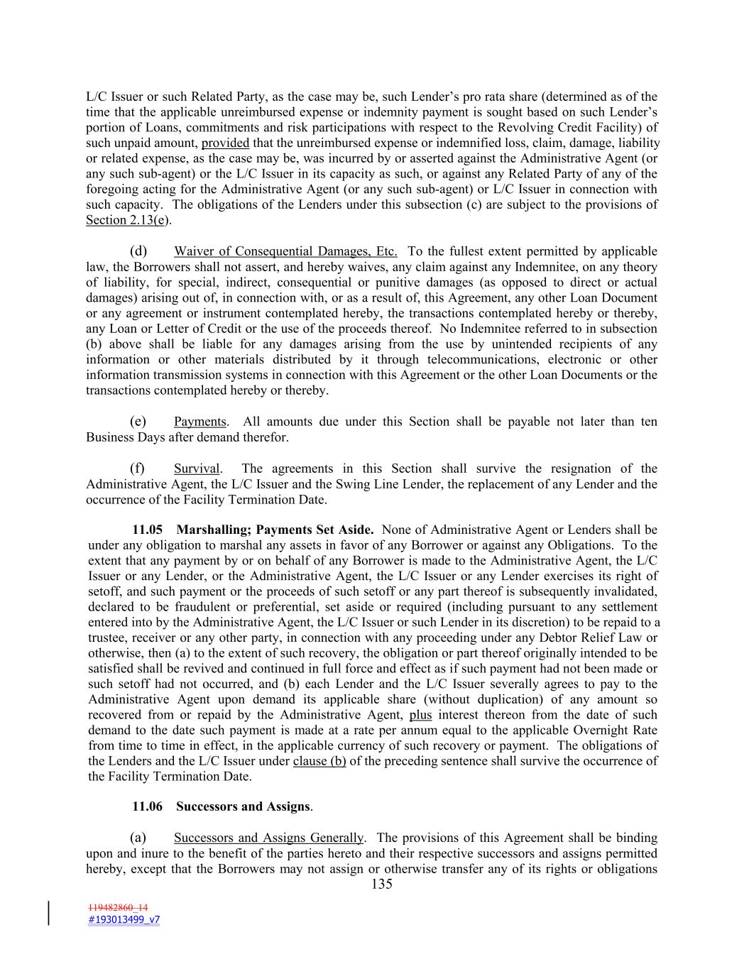 L/C Issuer or such Related Party, as the case may be, such Lender’s pro rata share (determined as of the time that the applicable unreimbursed expense or indemnity payment is sought based on such Lender’s portion of Loans, commitments and risk participations with respect to the Revolving Credit Facility) of such unpaid amount, provided that the unreimbursed expense or indemnified loss, claim, damage, liability or related expense, as the case may be, was incurred by or asserted against the Administrative Agent (or any such sub-agent) or the L/C Issuer in its capacity as such, or against any Related Party of any of the foregoing acting for the Administrative Agent (or any such sub-agent) or L/C Issuer in connection with such capacity. The obligations of the Lenders under this subsection (c) are subject to the provisions of Section 2.13(e). (d) Waiver of Consequential Damages, Etc. To the fullest extent permitted by applicable law, the Borrowers shall not assert, and hereby waives, any claim against any Indemnitee, on any theory of liability, for special, indirect, consequential or punitive damages (as opposed to direct or actual damages) arising out of, in connection with, or as a result of, this Agreement, any other Loan Document or any agreement or instrument contemplated hereby, the transactions contemplated hereby or thereby, any Loan or Letter of Credit or the use of the proceeds thereof. No Indemnitee referred to in subsection (b) above shall be liable for any damages arising from the use by unintended recipients of any information or other materials distributed by it through telecommunications, electronic or other information transmission systems in connection with this Agreement or the other Loan Documents or the transactions contemplated hereby or thereby. (e) Payments. All amounts due under this Section shall be payable not later than ten Business Days after demand therefor. (f) Survival. The agreements in this Section shall survive the resignation of the Administrative Agent, the L/C Issuer and the Swing Line Lender, the replacement of any Lender and the occurrence of the Facility Termination Date. 11.05 Marshalling; Payments Set Aside. None of Administrative Agent or Lenders shall be under any obligation to marshal any assets in favor of any Borrower or against any Obligations. To the extent that any payment by or on behalf of any Borrower is made to the Administrative Agent, the L/C Issuer or any Lender, or the Administrative Agent, the L/C Issuer or any Lender exercises its right of setoff, and such payment or the proceeds of such setoff or any part thereof is subsequently invalidated, declared to be fraudulent or preferential, set aside or required (including pursuant to any settlement entered into by the Administrative Agent, the L/C Issuer or such Lender in its discretion) to be repaid to a trustee, receiver or any other party, in connection with any proceeding under any Debtor Relief Law or otherwise, then (a) to the extent of such recovery, the obligation or part thereof originally intended to be satisfied shall be revived and continued in full force and effect as if such payment had not been made or such setoff had not occurred, and (b) each Lender and the L/C Issuer severally agrees to pay to the Administrative Agent upon demand its applicable share (without duplication) of any amount so recovered from or repaid by the Administrative Agent, plus interest thereon from the date of such demand to the date such payment is made at a rate per annum equal to the applicable Overnight Rate from time to time in effect, in the applicable currency of such recovery or payment. The obligations of the Lenders and the L/C Issuer under clause (b) of the preceding sentence shall survive the occurrence of the Facility Termination Date. 11.06 Successors and Assigns. (a) Successors and Assigns Generally. The provisions of this Agreement shall be binding upon and inure to the benefit of the parties hereto and their respective successors and assigns permitted hereby, except that the Borrowers may not assign or otherwise transfer any of its rights or obligations 135 119482860_14 #193013499_v7