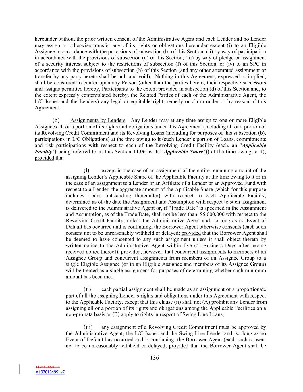 hereunder without the prior written consent of the Administrative Agent and each Lender and no Lender may assign or otherwise transfer any of its rights or obligations hereunder except (i) to an Eligible Assignee in accordance with the provisions of subsection (b) of this Section, (ii) by way of participation in accordance with the provisions of subsection (d) of this Section, (iii) by way of pledge or assignment of a security interest subject to the restrictions of subsection (f) of this Section, or (iv) to an SPC in accordance with the provisions of subsection (h) of this Section (and any other attempted assignment or transfer by any party hereto shall be null and void). Nothing in this Agreement, expressed or implied, shall be construed to confer upon any Person (other than the parties hereto, their respective successors and assigns permitted hereby, Participants to the extent provided in subsection (d) of this Section and, to the extent expressly contemplated hereby, the Related Parties of each of the Administrative Agent, the L/C Issuer and the Lenders) any legal or equitable right, remedy or claim under or by reason of this Agreement. (b) Assignments by Lenders. Any Lender may at any time assign to one or more Eligible Assignees all or a portion of its rights and obligations under this Agreement (including all or a portion of its Revolving Credit Commitment and its Revolving Loans (including for purposes of this subsection (b), participations in L/C Obligations) at the time owing to it (such Lender’s portion of Loans, commitments and risk participations with respect to each of the Revolving Credit Facility (each, an "Applicable Facility") being referred to in this Section 11.06 as its "Applicable Share")) at the time owing to it); provided that (i) except in the case of an assignment of the entire remaining amount of the assigning Lender’s Applicable Share of the Applicable Facility at the time owing to it or in the case of an assignment to a Lender or an Affiliate of a Lender or an Approved Fund with respect to a Lender, the aggregate amount of the Applicable Share (which for this purpose includes Loans outstanding thereunder) with respect to each Applicable Facility, determined as of the date the Assignment and Assumption with respect to such assignment is delivered to the Administrative Agent or, if "Trade Date" is specified in the Assignment and Assumption, as of the Trade Date, shall not be less than $5,000,000 with respect to the Revolving Credit Facility, unless the Administrative Agent and, so long as no Event of Default has occurred and is continuing, the Borrower Agent otherwise consents (each such consent not to be unreasonably withheld or delayed; provided that the Borrower Agent shall be deemed to have consented to any such assignment unless it shall object thereto by written notice to the Administrative Agent within five (5) Business Days after having received notice thereof), provided, however, that concurrent assignments to members of an Assignee Group and concurrent assignments from members of an Assignee Group to a single Eligible Assignee (or to an Eligible Assignee and members of its Assignee Group) will be treated as a single assignment for purposes of determining whether such minimum amount has been met; (ii) each partial assignment shall be made as an assignment of a proportionate part of all the assigning Lender’s rights and obligations under this Agreement with respect to the Applicable Facility, except that this clause (ii) shall not (A) prohibit any Lender from assigning all or a portion of its rights and obligations among the Applicable Facilities on a non-pro rata basis or (B) apply to rights in respect of Swing Line Loans; (iii) any assignment of a Revolving Credit Commitment must be approved by the Administrative Agent, the L/C Issuer and the Swing Line Lender and, so long as no Event of Default has occurred and is continuing, the Borrower Agent (each such consent not to be unreasonably withheld or delayed; provided that the Borrower Agent shall be 136 119482860_14 #193013499_v7