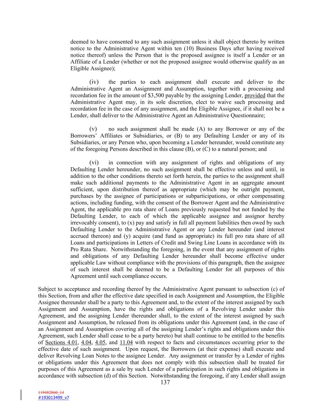 deemed to have consented to any such assignment unless it shall object thereto by written notice to the Administrative Agent within ten (10) Business Days after having received notice thereof) unless the Person that is the proposed assignee is itself a Lender or an Affiliate of a Lender (whether or not the proposed assignee would otherwise qualify as an Eligible Assignee); (iv) the parties to each assignment shall execute and deliver to the Administrative Agent an Assignment and Assumption, together with a processing and recordation fee in the amount of $3,500 payable by the assigning Lender, provided that the Administrative Agent may, in its sole discretion, elect to waive such processing and recordation fee in the case of any assignment, and the Eligible Assignee, if it shall not be a Lender, shall deliver to the Administrative Agent an Administrative Questionnaire; (v) no such assignment shall be made (A) to any Borrower or any of the Borrowers’ Affiliates or Subsidiaries, or (B) to any Defaulting Lender or any of its Subsidiaries, or any Person who, upon becoming a Lender hereunder, would constitute any of the foregoing Persons described in this clause (B), or (C) to a natural person; and (vi) in connection with any assignment of rights and obligations of any Defaulting Lender hereunder, no such assignment shall be effective unless and until, in addition to the other conditions thereto set forth herein, the parties to the assignment shall make such additional payments to the Administrative Agent in an aggregate amount sufficient, upon distribution thereof as appropriate (which may be outright payment, purchases by the assignee of participations or subparticipations, or other compensating actions, including funding, with the consent of the Borrower Agent and the Administrative Agent, the applicable pro rata share of Loans previously requested but not funded by the Defaulting Lender, to each of which the applicable assignee and assignor hereby irrevocably consent), to (x) pay and satisfy in full all payment liabilities then owed by such Defaulting Lender to the Administrative Agent or any Lender hereunder (and interest accrued thereon) and (y) acquire (and fund as appropriate) its full pro rata share of all Loans and participations in Letters of Credit and Swing Line Loans in accordance with its Pro Rata Share. Notwithstanding the foregoing, in the event that any assignment of rights and obligations of any Defaulting Lender hereunder shall become effective under applicable Law without compliance with the provisions of this paragraph, then the assignee of such interest shall be deemed to be a Defaulting Lender for all purposes of this Agreement until such compliance occurs. Subject to acceptance and recording thereof by the Administrative Agent pursuant to subsection (c) of this Section, from and after the effective date specified in each Assignment and Assumption, the Eligible Assignee thereunder shall be a party to this Agreement and, to the extent of the interest assigned by such Assignment and Assumption, have the rights and obligations of a Revolving Lender under this Agreement, and the assigning Lender thereunder shall, to the extent of the interest assigned by such Assignment and Assumption, be released from its obligations under this Agreement (and, in the case of an Assignment and Assumption covering all of the assigning Lender’s rights and obligations under this Agreement, such Lender shall cease to be a party hereto) but shall continue to be entitled to the benefits of Sections 4.01, 4.04, 4.05, and 11.04 with respect to facts and circumstances occurring prior to the effective date of such assignment. Upon request, the Borrowers (at their expense) shall execute and deliver Revolving Loan Notes to the assignee Lender. Any assignment or transfer by a Lender of rights or obligations under this Agreement that does not comply with this subsection shall be treated for purposes of this Agreement as a sale by such Lender of a participation in such rights and obligations in accordance with subsection (d) of this Section. Notwithstanding the foregoing, if any Lender shall assign 137 119482860_14 #193013499_v7