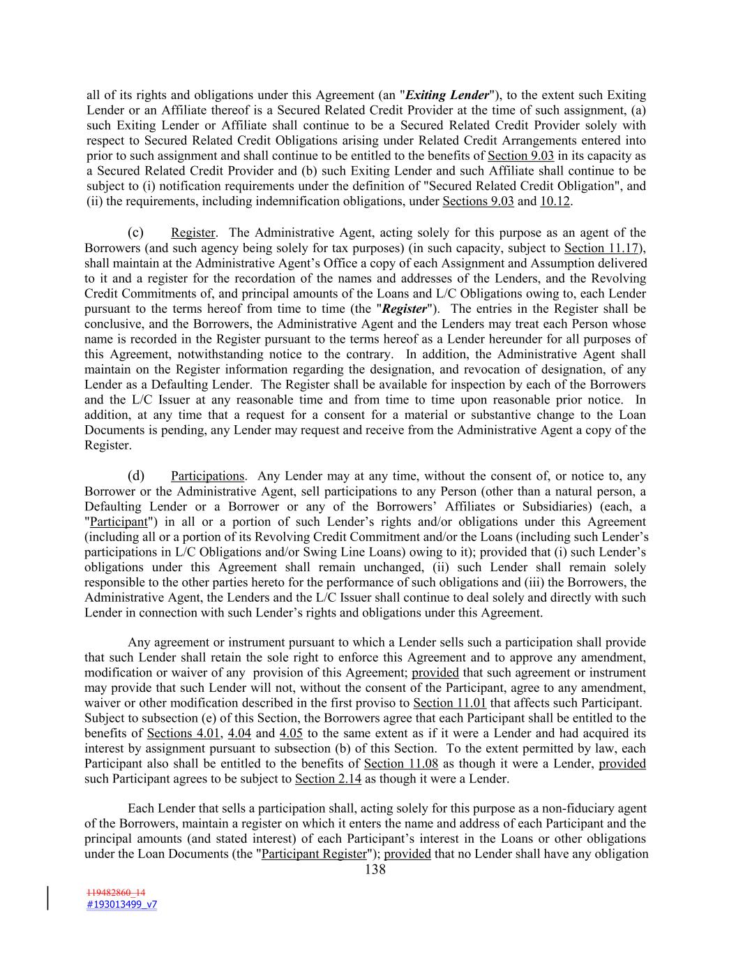 all of its rights and obligations under this Agreement (an "Exiting Lender"), to the extent such Exiting Lender or an Affiliate thereof is a Secured Related Credit Provider at the time of such assignment, (a) such Exiting Lender or Affiliate shall continue to be a Secured Related Credit Provider solely with respect to Secured Related Credit Obligations arising under Related Credit Arrangements entered into prior to such assignment and shall continue to be entitled to the benefits of Section 9.03 in its capacity as a Secured Related Credit Provider and (b) such Exiting Lender and such Affiliate shall continue to be subject to (i) notification requirements under the definition of "Secured Related Credit Obligation", and (ii) the requirements, including indemnification obligations, under Sections 9.03 and 10.12. (c) Register. The Administrative Agent, acting solely for this purpose as an agent of the Borrowers (and such agency being solely for tax purposes) (in such capacity, subject to Section 11.17), shall maintain at the Administrative Agent’s Office a copy of each Assignment and Assumption delivered to it and a register for the recordation of the names and addresses of the Lenders, and the Revolving Credit Commitments of, and principal amounts of the Loans and L/C Obligations owing to, each Lender pursuant to the terms hereof from time to time (the "Register"). The entries in the Register shall be conclusive, and the Borrowers, the Administrative Agent and the Lenders may treat each Person whose name is recorded in the Register pursuant to the terms hereof as a Lender hereunder for all purposes of this Agreement, notwithstanding notice to the contrary. In addition, the Administrative Agent shall maintain on the Register information regarding the designation, and revocation of designation, of any Lender as a Defaulting Lender. The Register shall be available for inspection by each of the Borrowers and the L/C Issuer at any reasonable time and from time to time upon reasonable prior notice. In addition, at any time that a request for a consent for a material or substantive change to the Loan Documents is pending, any Lender may request and receive from the Administrative Agent a copy of the Register. (d) Participations. Any Lender may at any time, without the consent of, or notice to, any Borrower or the Administrative Agent, sell participations to any Person (other than a natural person, a Defaulting Lender or a Borrower or any of the Borrowers’ Affiliates or Subsidiaries) (each, a "Participant") in all or a portion of such Lender’s rights and/or obligations under this Agreement (including all or a portion of its Revolving Credit Commitment and/or the Loans (including such Lender’s participations in L/C Obligations and/or Swing Line Loans) owing to it); provided that (i) such Lender’s obligations under this Agreement shall remain unchanged, (ii) such Lender shall remain solely responsible to the other parties hereto for the performance of such obligations and (iii) the Borrowers, the Administrative Agent, the Lenders and the L/C Issuer shall continue to deal solely and directly with such Lender in connection with such Lender’s rights and obligations under this Agreement. Any agreement or instrument pursuant to which a Lender sells such a participation shall provide that such Lender shall retain the sole right to enforce this Agreement and to approve any amendment, modification or waiver of any provision of this Agreement; provided that such agreement or instrument may provide that such Lender will not, without the consent of the Participant, agree to any amendment, waiver or other modification described in the first proviso to Section 11.01 that affects such Participant. Subject to subsection (e) of this Section, the Borrowers agree that each Participant shall be entitled to the benefits of Sections 4.01, 4.04 and 4.05 to the same extent as if it were a Lender and had acquired its interest by assignment pursuant to subsection (b) of this Section. To the extent permitted by law, each Participant also shall be entitled to the benefits of Section 11.08 as though it were a Lender, provided such Participant agrees to be subject to Section 2.14 as though it were a Lender. Each Lender that sells a participation shall, acting solely for this purpose as a non-fiduciary agent of the Borrowers, maintain a register on which it enters the name and address of each Participant and the principal amounts (and stated interest) of each Participant’s interest in the Loans or other obligations under the Loan Documents (the "Participant Register"); provided that no Lender shall have any obligation 138 119482860_14 #193013499_v7