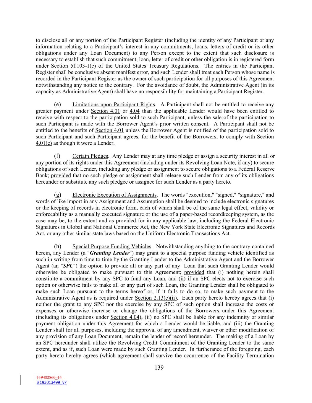 to disclose all or any portion of the Participant Register (including the identity of any Participant or any information relating to a Participant’s interest in any commitments, loans, letters of credit or its other obligations under any Loan Document) to any Person except to the extent that such disclosure is necessary to establish that such commitment, loan, letter of credit or other obligation is in registered form under Section 5f.103-1(c) of the United States Treasury Regulations. The entries in the Participant Register shall be conclusive absent manifest error, and such Lender shall treat each Person whose name is recorded in the Participant Register as the owner of such participation for all purposes of this Agreement notwithstanding any notice to the contrary. For the avoidance of doubt, the Administrative Agent (in its capacity as Administrative Agent) shall have no responsibility for maintaining a Participant Register. (e) Limitations upon Participant Rights. A Participant shall not be entitled to receive any greater payment under Section 4.01 or 4.04 than the applicable Lender would have been entitled to receive with respect to the participation sold to such Participant, unless the sale of the participation to such Participant is made with the Borrower Agent’s prior written consent. A Participant shall not be entitled to the benefits of Section 4.01 unless the Borrower Agent is notified of the participation sold to such Participant and such Participant agrees, for the benefit of the Borrowers, to comply with Section 4.01(e) as though it were a Lender. (f) Certain Pledges. Any Lender may at any time pledge or assign a security interest in all or any portion of its rights under this Agreement (including under its Revolving Loan Note, if any) to secure obligations of such Lender, including any pledge or assignment to secure obligations to a Federal Reserve Bank; provided that no such pledge or assignment shall release such Lender from any of its obligations hereunder or substitute any such pledgee or assignee for such Lender as a party hereto. (g) Electronic Execution of Assignments. The words "execution," "signed," "signature," and words of like import in any Assignment and Assumption shall be deemed to include electronic signatures or the keeping of records in electronic form, each of which shall be of the same legal effect, validity or enforceability as a manually executed signature or the use of a paper-based recordkeeping system, as the case may be, to the extent and as provided for in any applicable law, including the Federal Electronic Signatures in Global and National Commerce Act, the New York State Electronic Signatures and Records Act, or any other similar state laws based on the Uniform Electronic Transactions Act. (h) Special Purpose Funding Vehicles. Notwithstanding anything to the contrary contained herein, any Lender (a "Granting Lender") may grant to a special purpose funding vehicle identified as such in writing from time to time by the Granting Lender to the Administrative Agent and the Borrower Agent (an "SPC") the option to provide all or any part of any Loan that such Granting Lender would otherwise be obligated to make pursuant to this Agreement; provided that (i) nothing herein shall constitute a commitment by any SPC to fund any Loan, and (ii) if an SPC elects not to exercise such option or otherwise fails to make all or any part of such Loan, the Granting Lender shall be obligated to make such Loan pursuant to the terms hereof or, if it fails to do so, to make such payment to the Administrative Agent as is required under Section 2.13(c)(ii). Each party hereto hereby agrees that (i) neither the grant to any SPC nor the exercise by any SPC of such option shall increase the costs or expenses or otherwise increase or change the obligations of the Borrowers under this Agreement (including its obligations under Section 4.04), (ii) no SPC shall be liable for any indemnity or similar payment obligation under this Agreement for which a Lender would be liable, and (iii) the Granting Lender shall for all purposes, including the approval of any amendment, waiver or other modification of any provision of any Loan Document, remain the lender of record hereunder. The making of a Loan by an SPC hereunder shall utilize the Revolving Credit Commitment of the Granting Lender to the same extent, and as if, such Loan were made by such Granting Lender. In furtherance of the foregoing, each party hereto hereby agrees (which agreement shall survive the occurrence of the Facility Termination 139 119482860_14 #193013499_v7