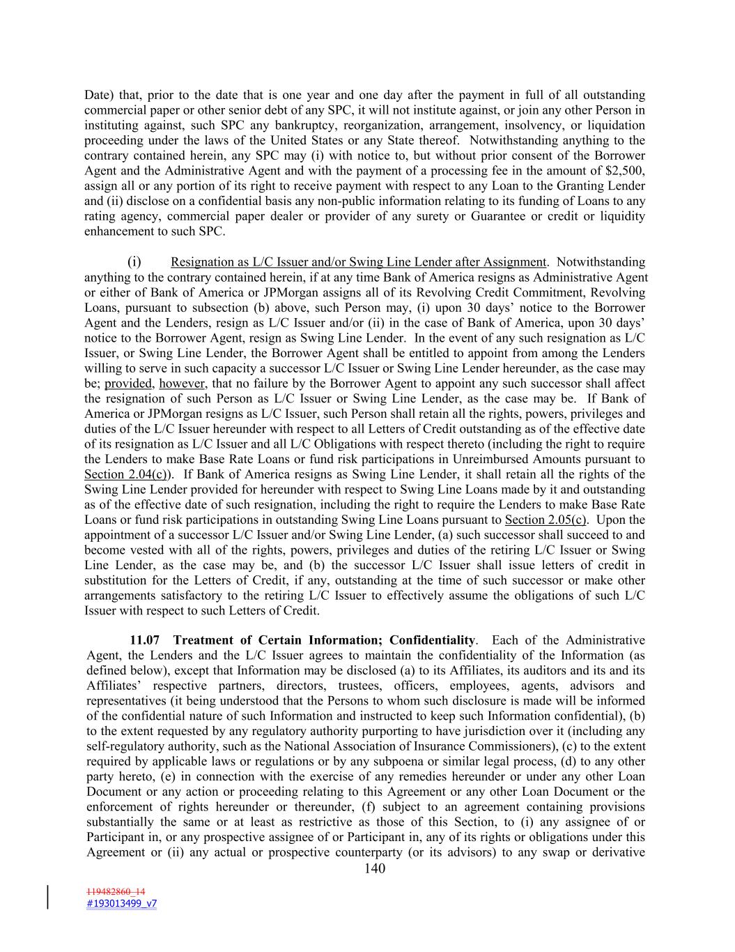 Date) that, prior to the date that is one year and one day after the payment in full of all outstanding commercial paper or other senior debt of any SPC, it will not institute against, or join any other Person in instituting against, such SPC any bankruptcy, reorganization, arrangement, insolvency, or liquidation proceeding under the laws of the United States or any State thereof. Notwithstanding anything to the contrary contained herein, any SPC may (i) with notice to, but without prior consent of the Borrower Agent and the Administrative Agent and with the payment of a processing fee in the amount of $2,500, assign all or any portion of its right to receive payment with respect to any Loan to the Granting Lender and (ii) disclose on a confidential basis any non-public information relating to its funding of Loans to any rating agency, commercial paper dealer or provider of any surety or Guarantee or credit or liquidity enhancement to such SPC. (i) Resignation as L/C Issuer and/or Swing Line Lender after Assignment. Notwithstanding anything to the contrary contained herein, if at any time Bank of America resigns as Administrative Agent or either of Bank of America or JPMorgan assigns all of its Revolving Credit Commitment, Revolving Loans, pursuant to subsection (b) above, such Person may, (i) upon 30 days’ notice to the Borrower Agent and the Lenders, resign as L/C Issuer and/or (ii) in the case of Bank of America, upon 30 days’ notice to the Borrower Agent, resign as Swing Line Lender. In the event of any such resignation as L/C Issuer, or Swing Line Lender, the Borrower Agent shall be entitled to appoint from among the Lenders willing to serve in such capacity a successor L/C Issuer or Swing Line Lender hereunder, as the case may be; provided, however, that no failure by the Borrower Agent to appoint any such successor shall affect the resignation of such Person as L/C Issuer or Swing Line Lender, as the case may be. If Bank of America or JPMorgan resigns as L/C Issuer, such Person shall retain all the rights, powers, privileges and duties of the L/C Issuer hereunder with respect to all Letters of Credit outstanding as of the effective date of its resignation as L/C Issuer and all L/C Obligations with respect thereto (including the right to require the Lenders to make Base Rate Loans or fund risk participations in Unreimbursed Amounts pursuant to Section 2.04(c)). If Bank of America resigns as Swing Line Lender, it shall retain all the rights of the Swing Line Lender provided for hereunder with respect to Swing Line Loans made by it and outstanding as of the effective date of such resignation, including the right to require the Lenders to make Base Rate Loans or fund risk participations in outstanding Swing Line Loans pursuant to Section 2.05(c). Upon the appointment of a successor L/C Issuer and/or Swing Line Lender, (a) such successor shall succeed to and become vested with all of the rights, powers, privileges and duties of the retiring L/C Issuer or Swing Line Lender, as the case may be, and (b) the successor L/C Issuer shall issue letters of credit in substitution for the Letters of Credit, if any, outstanding at the time of such successor or make other arrangements satisfactory to the retiring L/C Issuer to effectively assume the obligations of such L/C Issuer with respect to such Letters of Credit. 11.07 Treatment of Certain Information; Confidentiality. Each of the Administrative Agent, the Lenders and the L/C Issuer agrees to maintain the confidentiality of the Information (as defined below), except that Information may be disclosed (a) to its Affiliates, its auditors and its and its Affiliates’ respective partners, directors, trustees, officers, employees, agents, advisors and representatives (it being understood that the Persons to whom such disclosure is made will be informed of the confidential nature of such Information and instructed to keep such Information confidential), (b) to the extent requested by any regulatory authority purporting to have jurisdiction over it (including any self-regulatory authority, such as the National Association of Insurance Commissioners), (c) to the extent required by applicable laws or regulations or by any subpoena or similar legal process, (d) to any other party hereto, (e) in connection with the exercise of any remedies hereunder or under any other Loan Document or any action or proceeding relating to this Agreement or any other Loan Document or the enforcement of rights hereunder or thereunder, (f) subject to an agreement containing provisions substantially the same or at least as restrictive as those of this Section, to (i) any assignee of or Participant in, or any prospective assignee of or Participant in, any of its rights or obligations under this Agreement or (ii) any actual or prospective counterparty (or its advisors) to any swap or derivative 140 119482860_14 #193013499_v7