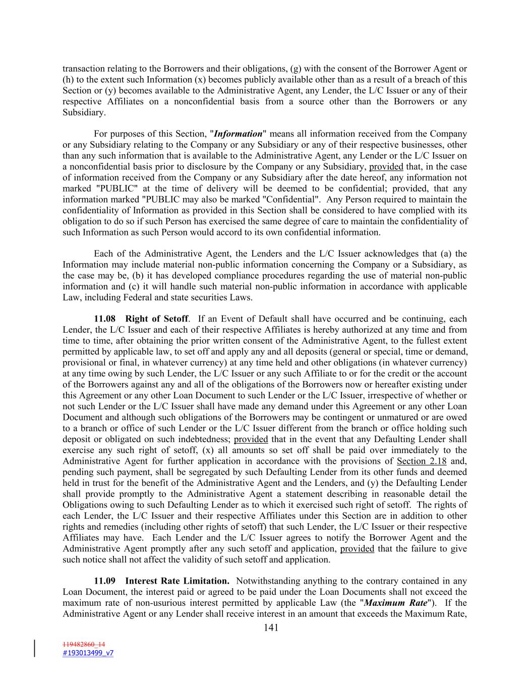 transaction relating to the Borrowers and their obligations, (g) with the consent of the Borrower Agent or (h) to the extent such Information (x) becomes publicly available other than as a result of a breach of this Section or (y) becomes available to the Administrative Agent, any Lender, the L/C Issuer or any of their respective Affiliates on a nonconfidential basis from a source other than the Borrowers or any Subsidiary. For purposes of this Section, "Information" means all information received from the Company or any Subsidiary relating to the Company or any Subsidiary or any of their respective businesses, other than any such information that is available to the Administrative Agent, any Lender or the L/C Issuer on a nonconfidential basis prior to disclosure by the Company or any Subsidiary, provided that, in the case of information received from the Company or any Subsidiary after the date hereof, any information not marked "PUBLIC" at the time of delivery will be deemed to be confidential; provided, that any information marked "PUBLIC may also be marked "Confidential". Any Person required to maintain the confidentiality of Information as provided in this Section shall be considered to have complied with its obligation to do so if such Person has exercised the same degree of care to maintain the confidentiality of such Information as such Person would accord to its own confidential information. Each of the Administrative Agent, the Lenders and the L/C Issuer acknowledges that (a) the Information may include material non-public information concerning the Company or a Subsidiary, as the case may be, (b) it has developed compliance procedures regarding the use of material non-public information and (c) it will handle such material non-public information in accordance with applicable Law, including Federal and state securities Laws. 11.08 Right of Setoff. If an Event of Default shall have occurred and be continuing, each Lender, the L/C Issuer and each of their respective Affiliates is hereby authorized at any time and from time to time, after obtaining the prior written consent of the Administrative Agent, to the fullest extent permitted by applicable law, to set off and apply any and all deposits (general or special, time or demand, provisional or final, in whatever currency) at any time held and other obligations (in whatever currency) at any time owing by such Lender, the L/C Issuer or any such Affiliate to or for the credit or the account of the Borrowers against any and all of the obligations of the Borrowers now or hereafter existing under this Agreement or any other Loan Document to such Lender or the L/C Issuer, irrespective of whether or not such Lender or the L/C Issuer shall have made any demand under this Agreement or any other Loan Document and although such obligations of the Borrowers may be contingent or unmatured or are owed to a branch or office of such Lender or the L/C Issuer different from the branch or office holding such deposit or obligated on such indebtedness; provided that in the event that any Defaulting Lender shall exercise any such right of setoff, (x) all amounts so set off shall be paid over immediately to the Administrative Agent for further application in accordance with the provisions of Section 2.18 and, pending such payment, shall be segregated by such Defaulting Lender from its other funds and deemed held in trust for the benefit of the Administrative Agent and the Lenders, and (y) the Defaulting Lender shall provide promptly to the Administrative Agent a statement describing in reasonable detail the Obligations owing to such Defaulting Lender as to which it exercised such right of setoff. The rights of each Lender, the L/C Issuer and their respective Affiliates under this Section are in addition to other rights and remedies (including other rights of setoff) that such Lender, the L/C Issuer or their respective Affiliates may have. Each Lender and the L/C Issuer agrees to notify the Borrower Agent and the Administrative Agent promptly after any such setoff and application, provided that the failure to give such notice shall not affect the validity of such setoff and application. 11.09 Interest Rate Limitation. Notwithstanding anything to the contrary contained in any Loan Document, the interest paid or agreed to be paid under the Loan Documents shall not exceed the maximum rate of non-usurious interest permitted by applicable Law (the "Maximum Rate"). If the Administrative Agent or any Lender shall receive interest in an amount that exceeds the Maximum Rate, 141 119482860_14 #193013499_v7