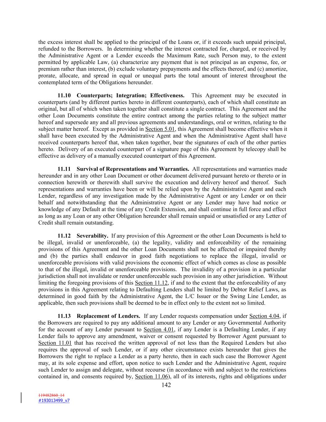 the excess interest shall be applied to the principal of the Loans or, if it exceeds such unpaid principal, refunded to the Borrowers. In determining whether the interest contracted for, charged, or received by the Administrative Agent or a Lender exceeds the Maximum Rate, such Person may, to the extent permitted by applicable Law, (a) characterize any payment that is not principal as an expense, fee, or premium rather than interest, (b) exclude voluntary prepayments and the effects thereof, and (c) amortize, prorate, allocate, and spread in equal or unequal parts the total amount of interest throughout the contemplated term of the Obligations hereunder. 11.10 Counterparts; Integration; Effectiveness. This Agreement may be executed in counterparts (and by different parties hereto in different counterparts), each of which shall constitute an original, but all of which when taken together shall constitute a single contract. This Agreement and the other Loan Documents constitute the entire contract among the parties relating to the subject matter hereof and supersede any and all previous agreements and understandings, oral or written, relating to the subject matter hereof. Except as provided in Section 5.01, this Agreement shall become effective when it shall have been executed by the Administrative Agent and when the Administrative Agent shall have received counterparts hereof that, when taken together, bear the signatures of each of the other parties hereto. Delivery of an executed counterpart of a signature page of this Agreement by telecopy shall be effective as delivery of a manually executed counterpart of this Agreement. 11.11 Survival of Representations and Warranties. All representations and warranties made hereunder and in any other Loan Document or other document delivered pursuant hereto or thereto or in connection herewith or therewith shall survive the execution and delivery hereof and thereof. Such representations and warranties have been or will be relied upon by the Administrative Agent and each Lender, regardless of any investigation made by the Administrative Agent or any Lender or on their behalf and notwithstanding that the Administrative Agent or any Lender may have had notice or knowledge of any Default at the time of any Credit Extension, and shall continue in full force and effect as long as any Loan or any other Obligation hereunder shall remain unpaid or unsatisfied or any Letter of Credit shall remain outstanding. 11.12 Severability. If any provision of this Agreement or the other Loan Documents is held to be illegal, invalid or unenforceable, (a) the legality, validity and enforceability of the remaining provisions of this Agreement and the other Loan Documents shall not be affected or impaired thereby and (b) the parties shall endeavor in good faith negotiations to replace the illegal, invalid or unenforceable provisions with valid provisions the economic effect of which comes as close as possible to that of the illegal, invalid or unenforceable provisions. The invalidity of a provision in a particular jurisdiction shall not invalidate or render unenforceable such provision in any other jurisdiction. Without limiting the foregoing provisions of this Section 11.12, if and to the extent that the enforceability of any provisions in this Agreement relating to Defaulting Lenders shall be limited by Debtor Relief Laws, as determined in good faith by the Administrative Agent, the L/C Issuer or the Swing Line Lender, as applicable, then such provisions shall be deemed to be in effect only to the extent not so limited. 11.13 Replacement of Lenders. If any Lender requests compensation under Section 4.04, if the Borrowers are required to pay any additional amount to any Lender or any Governmental Authority for the account of any Lender pursuant to Section 4.01, if any Lender is a Defaulting Lender, if any Lender fails to approve any amendment, waiver or consent requested by Borrower Agent pursuant to Section 11.01 that has received the written approval of not less than the Required Lenders but also requires the approval of such Lender, or if any other circumstance exists hereunder that gives the Borrowers the right to replace a Lender as a party hereto, then in each such case the Borrower Agent may, at its sole expense and effort, upon notice to such Lender and the Administrative Agent, require such Lender to assign and delegate, without recourse (in accordance with and subject to the restrictions contained in, and consents required by, Section 11.06), all of its interests, rights and obligations under 142 119482860_14 #193013499_v7