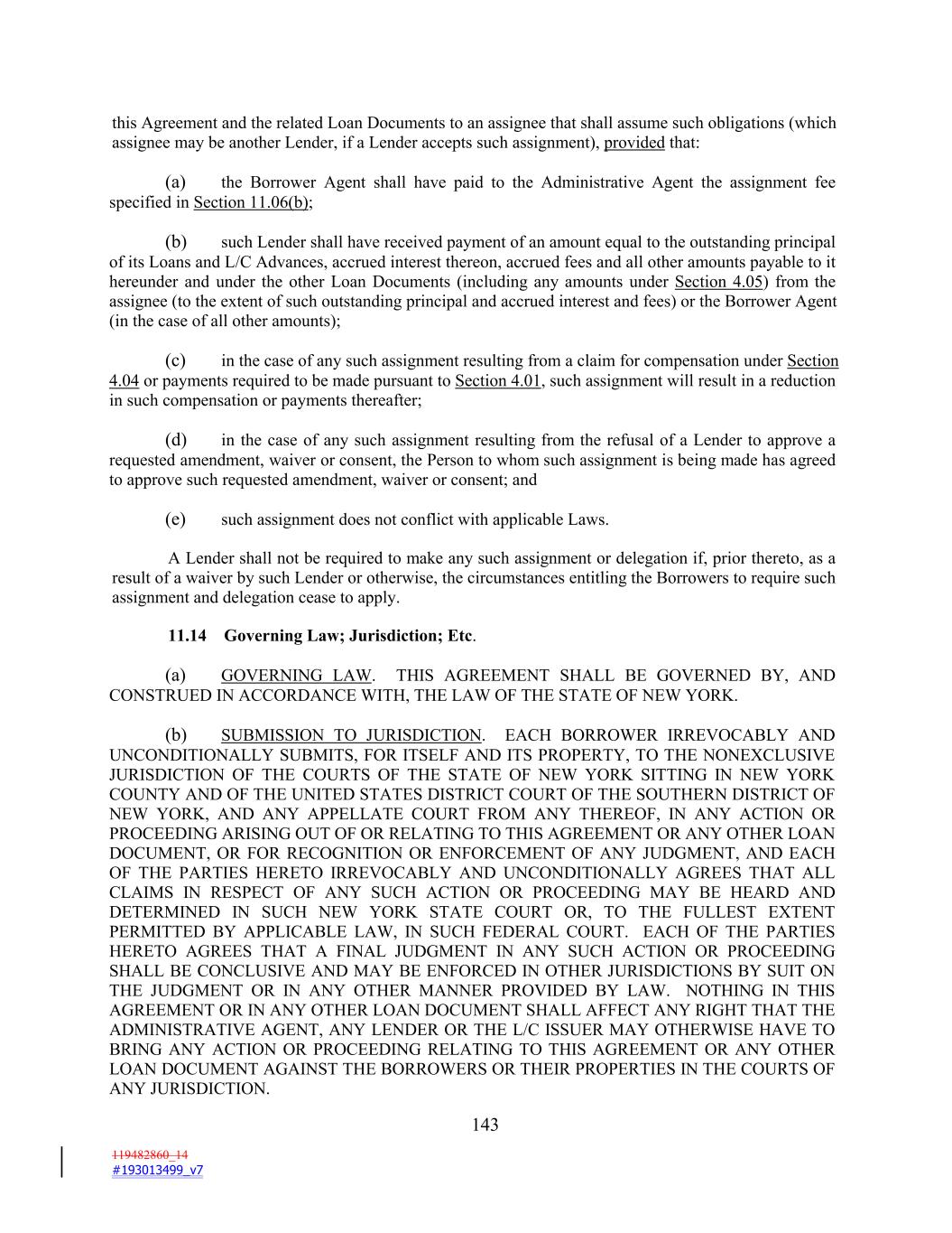this Agreement and the related Loan Documents to an assignee that shall assume such obligations (which assignee may be another Lender, if a Lender accepts such assignment), provided that: (a) the Borrower Agent shall have paid to the Administrative Agent the assignment fee specified in Section 11.06(b); (b) such Lender shall have received payment of an amount equal to the outstanding principal of its Loans and L/C Advances, accrued interest thereon, accrued fees and all other amounts payable to it hereunder and under the other Loan Documents (including any amounts under Section 4.05) from the assignee (to the extent of such outstanding principal and accrued interest and fees) or the Borrower Agent (in the case of all other amounts); (c) in the case of any such assignment resulting from a claim for compensation under Section 4.04 or payments required to be made pursuant to Section 4.01, such assignment will result in a reduction in such compensation or payments thereafter; (d) in the case of any such assignment resulting from the refusal of a Lender to approve a requested amendment, waiver or consent, the Person to whom such assignment is being made has agreed to approve such requested amendment, waiver or consent; and (e) such assignment does not conflict with applicable Laws. A Lender shall not be required to make any such assignment or delegation if, prior thereto, as a result of a waiver by such Lender or otherwise, the circumstances entitling the Borrowers to require such assignment and delegation cease to apply. 11.14 Governing Law; Jurisdiction; Etc. (a) GOVERNING LAW. THIS AGREEMENT SHALL BE GOVERNED BY, AND CONSTRUED IN ACCORDANCE WITH, THE LAW OF THE STATE OF NEW YORK. (b) SUBMISSION TO JURISDICTION. EACH BORROWER IRREVOCABLY AND UNCONDITIONALLY SUBMITS, FOR ITSELF AND ITS PROPERTY, TO THE NONEXCLUSIVE JURISDICTION OF THE COURTS OF THE STATE OF NEW YORK SITTING IN NEW YORK COUNTY AND OF THE UNITED STATES DISTRICT COURT OF THE SOUTHERN DISTRICT OF NEW YORK, AND ANY APPELLATE COURT FROM ANY THEREOF, IN ANY ACTION OR PROCEEDING ARISING OUT OF OR RELATING TO THIS AGREEMENT OR ANY OTHER LOAN DOCUMENT, OR FOR RECOGNITION OR ENFORCEMENT OF ANY JUDGMENT, AND EACH OF THE PARTIES HERETO IRREVOCABLY AND UNCONDITIONALLY AGREES THAT ALL CLAIMS IN RESPECT OF ANY SUCH ACTION OR PROCEEDING MAY BE HEARD AND DETERMINED IN SUCH NEW YORK STATE COURT OR, TO THE FULLEST EXTENT PERMITTED BY APPLICABLE LAW, IN SUCH FEDERAL COURT. EACH OF THE PARTIES HERETO AGREES THAT A FINAL JUDGMENT IN ANY SUCH ACTION OR PROCEEDING SHALL BE CONCLUSIVE AND MAY BE ENFORCED IN OTHER JURISDICTIONS BY SUIT ON THE JUDGMENT OR IN ANY OTHER MANNER PROVIDED BY LAW. NOTHING IN THIS AGREEMENT OR IN ANY OTHER LOAN DOCUMENT SHALL AFFECT ANY RIGHT THAT THE ADMINISTRATIVE AGENT, ANY LENDER OR THE L/C ISSUER MAY OTHERWISE HAVE TO BRING ANY ACTION OR PROCEEDING RELATING TO THIS AGREEMENT OR ANY OTHER LOAN DOCUMENT AGAINST THE BORROWERS OR THEIR PROPERTIES IN THE COURTS OF ANY JURISDICTION. 143 119482860_14 #193013499_v7
