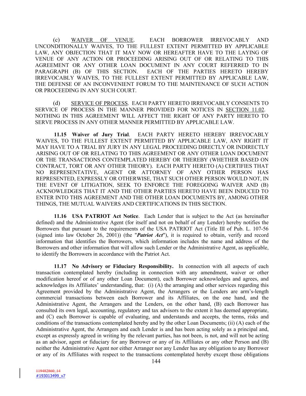 (c) WAIVER OF VENUE. EACH BORROWER IRREVOCABLY AND UNCONDITIONALLY WAIVES, TO THE FULLEST EXTENT PERMITTED BY APPLICABLE LAW, ANY OBJECTION THAT IT MAY NOW OR HEREAFTER HAVE TO THE LAYING OF VENUE OF ANY ACTION OR PROCEEDING ARISING OUT OF OR RELATING TO THIS AGREEMENT OR ANY OTHER LOAN DOCUMENT IN ANY COURT REFERRED TO IN PARAGRAPH (B) OF THIS SECTION. EACH OF THE PARTIES HERETO HEREBY IRREVOCABLY WAIVES, TO THE FULLEST EXTENT PERMITTED BY APPLICABLE LAW, THE DEFENSE OF AN INCONVENIENT FORUM TO THE MAINTENANCE OF SUCH ACTION OR PROCEEDING IN ANY SUCH COURT. (d) SERVICE OF PROCESS. EACH PARTY HERETO IRREVOCABLY CONSENTS TO SERVICE OF PROCESS IN THE MANNER PROVIDED FOR NOTICES IN SECTION 11.02. NOTHING IN THIS AGREEMENT WILL AFFECT THE RIGHT OF ANY PARTY HERETO TO SERVE PROCESS IN ANY OTHER MANNER PERMITTED BY APPLICABLE LAW. 11.15 Waiver of Jury Trial. EACH PARTY HERETO HEREBY IRREVOCABLY WAIVES, TO THE FULLEST EXTENT PERMITTED BY APPLICABLE LAW, ANY RIGHT IT MAY HAVE TO A TRIAL BY JURY IN ANY LEGAL PROCEEDING DIRECTLY OR INDIRECTLY ARISING OUT OF OR RELATING TO THIS AGREEMENT OR ANY OTHER LOAN DOCUMENT OR THE TRANSACTIONS CONTEMPLATED HEREBY OR THEREBY (WHETHER BASED ON CONTRACT, TORT OR ANY OTHER THEORY). EACH PARTY HERETO (A) CERTIFIES THAT NO REPRESENTATIVE, AGENT OR ATTORNEY OF ANY OTHER PERSON HAS REPRESENTED, EXPRESSLY OR OTHERWISE, THAT SUCH OTHER PERSON WOULD NOT, IN THE EVENT OF LITIGATION, SEEK TO ENFORCE THE FOREGOING WAIVER AND (B) ACKNOWLEDGES THAT IT AND THE OTHER PARTIES HERETO HAVE BEEN INDUCED TO ENTER INTO THIS AGREEMENT AND THE OTHER LOAN DOCUMENTS BY, AMONG OTHER THINGS, THE MUTUAL WAIVERS AND CERTIFICATIONS IN THIS SECTION. 11.16 USA PATRIOT Act Notice. Each Lender that is subject to the Act (as hereinafter defined) and the Administrative Agent (for itself and not on behalf of any Lender) hereby notifies the Borrowers that pursuant to the requirements of the USA PATRIOT Act (Title III of Pub. L. 107-56 (signed into law October 26, 2001)) (the "Patriot Act"), it is required to obtain, verify and record information that identifies the Borrowers, which information includes the name and address of the Borrowers and other information that will allow such Lender or the Administrative Agent, as applicable, to identify the Borrowers in accordance with the Patriot Act. 11.17 No Advisory or Fiduciary Responsibility. In connection with all aspects of each transaction contemplated hereby (including in connection with any amendment, waiver or other modification hereof or of any other Loan Document), each Borrower acknowledges and agrees, and acknowledges its Affiliates’ understanding, that: (i) (A) the arranging and other services regarding this Agreement provided by the Administrative Agent, the Arrangers or the Lenders are arm’s-length commercial transactions between each Borrower and its Affiliates, on the one hand, and the Administrative Agent, the Arrangers and the Lenders, on the other hand, (B) each Borrower has consulted its own legal, accounting, regulatory and tax advisors to the extent it has deemed appropriate, and (C) each Borrower is capable of evaluating, and understands and accepts, the terms, risks and conditions of the transactions contemplated hereby and by the other Loan Documents; (ii) (A) each of the Administrative Agent, the Arrangers and each Lender is and has been acting solely as a principal and, except as expressly agreed in writing by the relevant parties, has not been, is not, and will not be acting as an advisor, agent or fiduciary for any Borrower or any of its Affiliates or any other Person and (B) neither the Administrative Agent nor either Arranger nor any Lender has any obligation to any Borrower or any of its Affiliates with respect to the transactions contemplated hereby except those obligations 144 119482860_14 #193013499_v7