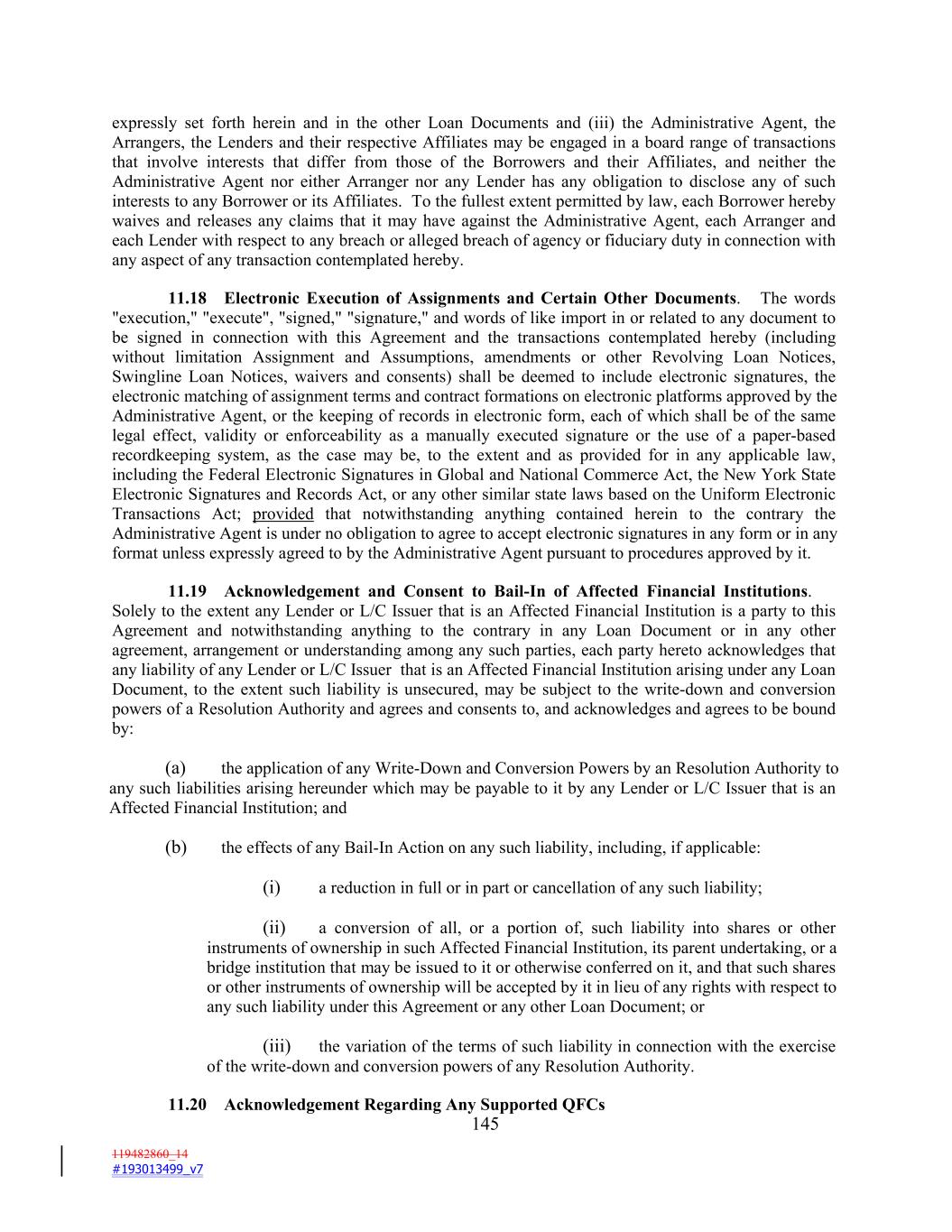 expressly set forth herein and in the other Loan Documents and (iii) the Administrative Agent, the Arrangers, the Lenders and their respective Affiliates may be engaged in a board range of transactions that involve interests that differ from those of the Borrowers and their Affiliates, and neither the Administrative Agent nor either Arranger nor any Lender has any obligation to disclose any of such interests to any Borrower or its Affiliates. To the fullest extent permitted by law, each Borrower hereby waives and releases any claims that it may have against the Administrative Agent, each Arranger and each Lender with respect to any breach or alleged breach of agency or fiduciary duty in connection with any aspect of any transaction contemplated hereby. 11.18 Electronic Execution of Assignments and Certain Other Documents. The words "execution," "execute", "signed," "signature," and words of like import in or related to any document to be signed in connection with this Agreement and the transactions contemplated hereby (including without limitation Assignment and Assumptions, amendments or other Revolving Loan Notices, Swingline Loan Notices, waivers and consents) shall be deemed to include electronic signatures, the electronic matching of assignment terms and contract formations on electronic platforms approved by the Administrative Agent, or the keeping of records in electronic form, each of which shall be of the same legal effect, validity or enforceability as a manually executed signature or the use of a paper-based recordkeeping system, as the case may be, to the extent and as provided for in any applicable law, including the Federal Electronic Signatures in Global and National Commerce Act, the New York State Electronic Signatures and Records Act, or any other similar state laws based on the Uniform Electronic Transactions Act; provided that notwithstanding anything contained herein to the contrary the Administrative Agent is under no obligation to agree to accept electronic signatures in any form or in any format unless expressly agreed to by the Administrative Agent pursuant to procedures approved by it. 11.19 Acknowledgement and Consent to Bail-In of Affected Financial Institutions. Solely to the extent any Lender or L/C Issuer that is an Affected Financial Institution is a party to this Agreement and notwithstanding anything to the contrary in any Loan Document or in any other agreement, arrangement or understanding among any such parties, each party hereto acknowledges that any liability of any Lender or L/C Issuer that is an Affected Financial Institution arising under any Loan Document, to the extent such liability is unsecured, may be subject to the write-down and conversion powers of a Resolution Authority and agrees and consents to, and acknowledges and agrees to be bound by: (a) the application of any Write-Down and Conversion Powers by an Resolution Authority to any such liabilities arising hereunder which may be payable to it by any Lender or L/C Issuer that is an Affected Financial Institution; and (b) the effects of any Bail-In Action on any such liability, including, if applicable: (i) a reduction in full or in part or cancellation of any such liability; (ii) a conversion of all, or a portion of, such liability into shares or other instruments of ownership in such Affected Financial Institution, its parent undertaking, or a bridge institution that may be issued to it or otherwise conferred on it, and that such shares or other instruments of ownership will be accepted by it in lieu of any rights with respect to any such liability under this Agreement or any other Loan Document; or (iii) the variation of the terms of such liability in connection with the exercise of the write-down and conversion powers of any Resolution Authority. 11.20 Acknowledgement Regarding Any Supported QFCs 145 119482860_14 #193013499_v7
