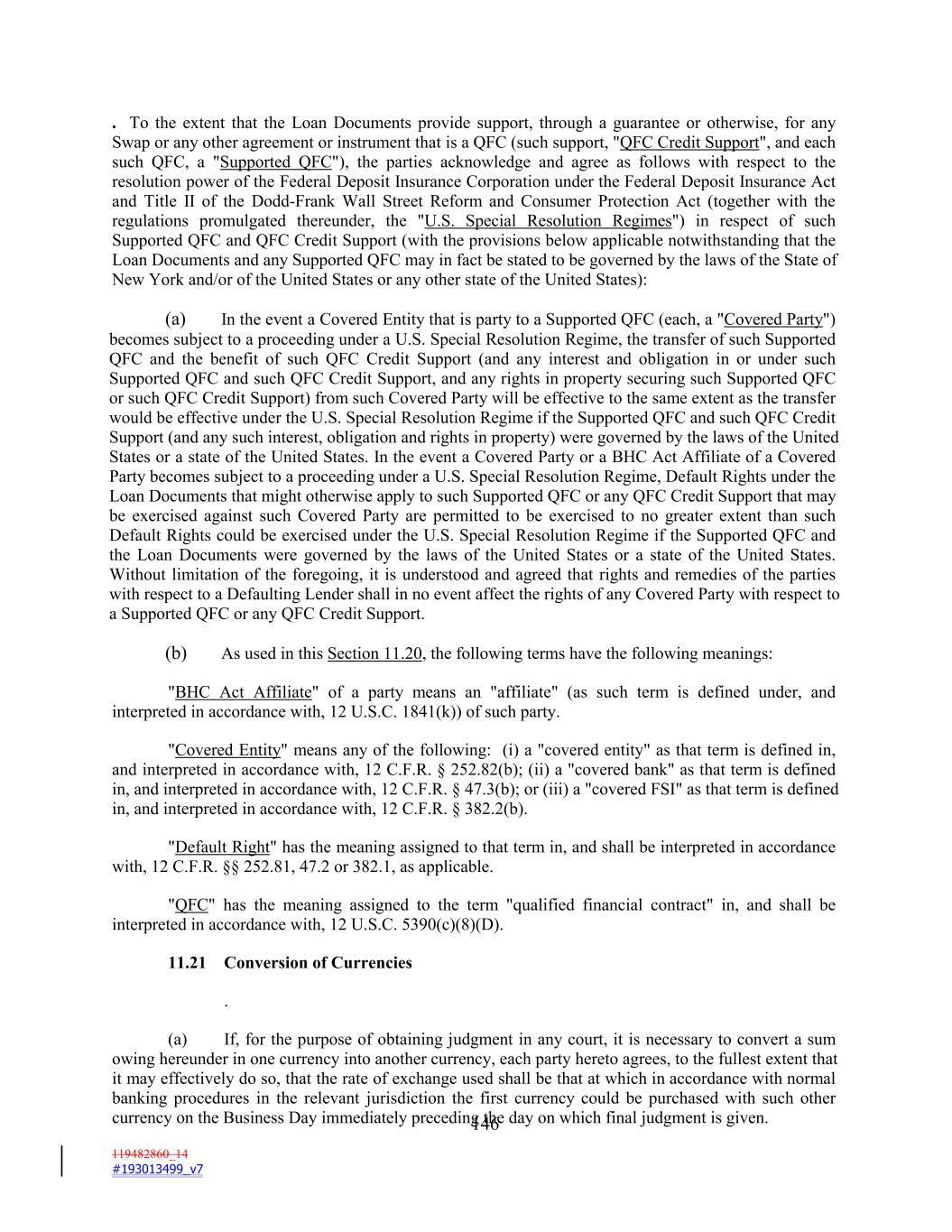. To the extent that the Loan Documents provide support, through a guarantee or otherwise, for any Swap or any other agreement or instrument that is a QFC (such support, "QFC Credit Support", and each such QFC, a "Supported QFC"), the parties acknowledge and agree as follows with respect to the resolution power of the Federal Deposit Insurance Corporation under the Federal Deposit Insurance Act and Title II of the Dodd-Frank Wall Street Reform and Consumer Protection Act (together with the regulations promulgated thereunder, the "U.S. Special Resolution Regimes") in respect of such Supported QFC and QFC Credit Support (with the provisions below applicable notwithstanding that the Loan Documents and any Supported QFC may in fact be stated to be governed by the laws of the State of New York and/or of the United States or any other state of the United States): (a) In the event a Covered Entity that is party to a Supported QFC (each, a "Covered Party") becomes subject to a proceeding under a U.S. Special Resolution Regime, the transfer of such Supported QFC and the benefit of such QFC Credit Support (and any interest and obligation in or under such Supported QFC and such QFC Credit Support, and any rights in property securing such Supported QFC or such QFC Credit Support) from such Covered Party will be effective to the same extent as the transfer would be effective under the U.S. Special Resolution Regime if the Supported QFC and such QFC Credit Support (and any such interest, obligation and rights in property) were governed by the laws of the United States or a state of the United States. In the event a Covered Party or a BHC Act Affiliate of a Covered Party becomes subject to a proceeding under a U.S. Special Resolution Regime, Default Rights under the Loan Documents that might otherwise apply to such Supported QFC or any QFC Credit Support that may be exercised against such Covered Party are permitted to be exercised to no greater extent than such Default Rights could be exercised under the U.S. Special Resolution Regime if the Supported QFC and the Loan Documents were governed by the laws of the United States or a state of the United States. Without limitation of the foregoing, it is understood and agreed that rights and remedies of the parties with respect to a Defaulting Lender shall in no event affect the rights of any Covered Party with respect to a Supported QFC or any QFC Credit Support. (b) As used in this Section 11.20, the following terms have the following meanings: "BHC Act Affiliate" of a party means an "affiliate" (as such term is defined under, and interpreted in accordance with, 12 U.S.C. 1841(k)) of such party. "Covered Entity" means any of the following: (i) a "covered entity" as that term is defined in, and interpreted in accordance with, 12 C.F.R. § 252.82(b); (ii) a "covered bank" as that term is defined in, and interpreted in accordance with, 12 C.F.R. § 47.3(b); or (iii) a "covered FSI" as that term is defined in, and interpreted in accordance with, 12 C.F.R. § 382.2(b). "Default Right" has the meaning assigned to that term in, and shall be interpreted in accordance with, 12 C.F.R. §§ 252.81, 47.2 or 382.1, as applicable. "QFC" has the meaning assigned to the term "qualified financial contract" in, and shall be interpreted in accordance with, 12 U.S.C. 5390(c)(8)(D). 11.21 Conversion of Currencies . (a) If, for the purpose of obtaining judgment in any court, it is necessary to convert a sum owing hereunder in one currency into another currency, each party hereto agrees, to the fullest extent that it may effectively do so, that the rate of exchange used shall be that at which in accordance with normal banking procedures in the relevant jurisdiction the first currency could be purchased with such other currency on the Business Day immediately preceding the day on which final judgment is given.146 119482860_14 #193013499_v7