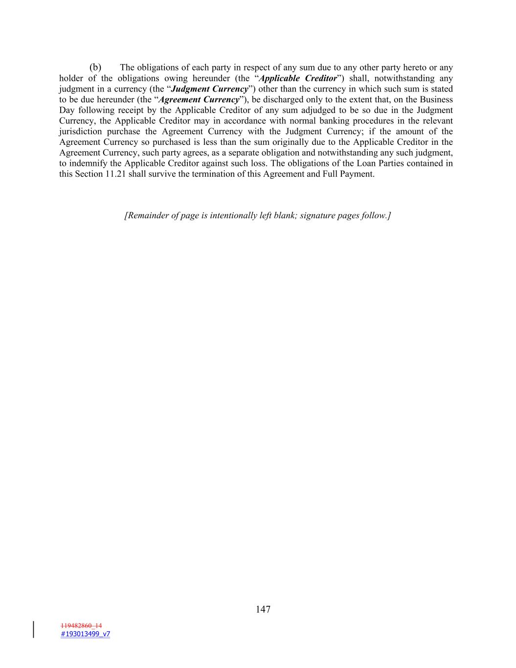 (b) The obligations of each party in respect of any sum due to any other party hereto or any holder of the obligations owing hereunder (the “Applicable Creditor”) shall, notwithstanding any judgment in a currency (the “Judgment Currency”) other than the currency in which such sum is stated to be due hereunder (the “Agreement Currency”), be discharged only to the extent that, on the Business Day following receipt by the Applicable Creditor of any sum adjudged to be so due in the Judgment Currency, the Applicable Creditor may in accordance with normal banking procedures in the relevant jurisdiction purchase the Agreement Currency with the Judgment Currency; if the amount of the Agreement Currency so purchased is less than the sum originally due to the Applicable Creditor in the Agreement Currency, such party agrees, as a separate obligation and notwithstanding any such judgment, to indemnify the Applicable Creditor against such loss. The obligations of the Loan Parties contained in this Section 11.21 shall survive the termination of this Agreement and Full Payment. [Remainder of page is intentionally left blank; signature pages follow.] 147 119482860_14 #193013499_v7