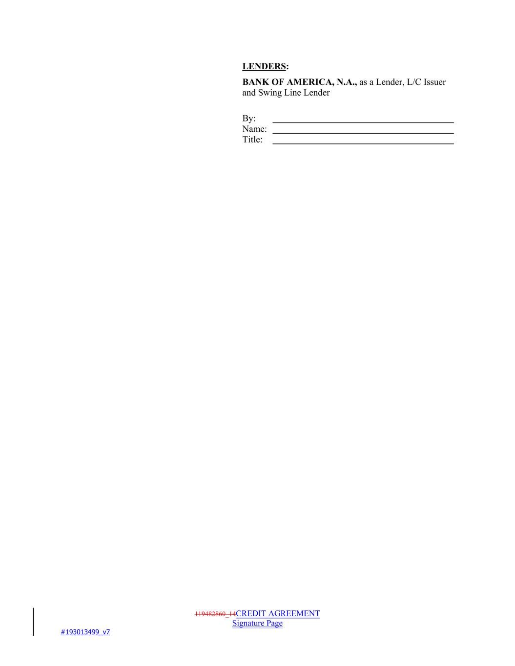 LENDERS: BANK OF AMERICA, N.A., as a Lender, L/C Issuer and Swing Line Lender By: Name: Title: 119482860_14CREDIT AGREEMENT Signature Page #193013499_v7