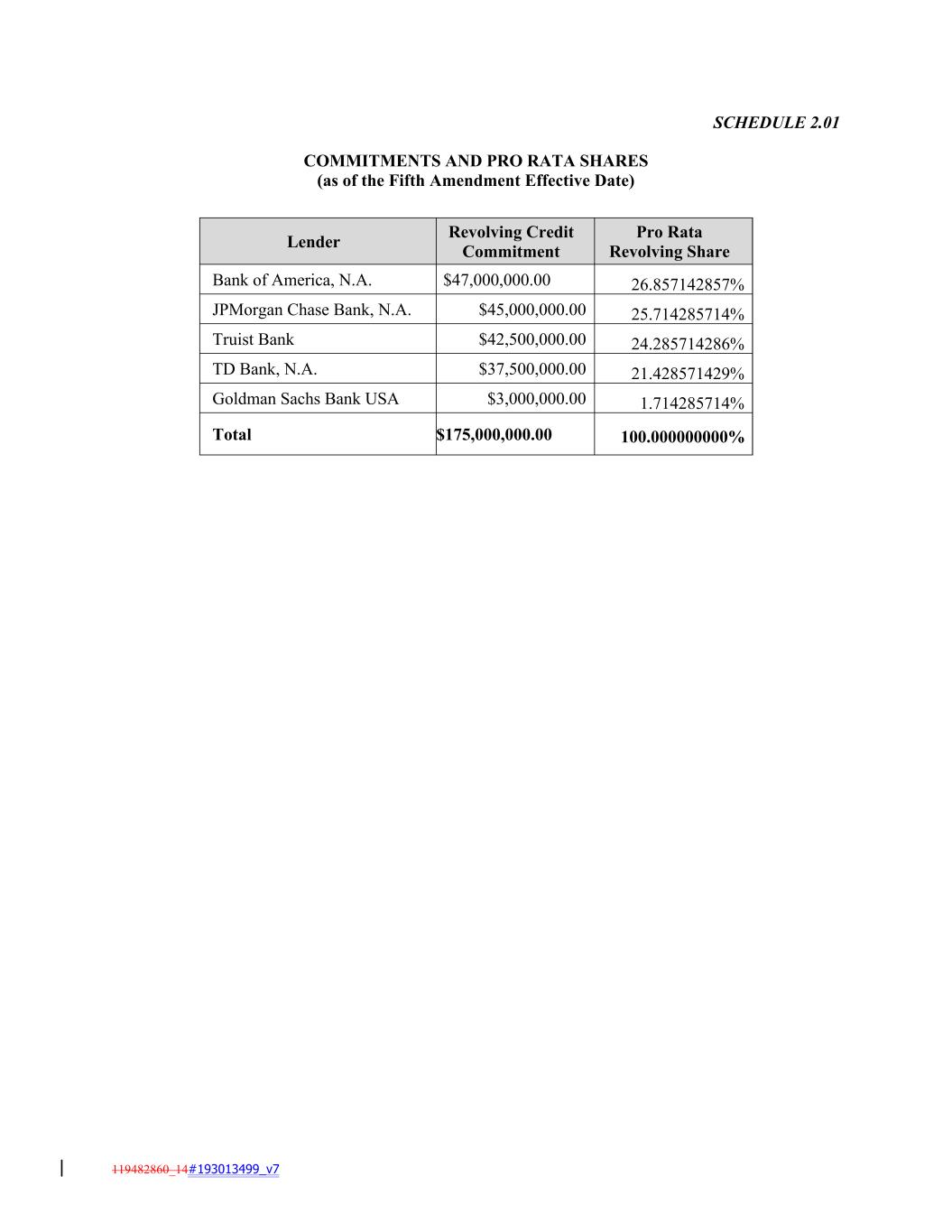 119482860_14#193013499_v7 Truist Bank Bank of America, N.A. $42,500,000.00 Lender 24.285714286% $47,000,000.00 TD Bank, N.A. 26.857142857% $37,500,000.00 Revolving Credit Commitment 21.428571429% SCHEDULE 2.01 COMMITMENTS AND PRO RATA SHARES (as of the Fifth Amendment Effective Date) Goldman Sachs Bank USA JPMorgan Chase Bank, N.A. $3,000,000.00 Pro Rata Revolving Share 1.714285714% $45,000,000.00 Total 25.714285714% $175,000,000.00 100.000000000%