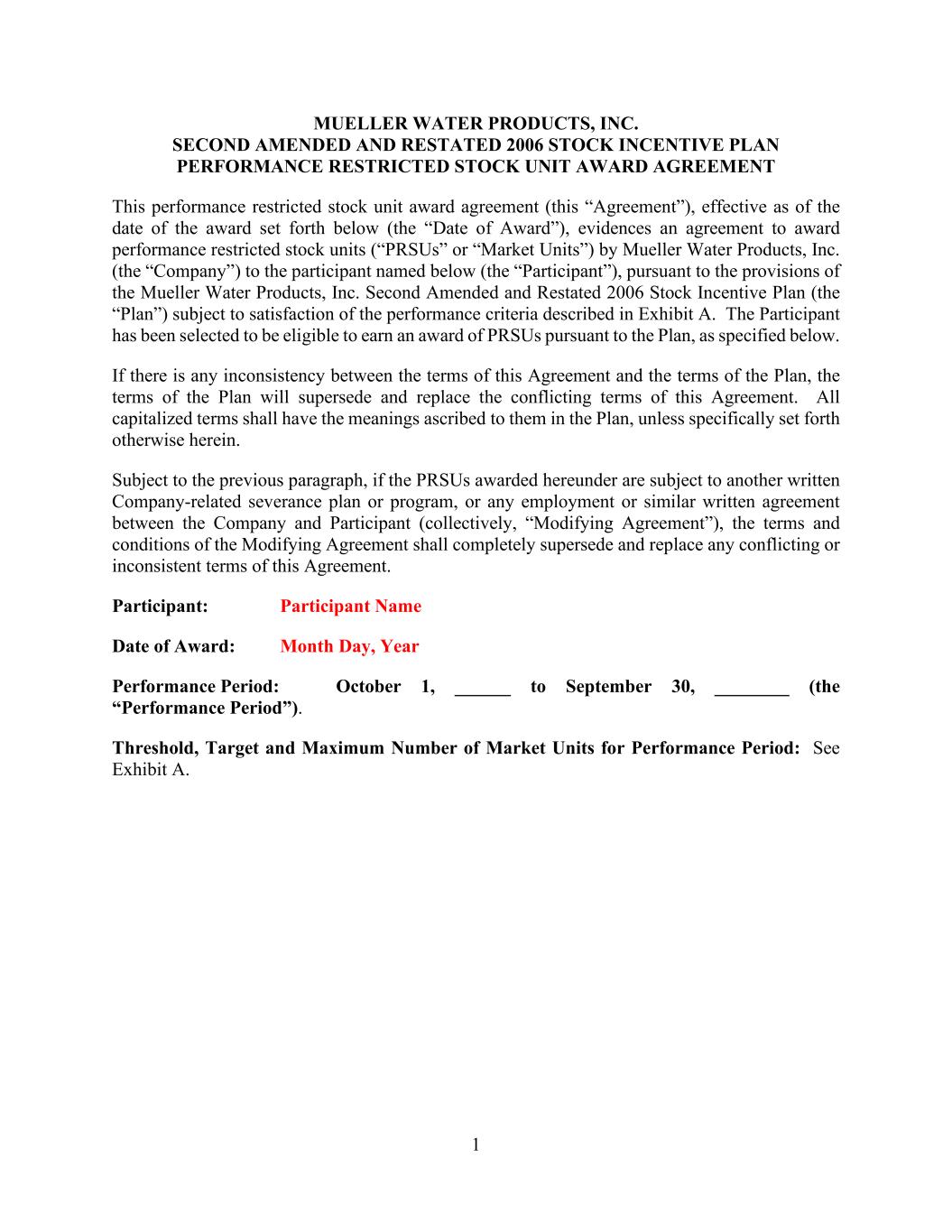 1 MUELLER WATER PRODUCTS, INC. SECOND AMENDED AND RESTATED 2006 STOCK INCENTIVE PLAN PERFORMANCE RESTRICTED STOCK UNIT AWARD AGREEMENT This performance restricted stock unit award agreement (this “Agreement”), effective as of the date of the award set forth below (the “Date of Award”), evidences an agreement to award performance restricted stock units (“PRSUs” or “Market Units”) by Mueller Water Products, Inc. (the “Company”) to the participant named below (the “Participant”), pursuant to the provisions of the Mueller Water Products, Inc. Second Amended and Restated 2006 Stock Incentive Plan (the “Plan”) subject to satisfaction of the performance criteria described in Exhibit A. The Participant has been selected to be eligible to earn an award of PRSUs pursuant to the Plan, as specified below. If there is any inconsistency between the terms of this Agreement and the terms of the Plan, the terms of the Plan will supersede and replace the conflicting terms of this Agreement. All capitalized terms shall have the meanings ascribed to them in the Plan, unless specifically set forth otherwise herein. Subject to the previous paragraph, if the PRSUs awarded hereunder are subject to another written Company-related severance plan or program, or any employment or similar written agreement between the Company and Participant (collectively, “Modifying Agreement”), the terms and conditions of the Modifying Agreement shall completely supersede and replace any conflicting or inconsistent terms of this Agreement. Participant: Participant Name Date of Award: Month Day, Year Performance Period: October 1, ______ to September 30, ________ (the “Performance Period”). Threshold, Target and Maximum Number of Market Units for Performance Period: See Exhibit A.