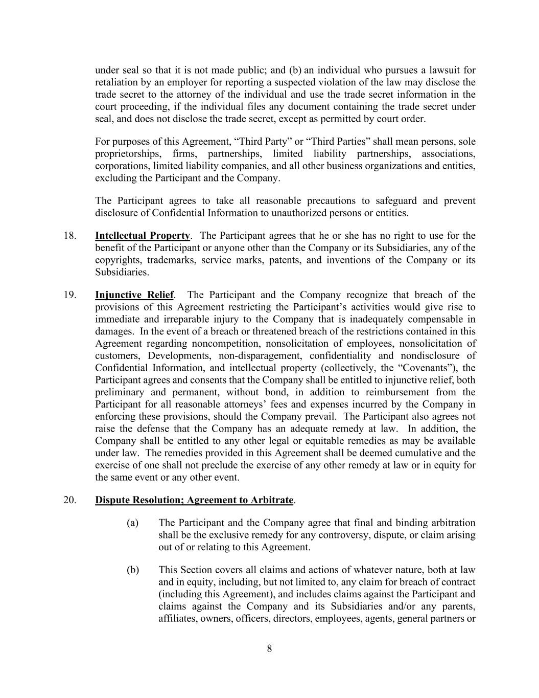 8 under seal so that it is not made public; and (b) an individual who pursues a lawsuit for retaliation by an employer for reporting a suspected violation of the law may disclose the trade secret to the attorney of the individual and use the trade secret information in the court proceeding, if the individual files any document containing the trade secret under seal, and does not disclose the trade secret, except as permitted by court order. For purposes of this Agreement, “Third Party” or “Third Parties” shall mean persons, sole proprietorships, firms, partnerships, limited liability partnerships, associations, corporations, limited liability companies, and all other business organizations and entities, excluding the Participant and the Company. The Participant agrees to take all reasonable precautions to safeguard and prevent disclosure of Confidential Information to unauthorized persons or entities. 18. Intellectual Property. The Participant agrees that he or she has no right to use for the benefit of the Participant or anyone other than the Company or its Subsidiaries, any of the copyrights, trademarks, service marks, patents, and inventions of the Company or its Subsidiaries. 19. Injunctive Relief. The Participant and the Company recognize that breach of the provisions of this Agreement restricting the Participant’s activities would give rise to immediate and irreparable injury to the Company that is inadequately compensable in damages. In the event of a breach or threatened breach of the restrictions contained in this Agreement regarding noncompetition, nonsolicitation of employees, nonsolicitation of customers, Developments, non-disparagement, confidentiality and nondisclosure of Confidential Information, and intellectual property (collectively, the “Covenants”), the Participant agrees and consents that the Company shall be entitled to injunctive relief, both preliminary and permanent, without bond, in addition to reimbursement from the Participant for all reasonable attorneys’ fees and expenses incurred by the Company in enforcing these provisions, should the Company prevail. The Participant also agrees not raise the defense that the Company has an adequate remedy at law. In addition, the Company shall be entitled to any other legal or equitable remedies as may be available under law. The remedies provided in this Agreement shall be deemed cumulative and the exercise of one shall not preclude the exercise of any other remedy at law or in equity for the same event or any other event. 20. Dispute Resolution; Agreement to Arbitrate. (a) The Participant and the Company agree that final and binding arbitration shall be the exclusive remedy for any controversy, dispute, or claim arising out of or relating to this Agreement. (b) This Section covers all claims and actions of whatever nature, both at law and in equity, including, but not limited to, any claim for breach of contract (including this Agreement), and includes claims against the Participant and claims against the Company and its Subsidiaries and/or any parents, affiliates, owners, officers, directors, employees, agents, general partners or