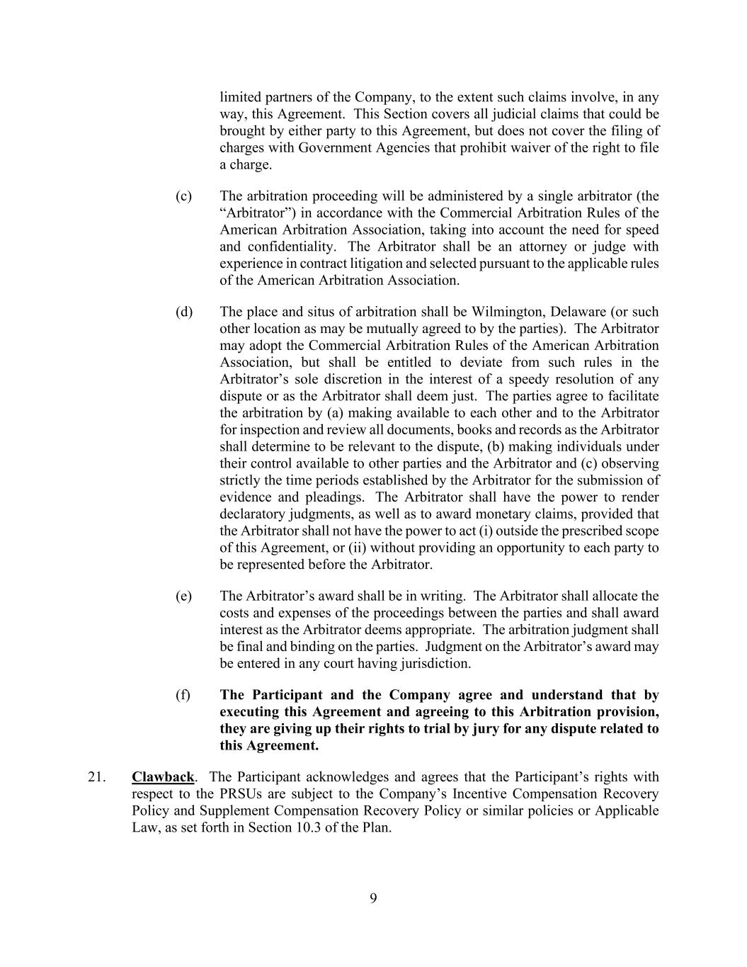 9 limited partners of the Company, to the extent such claims involve, in any way, this Agreement. This Section covers all judicial claims that could be brought by either party to this Agreement, but does not cover the filing of charges with Government Agencies that prohibit waiver of the right to file a charge. (c) The arbitration proceeding will be administered by a single arbitrator (the “Arbitrator”) in accordance with the Commercial Arbitration Rules of the American Arbitration Association, taking into account the need for speed and confidentiality. The Arbitrator shall be an attorney or judge with experience in contract litigation and selected pursuant to the applicable rules of the American Arbitration Association. (d) The place and situs of arbitration shall be Wilmington, Delaware (or such other location as may be mutually agreed to by the parties). The Arbitrator may adopt the Commercial Arbitration Rules of the American Arbitration Association, but shall be entitled to deviate from such rules in the Arbitrator’s sole discretion in the interest of a speedy resolution of any dispute or as the Arbitrator shall deem just. The parties agree to facilitate the arbitration by (a) making available to each other and to the Arbitrator for inspection and review all documents, books and records as the Arbitrator shall determine to be relevant to the dispute, (b) making individuals under their control available to other parties and the Arbitrator and (c) observing strictly the time periods established by the Arbitrator for the submission of evidence and pleadings. The Arbitrator shall have the power to render declaratory judgments, as well as to award monetary claims, provided that the Arbitrator shall not have the power to act (i) outside the prescribed scope of this Agreement, or (ii) without providing an opportunity to each party to be represented before the Arbitrator. (e) The Arbitrator’s award shall be in writing. The Arbitrator shall allocate the costs and expenses of the proceedings between the parties and shall award interest as the Arbitrator deems appropriate. The arbitration judgment shall be final and binding on the parties. Judgment on the Arbitrator’s award may be entered in any court having jurisdiction. (f) The Participant and the Company agree and understand that by executing this Agreement and agreeing to this Arbitration provision, they are giving up their rights to trial by jury for any dispute related to this Agreement. 21. Clawback. The Participant acknowledges and agrees that the Participant’s rights with respect to the PRSUs are subject to the Company’s Incentive Compensation Recovery Policy and Supplement Compensation Recovery Policy or similar policies or Applicable Law, as set forth in Section 10.3 of the Plan.
