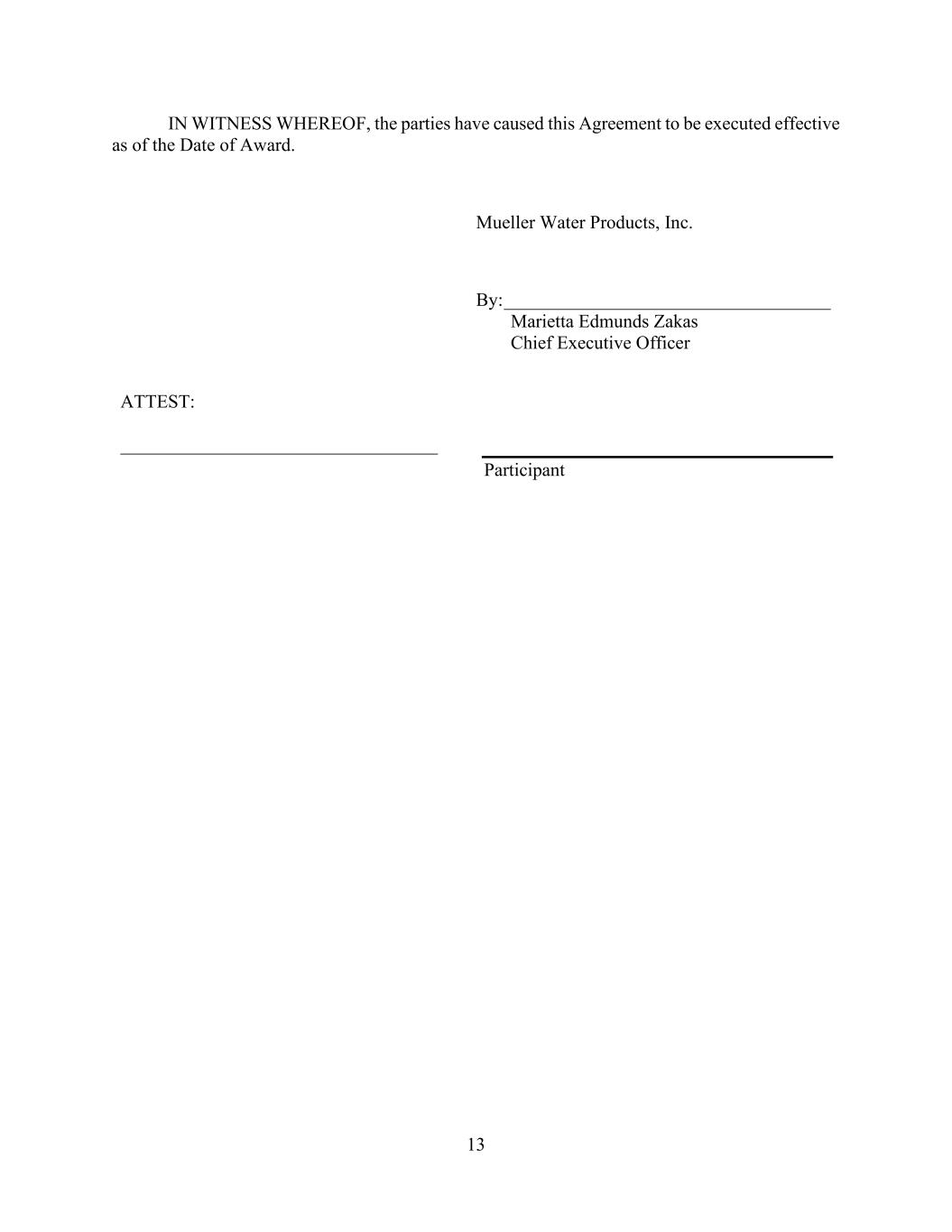 13 IN WITNESS WHEREOF, the parties have caused this Agreement to be executed effective as of the Date of Award. Mueller Water Products, Inc. By: ___________________________________ Marietta Edmunds Zakas Chief Executive Officer ATTEST: __________________________________ Participant