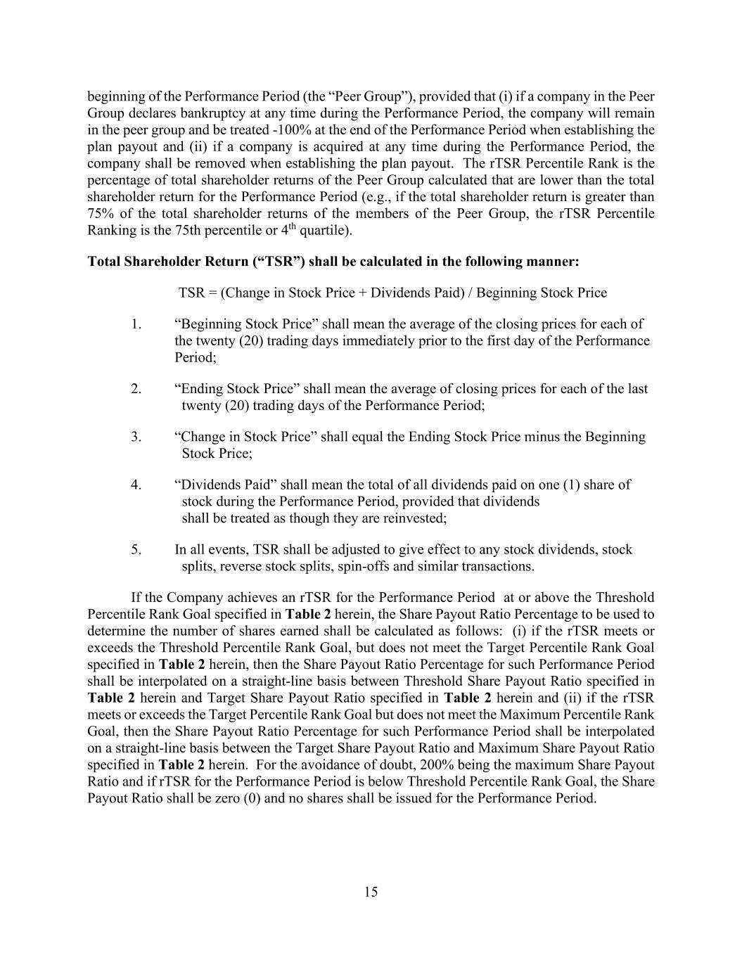 15 beginning of the Performance Period (the “Peer Group”), provided that (i) if a company in the Peer Group declares bankruptcy at any time during the Performance Period, the company will remain in the peer group and be treated -100% at the end of the Performance Period when establishing the plan payout and (ii) if a company is acquired at any time during the Performance Period, the company shall be removed when establishing the plan payout. The rTSR Percentile Rank is the percentage of total shareholder returns of the Peer Group calculated that are lower than the total shareholder return for the Performance Period (e.g., if the total shareholder return is greater than 75% of the total shareholder returns of the members of the Peer Group, the rTSR Percentile Ranking is the 75th percentile or 4th quartile). Total Shareholder Return (“TSR”) shall be calculated in the following manner: TSR = (Change in Stock Price + Dividends Paid) / Beginning Stock Price 1. “Beginning Stock Price” shall mean the average of the closing prices for each of the twenty (20) trading days immediately prior to the first day of the Performance Period; 2. “Ending Stock Price” shall mean the average of closing prices for each of the last twenty (20) trading days of the Performance Period; 3. “Change in Stock Price” shall equal the Ending Stock Price minus the Beginning Stock Price; 4. “Dividends Paid” shall mean the total of all dividends paid on one (1) share of stock during the Performance Period, provided that dividends shall be treated as though they are reinvested; 5. In all events, TSR shall be adjusted to give effect to any stock dividends, stock splits, reverse stock splits, spin-offs and similar transactions. If the Company achieves an rTSR for the Performance Period at or above the Threshold Percentile Rank Goal specified in Table 2 herein, the Share Payout Ratio Percentage to be used to determine the number of shares earned shall be calculated as follows: (i) if the rTSR meets or exceeds the Threshold Percentile Rank Goal, but does not meet the Target Percentile Rank Goal specified in Table 2 herein, then the Share Payout Ratio Percentage for such Performance Period shall be interpolated on a straight-line basis between Threshold Share Payout Ratio specified in Table 2 herein and Target Share Payout Ratio specified in Table 2 herein and (ii) if the rTSR meets or exceeds the Target Percentile Rank Goal but does not meet the Maximum Percentile Rank Goal, then the Share Payout Ratio Percentage for such Performance Period shall be interpolated on a straight-line basis between the Target Share Payout Ratio and Maximum Share Payout Ratio specified in Table 2 herein. For the avoidance of doubt, 200% being the maximum Share Payout Ratio and if rTSR for the Performance Period is below Threshold Percentile Rank Goal, the Share Payout Ratio shall be zero (0) and no shares shall be issued for the Performance Period.