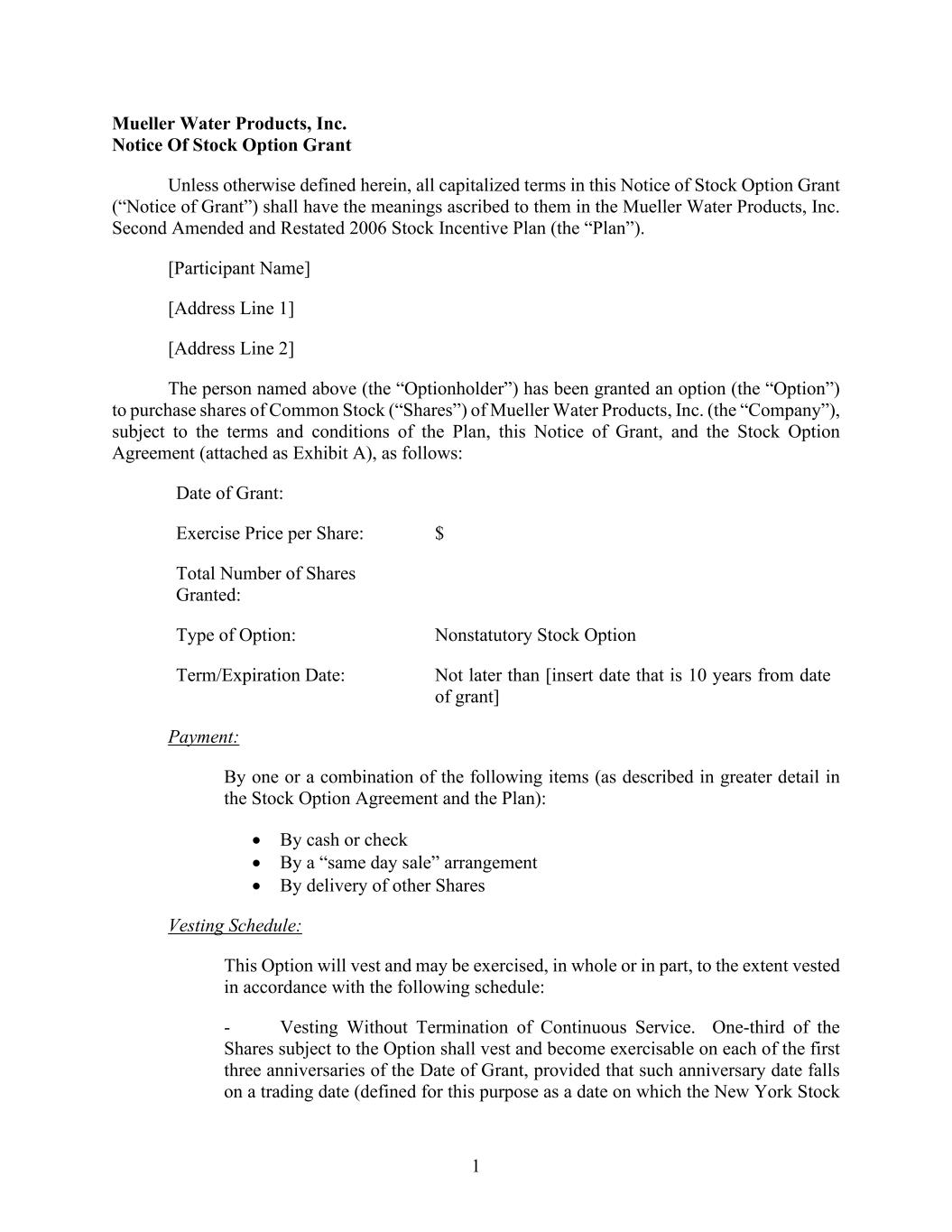1 Mueller Water Products, Inc. Notice Of Stock Option Grant Unless otherwise defined herein, all capitalized terms in this Notice of Stock Option Grant (“Notice of Grant”) shall have the meanings ascribed to them in the Mueller Water Products, Inc. Second Amended and Restated 2006 Stock Incentive Plan (the “Plan”). [Participant Name] [Address Line 1] [Address Line 2] The person named above (the “Optionholder”) has been granted an option (the “Option”) to purchase shares of Common Stock (“Shares”) of Mueller Water Products, Inc. (the “Company”), subject to the terms and conditions of the Plan, this Notice of Grant, and the Stock Option Agreement (attached as Exhibit A), as follows: Date of Grant: Exercise Price per Share: $ Total Number of Shares Granted: Type of Option: Nonstatutory Stock Option Term/Expiration Date: Not later than [insert date that is 10 years from date of grant] Payment: By one or a combination of the following items (as described in greater detail in the Stock Option Agreement and the Plan): • By cash or check • By a “same day sale” arrangement • By delivery of other Shares Vesting Schedule: This Option will vest and may be exercised, in whole or in part, to the extent vested in accordance with the following schedule: - Vesting Without Termination of Continuous Service. One-third of the Shares subject to the Option shall vest and become exercisable on each of the first three anniversaries of the Date of Grant, provided that such anniversary date falls on a trading date (defined for this purpose as a date on which the New York Stock