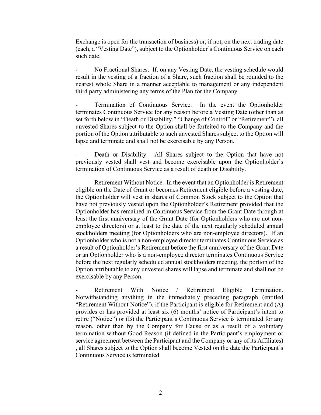 2 Exchange is open for the transaction of business) or, if not, on the next trading date (each, a “Vesting Date”), subject to the Optionholder’s Continuous Service on each such date. - No Fractional Shares. If, on any Vesting Date, the vesting schedule would result in the vesting of a fraction of a Share, such fraction shall be rounded to the nearest whole Share in a manner acceptable to management or any independent third party administering any terms of the Plan for the Company. - Termination of Continuous Service. In the event the Optionholder terminates Continuous Service for any reason before a Vesting Date (other than as set forth below in “Death or Disability.” “Change of Control” or “Retirement”), all unvested Shares subject to the Option shall be forfeited to the Company and the portion of the Option attributable to such unvested Shares subject to the Option will lapse and terminate and shall not be exercisable by any Person. - Death or Disability. All Shares subject to the Option that have not previously vested shall vest and become exercisable upon the Optionholder’s termination of Continuous Service as a result of death or Disability. - Retirement Without Notice. In the event that an Optionholder is Retirement eligible on the Date of Grant or becomes Retirement eligible before a vesting date, the Optionholder will vest in shares of Common Stock subject to the Option that have not previously vested upon the Optionholder’s Retirement provided that the Optionholder has remained in Continuous Service from the Grant Date through at least the first anniversary of the Grant Date (for Optionholders who are not non- employee directors) or at least to the date of the next regularly scheduled annual stockholders meeting (for Optionholders who are non-employee directors). If an Optionholder who is not a non-employee director terminates Continuous Service as a result of Optionholder’s Retirement before the first anniversary of the Grant Date or an Optionholder who is a non-employee director terminates Continuous Service before the next regularly scheduled annual stockholders meeting, the portion of the Option attributable to any unvested shares will lapse and terminate and shall not be exercisable by any Person. - Retirement With Notice / Retirement Eligible Termination. Notwithstanding anything in the immediately preceding paragraph (entitled “Retirement Without Notice”), if the Participant is eligible for Retirement and (A) provides or has provided at least six (6) months’ notice of Participant’s intent to retire (“Notice”) or (B) the Participant’s Continuous Service is terminated for any reason, other than by the Company for Cause or as a result of a voluntary termination without Good Reason (if defined in the Participant’s employment or service agreement between the Participant and the Company or any of its Affiliates) , all Shares subject to the Option shall become Vested on the date the Participant’s Continuous Service is terminated.