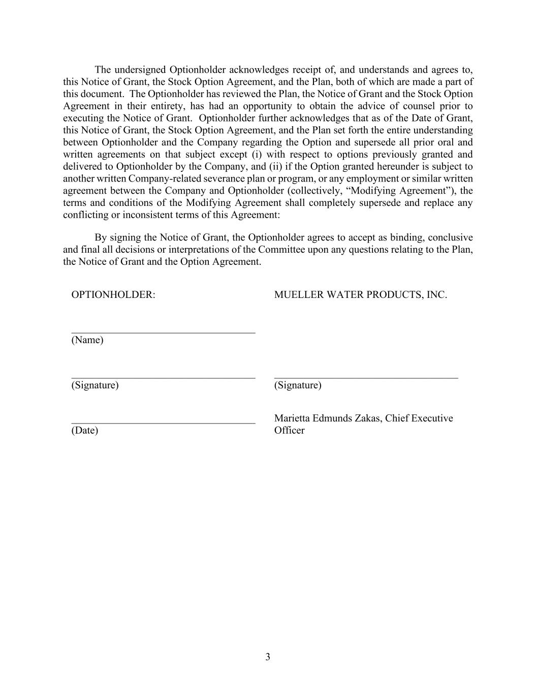 3 The undersigned Optionholder acknowledges receipt of, and understands and agrees to, this Notice of Grant, the Stock Option Agreement, and the Plan, both of which are made a part of this document. The Optionholder has reviewed the Plan, the Notice of Grant and the Stock Option Agreement in their entirety, has had an opportunity to obtain the advice of counsel prior to executing the Notice of Grant. Optionholder further acknowledges that as of the Date of Grant, this Notice of Grant, the Stock Option Agreement, and the Plan set forth the entire understanding between Optionholder and the Company regarding the Option and supersede all prior oral and written agreements on that subject except (i) with respect to options previously granted and delivered to Optionholder by the Company, and (ii) if the Option granted hereunder is subject to another written Company-related severance plan or program, or any employment or similar written agreement between the Company and Optionholder (collectively, “Modifying Agreement”), the terms and conditions of the Modifying Agreement shall completely supersede and replace any conflicting or inconsistent terms of this Agreement: By signing the Notice of Grant, the Optionholder agrees to accept as binding, conclusive and final all decisions or interpretations of the Committee upon any questions relating to the Plan, the Notice of Grant and the Option Agreement. OPTIONHOLDER: MUELLER WATER PRODUCTS, INC. ___________________________________ (Name) ___________________________________ (Signature) ___________________________________ (Signature) ___________________________________ (Date) Marietta Edmunds Zakas, Chief Executive Officer