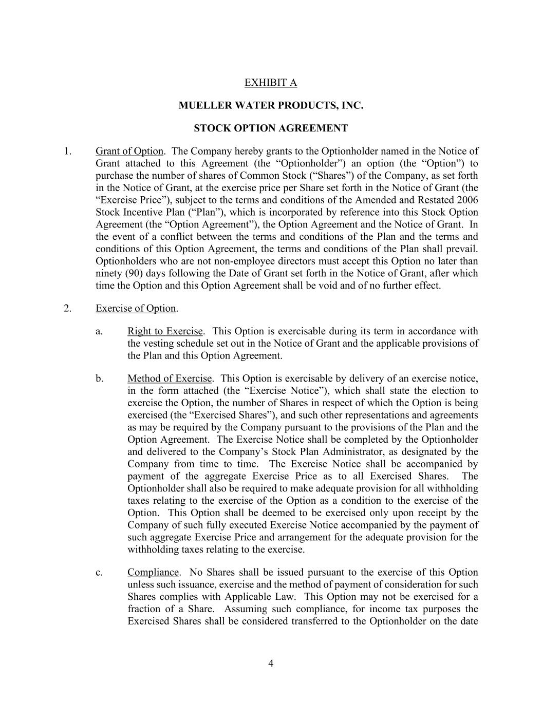 4 EXHIBIT A MUELLER WATER PRODUCTS, INC. STOCK OPTION AGREEMENT 1. Grant of Option. The Company hereby grants to the Optionholder named in the Notice of Grant attached to this Agreement (the “Optionholder”) an option (the “Option”) to purchase the number of shares of Common Stock (“Shares”) of the Company, as set forth in the Notice of Grant, at the exercise price per Share set forth in the Notice of Grant (the “Exercise Price”), subject to the terms and conditions of the Amended and Restated 2006 Stock Incentive Plan (“Plan”), which is incorporated by reference into this Stock Option Agreement (the “Option Agreement”), the Option Agreement and the Notice of Grant. In the event of a conflict between the terms and conditions of the Plan and the terms and conditions of this Option Agreement, the terms and conditions of the Plan shall prevail. Optionholders who are not non-employee directors must accept this Option no later than ninety (90) days following the Date of Grant set forth in the Notice of Grant, after which time the Option and this Option Agreement shall be void and of no further effect. 2. Exercise of Option. a. Right to Exercise. This Option is exercisable during its term in accordance with the vesting schedule set out in the Notice of Grant and the applicable provisions of the Plan and this Option Agreement. b. Method of Exercise. This Option is exercisable by delivery of an exercise notice, in the form attached (the “Exercise Notice”), which shall state the election to exercise the Option, the number of Shares in respect of which the Option is being exercised (the “Exercised Shares”), and such other representations and agreements as may be required by the Company pursuant to the provisions of the Plan and the Option Agreement. The Exercise Notice shall be completed by the Optionholder and delivered to the Company’s Stock Plan Administrator, as designated by the Company from time to time. The Exercise Notice shall be accompanied by payment of the aggregate Exercise Price as to all Exercised Shares. The Optionholder shall also be required to make adequate provision for all withholding taxes relating to the exercise of the Option as a condition to the exercise of the Option. This Option shall be deemed to be exercised only upon receipt by the Company of such fully executed Exercise Notice accompanied by the payment of such aggregate Exercise Price and arrangement for the adequate provision for the withholding taxes relating to the exercise. c. Compliance. No Shares shall be issued pursuant to the exercise of this Option unless such issuance, exercise and the method of payment of consideration for such Shares complies with Applicable Law. This Option may not be exercised for a fraction of a Share. Assuming such compliance, for income tax purposes the Exercised Shares shall be considered transferred to the Optionholder on the date