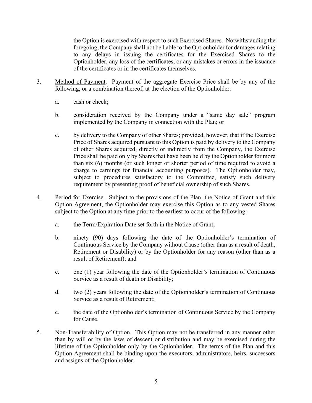 5 the Option is exercised with respect to such Exercised Shares. Notwithstanding the foregoing, the Company shall not be liable to the Optionholder for damages relating to any delays in issuing the certificates for the Exercised Shares to the Optionholder, any loss of the certificates, or any mistakes or errors in the issuance of the certificates or in the certificates themselves. 3. Method of Payment. Payment of the aggregate Exercise Price shall be by any of the following, or a combination thereof, at the election of the Optionholder: a. cash or check; b. consideration received by the Company under a “same day sale” program implemented by the Company in connection with the Plan; or c. by delivery to the Company of other Shares; provided, however, that if the Exercise Price of Shares acquired pursuant to this Option is paid by delivery to the Company of other Shares acquired, directly or indirectly from the Company, the Exercise Price shall be paid only by Shares that have been held by the Optionholder for more than six (6) months (or such longer or shorter period of time required to avoid a charge to earnings for financial accounting purposes). The Optionholder may, subject to procedures satisfactory to the Committee, satisfy such delivery requirement by presenting proof of beneficial ownership of such Shares. 4. Period for Exercise. Subject to the provisions of the Plan, the Notice of Grant and this Option Agreement, the Optionholder may exercise this Option as to any vested Shares subject to the Option at any time prior to the earliest to occur of the following: a. the Term/Expiration Date set forth in the Notice of Grant; b. ninety (90) days following the date of the Optionholder’s termination of Continuous Service by the Company without Cause (other than as a result of death, Retirement or Disability) or by the Optionholder for any reason (other than as a result of Retirement); and c. one (1) year following the date of the Optionholder’s termination of Continuous Service as a result of death or Disability; d. two (2) years following the date of the Optionholder’s termination of Continuous Service as a result of Retirement; e. the date of the Optionholder’s termination of Continuous Service by the Company for Cause. 5. Non-Transferability of Option. This Option may not be transferred in any manner other than by will or by the laws of descent or distribution and may be exercised during the lifetime of the Optionholder only by the Optionholder. The terms of the Plan and this Option Agreement shall be binding upon the executors, administrators, heirs, successors and assigns of the Optionholder.