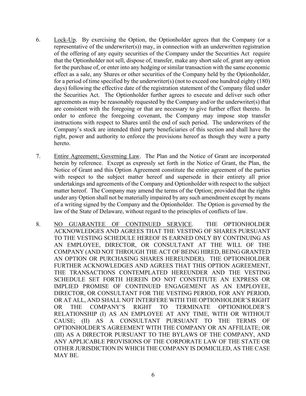 6 6. Lock-Up. By exercising the Option, the Optionholder agrees that the Company (or a representative of the underwriter(s)) may, in connection with an underwritten registration of the offering of any equity securities of the Company under the Securities Act require that the Optionholder not sell, dispose of, transfer, make any short sale of, grant any option for the purchase of, or enter into any hedging or similar transaction with the same economic effect as a sale, any Shares or other securities of the Company held by the Optionholder, for a period of time specified by the underwriter(s) (not to exceed one hundred eighty (180) days) following the effective date of the registration statement of the Company filed under the Securities Act. The Optionholder further agrees to execute and deliver such other agreements as may be reasonably requested by the Company and/or the underwriter(s) that are consistent with the foregoing or that are necessary to give further effect thereto. In order to enforce the foregoing covenant, the Company may impose stop transfer instructions with respect to Shares until the end of such period. The underwriters of the Company’s stock are intended third party beneficiaries of this section and shall have the right, power and authority to enforce the provisions hereof as though they were a party hereto. 7. Entire Agreement; Governing Law. The Plan and the Notice of Grant are incorporated herein by reference. Except as expressly set forth in the Notice of Grant, the Plan, the Notice of Grant and this Option Agreement constitute the entire agreement of the parties with respect to the subject matter hereof and supersede in their entirety all prior undertakings and agreements of the Company and Optionholder with respect to the subject matter hereof. The Company may amend the terms of the Option; provided that the rights under any Option shall not be materially impaired by any such amendment except by means of a writing signed by the Company and the Optionholder. The Option is governed by the law of the State of Delaware, without regard to the principles of conflicts of law. 8. NO GUARANTEE OF CONTINUED SERVICE. THE OPTIONHOLDER ACKNOWLEDGES AND AGREES THAT THE VESTING OF SHARES PURSUANT TO THE VESTING SCHEDULE HEREOF IS EARNED ONLY BY CONTINUING AS AN EMPLOYEE, DIRECTOR, OR CONSULTANT AT THE WILL OF THE COMPANY (AND NOT THROUGH THE ACT OF BEING HIRED, BEING GRANTED AN OPTION OR PURCHASING SHARES HEREUNDER). THE OPTIONHOLDER FURTHER ACKNOWLEDGES AND AGREES THAT THIS OPTION AGREEMENT, THE TRANSACTIONS CONTEMPLATED HEREUNDER AND THE VESTING SCHEDULE SET FORTH HEREIN DO NOT CONSTITUTE AN EXPRESS OR IMPLIED PROMISE OF CONTINUED ENGAGEMENT AS AN EMPLOYEE, DIRECTOR, OR CONSULTANT FOR THE VESTING PERIOD, FOR ANY PERIOD, OR AT ALL, AND SHALL NOT INTERFERE WITH THE OPTIONHOLDER’S RIGHT OR THE COMPANY’S RIGHT TO TERMINATE OPTIONHOLDER’S RELATIONSHIP (I) AS AN EMPLOYEE AT ANY TIME, WITH OR WITHOUT CAUSE; (II) AS A CONSULTANT PURSUANT TO THE TERMS OF OPTIONHOLDER’S AGREEMENT WITH THE COMPANY OR AN AFFILIATE; OR (III) AS A DIRECTOR PURSUANT TO THE BYLAWS OF THE COMPANY, AND ANY APPLICABLE PROVISIONS OF THE CORPORATE LAW OF THE STATE OR OTHER JURISDICTION IN WHICH THE COMPANY IS DOMICILED, AS THE CASE MAY BE.