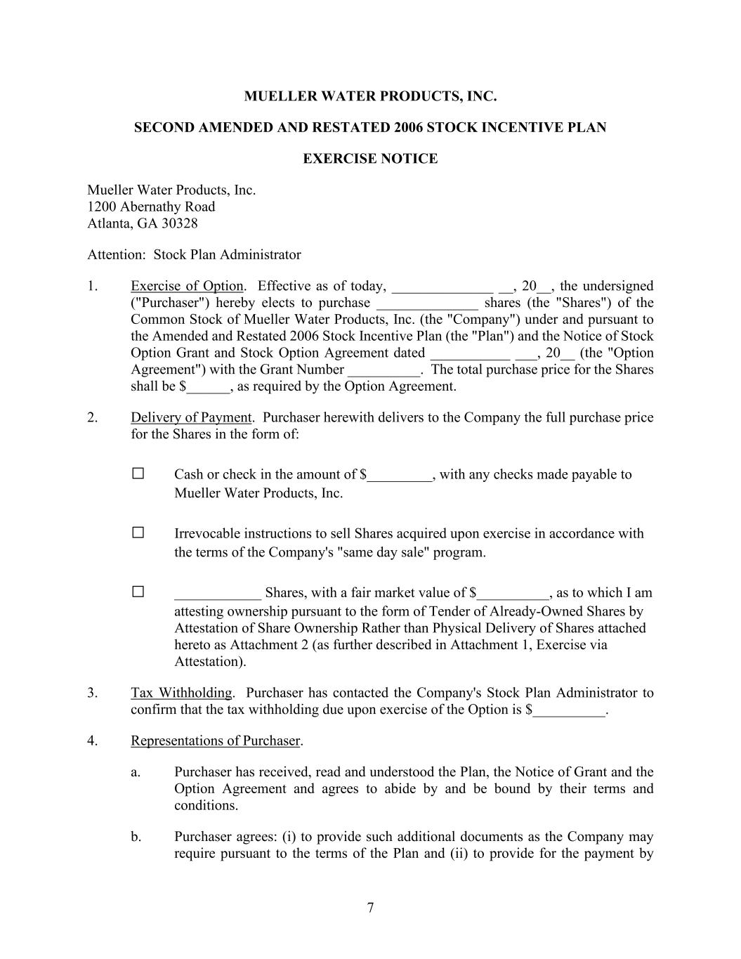 7 MUELLER WATER PRODUCTS, INC. SECOND AMENDED AND RESTATED 2006 STOCK INCENTIVE PLAN EXERCISE NOTICE Mueller Water Products, Inc. 1200 Abernathy Road Atlanta, GA 30328 Attention: Stock Plan Administrator 1. Exercise of Option. Effective as of today, ______________ __, 20__, the undersigned ("Purchaser") hereby elects to purchase ______________ shares (the "Shares") of the Common Stock of Mueller Water Products, Inc. (the "Company") under and pursuant to the Amended and Restated 2006 Stock Incentive Plan (the "Plan") and the Notice of Stock Option Grant and Stock Option Agreement dated ___________ ___, 20__ (the "Option Agreement") with the Grant Number __________. The total purchase price for the Shares shall be $______, as required by the Option Agreement. 2. Delivery of Payment. Purchaser herewith delivers to the Company the full purchase price for the Shares in the form of: □ Cash or check in the amount of $_________, with any checks made payable to Mueller Water Products, Inc. □ Irrevocable instructions to sell Shares acquired upon exercise in accordance with the terms of the Company's "same day sale" program. □ ____________ Shares, with a fair market value of $__________, as to which I am attesting ownership pursuant to the form of Tender of Already-Owned Shares by Attestation of Share Ownership Rather than Physical Delivery of Shares attached hereto as Attachment 2 (as further described in Attachment 1, Exercise via Attestation). 3. Tax Withholding. Purchaser has contacted the Company's Stock Plan Administrator to confirm that the tax withholding due upon exercise of the Option is $__________. 4. Representations of Purchaser. a. Purchaser has received, read and understood the Plan, the Notice of Grant and the Option Agreement and agrees to abide by and be bound by their terms and conditions. b. Purchaser agrees: (i) to provide such additional documents as the Company may require pursuant to the terms of the Plan and (ii) to provide for the payment by